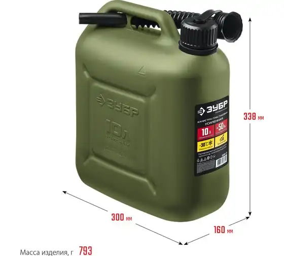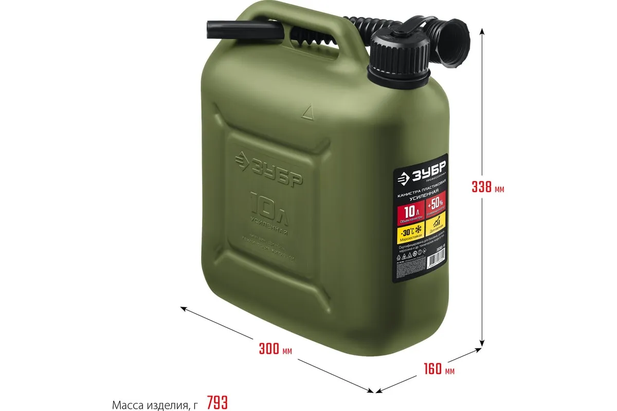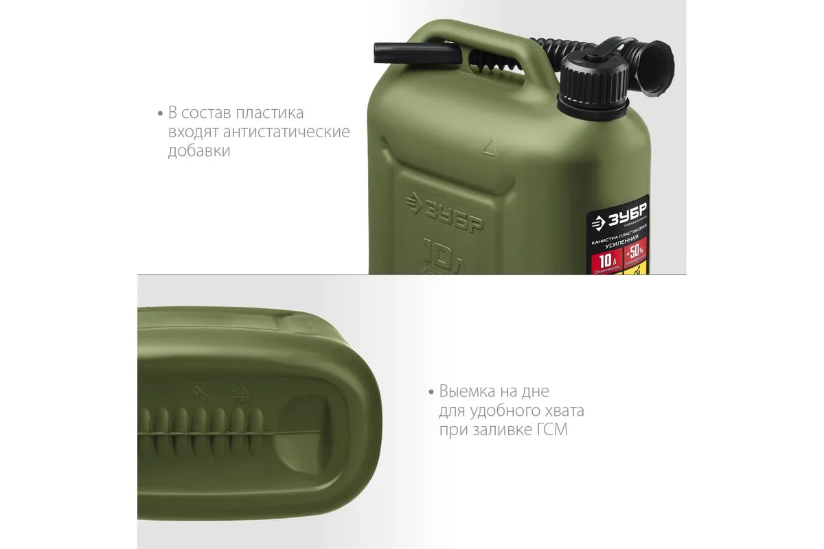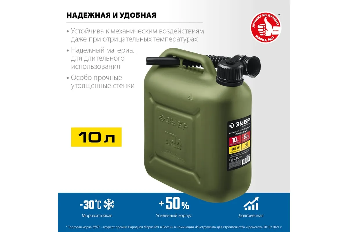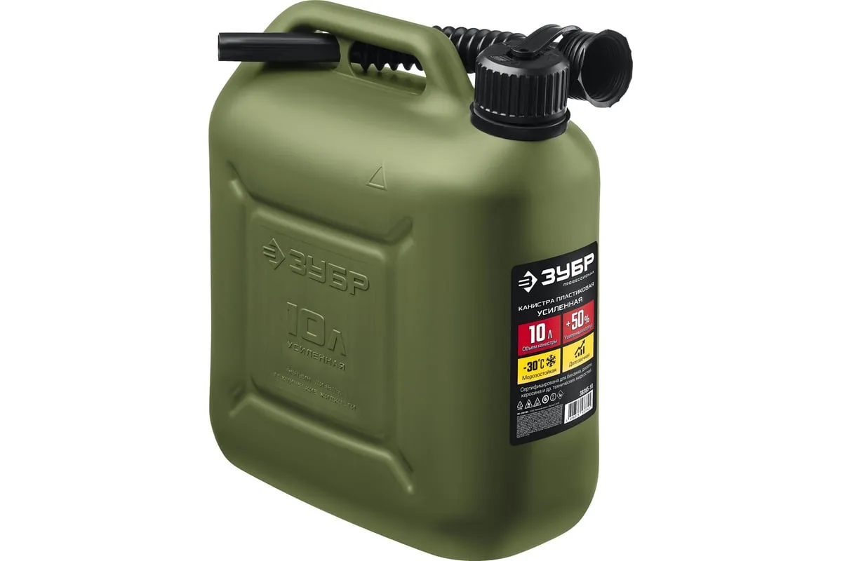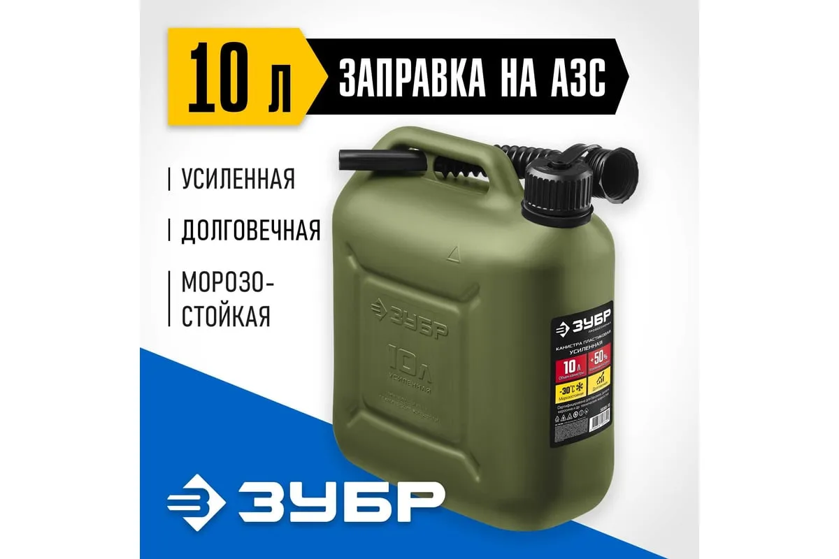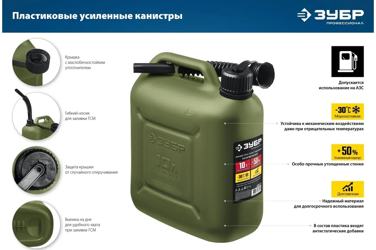 Пластиковая усиленная канистра ЗУБР Профессионал 10 л 38365-10 - легкая герметичная емкость для транспортировки технических жидкостей. Применяется для транспортировки и хранения ГСМ.