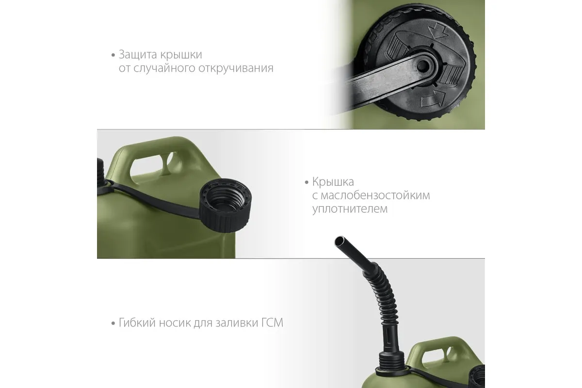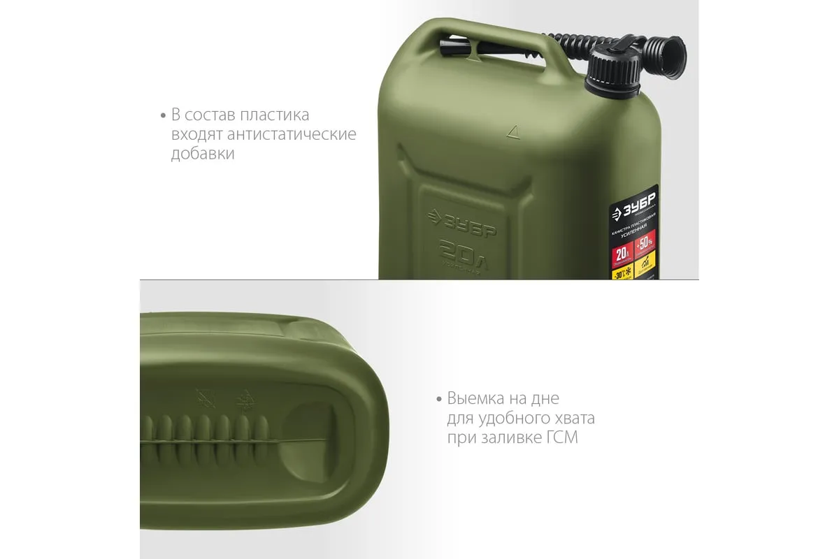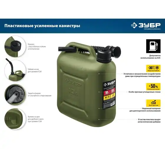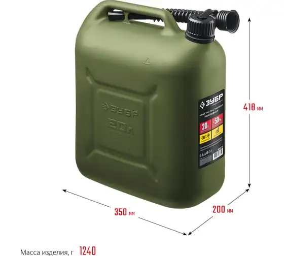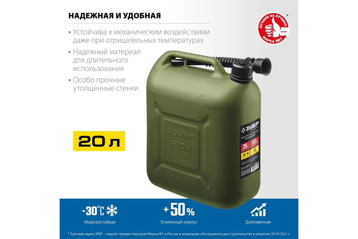 Пластиковая усиленная канистра ЗУБР Профессионал 20 л 38365-20 - легкая герметичная емкость для транспортировки технических жидкостей. Применяется для транспортировки и хранения ГСМ.