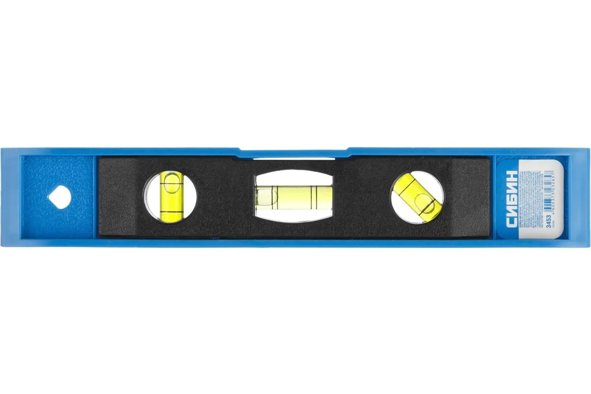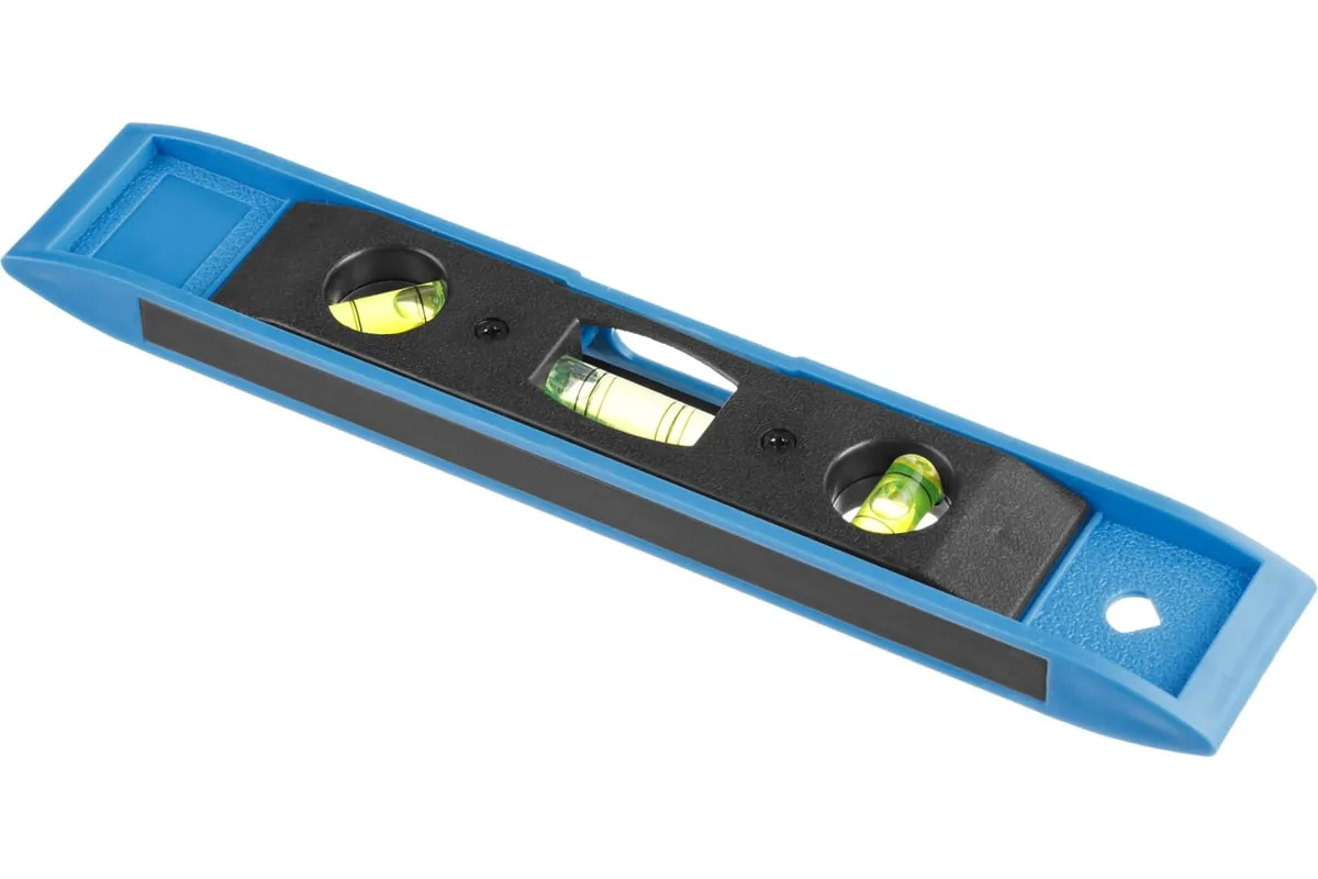 Пластмассовый уровень МИНИ с магнитом 230мм СИБИН 3453 - удобный в работе, компактный измерительный инструмент для контроля отклонений различных поверхностей от горизонтальности, вертикальности и угла 45 градусов.