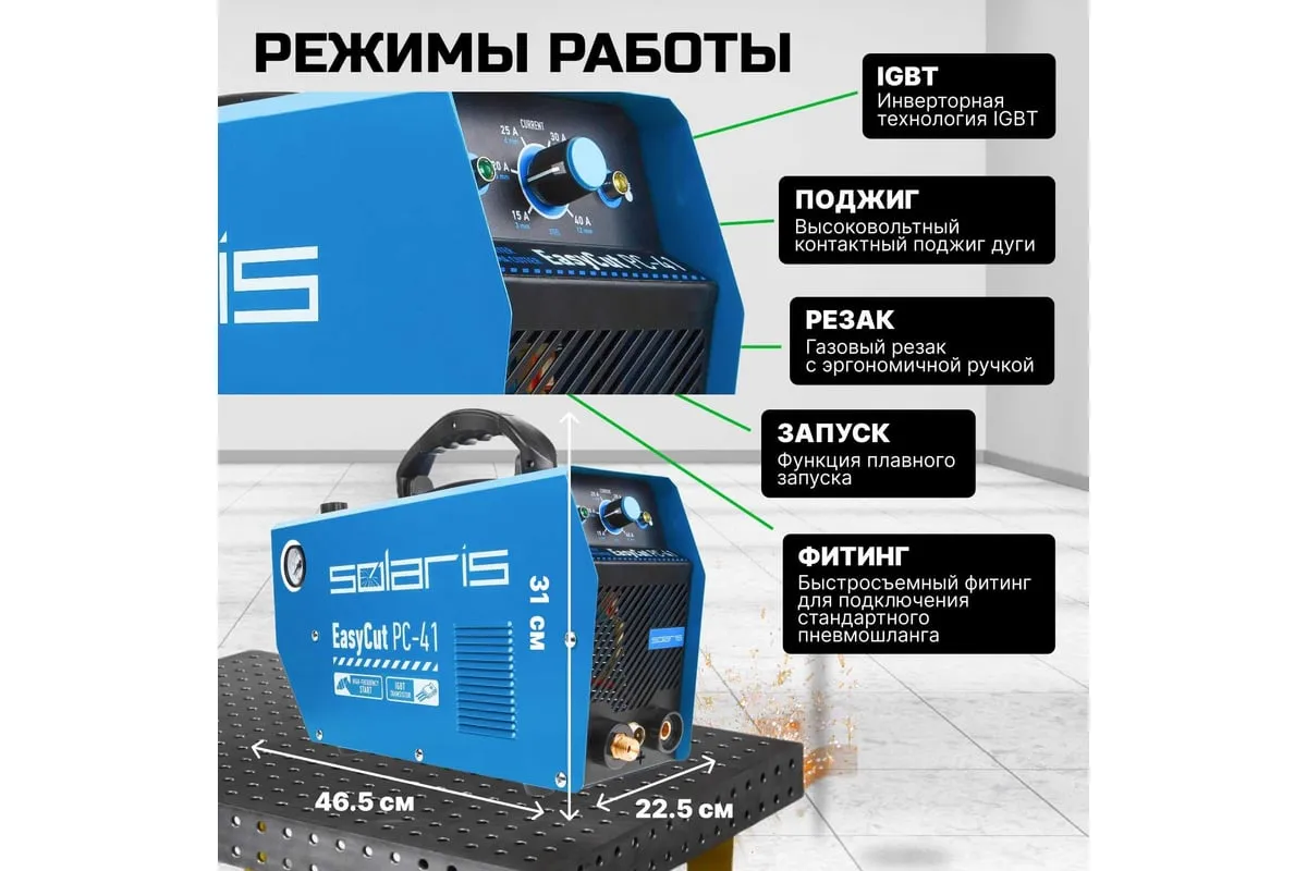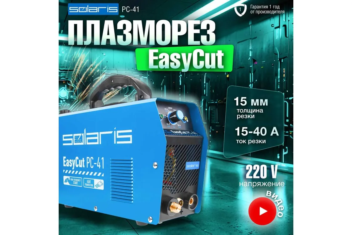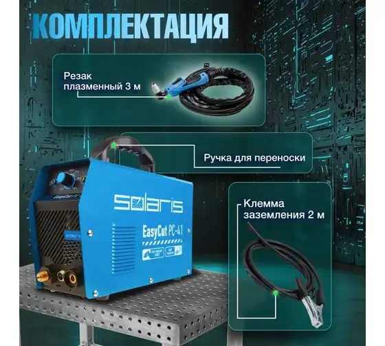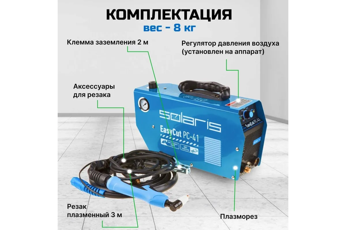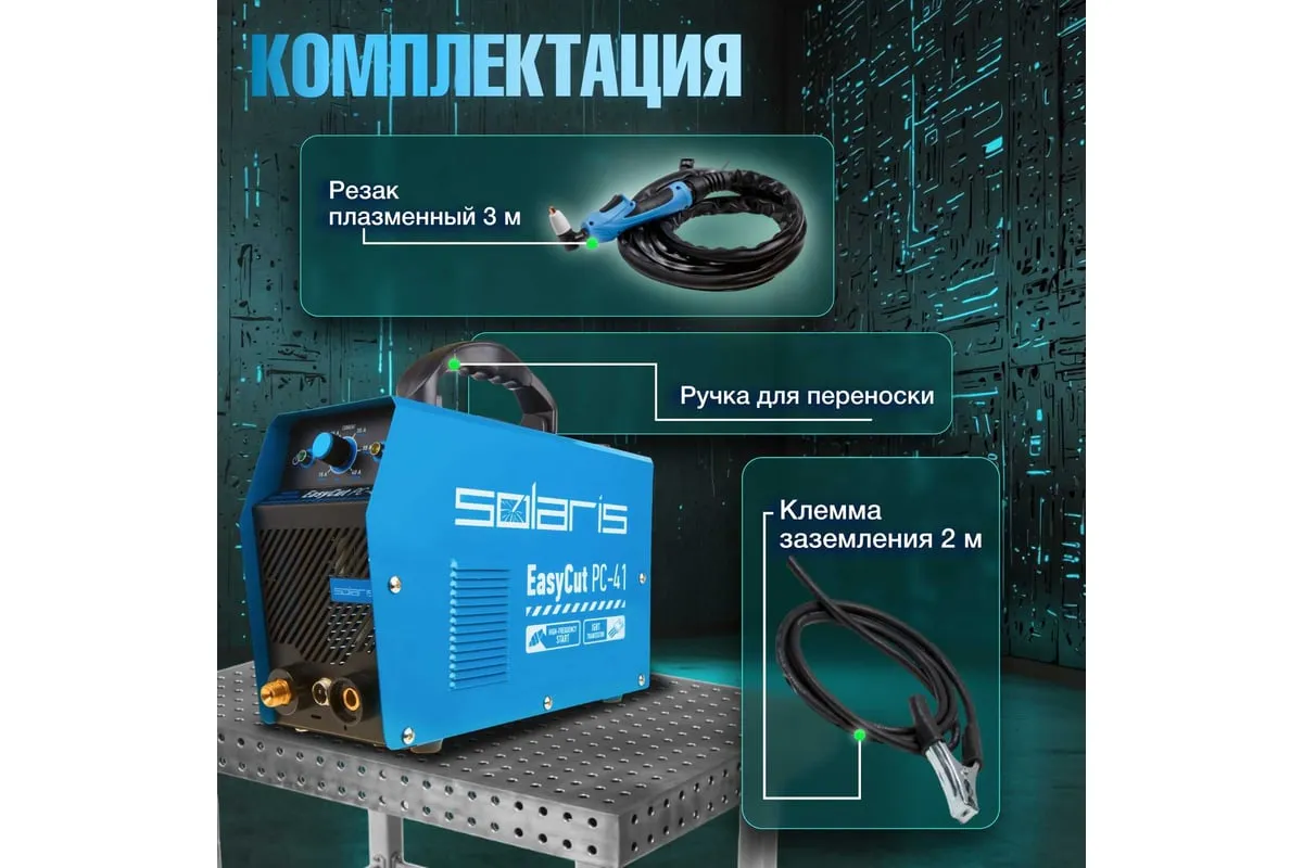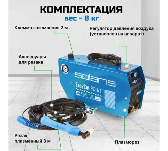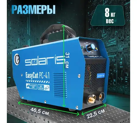 Плазморез SOLARIS EasyCut PC-41 используется для работы с различными токопроводящими материалами: углеродистая сталь, нержавеющая и оцинкованная сталь, алюминий, медь и пр. Устройство поможет выполнить резку металла с большой скоростью и высоким качеством среза. Высокочастотный поджиг дуги обеспечивает плавный и качественный старт. Одной из главных особенностей аппарата является регулировка продувки после резки до 20 секунд. Внимание! Аппарат поставляется без вилки! В случае работы на максимальных токах, аппарат необходимо оснащать силовой однофазной вилкой 32 А 220 В. Требует подключения к воздушному компрессору с производительностью воздуха не менее 150 л/мин.