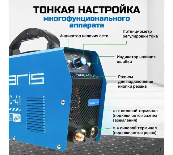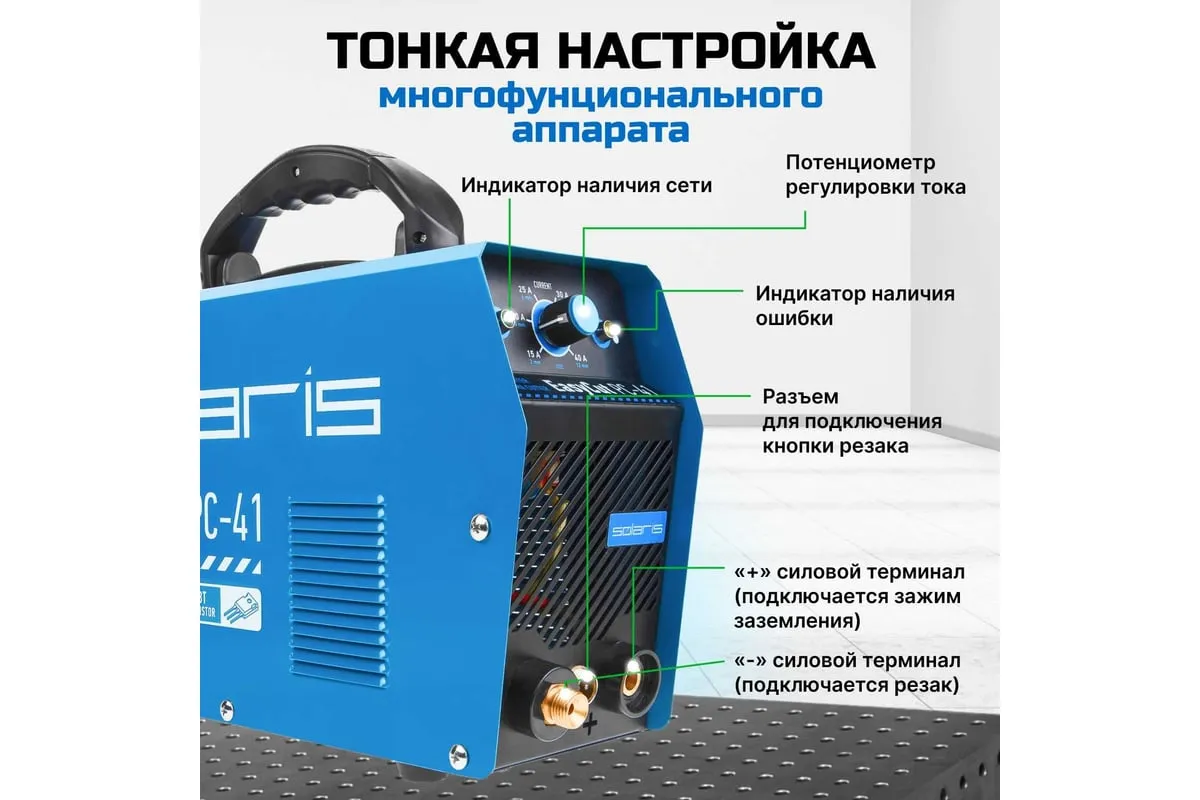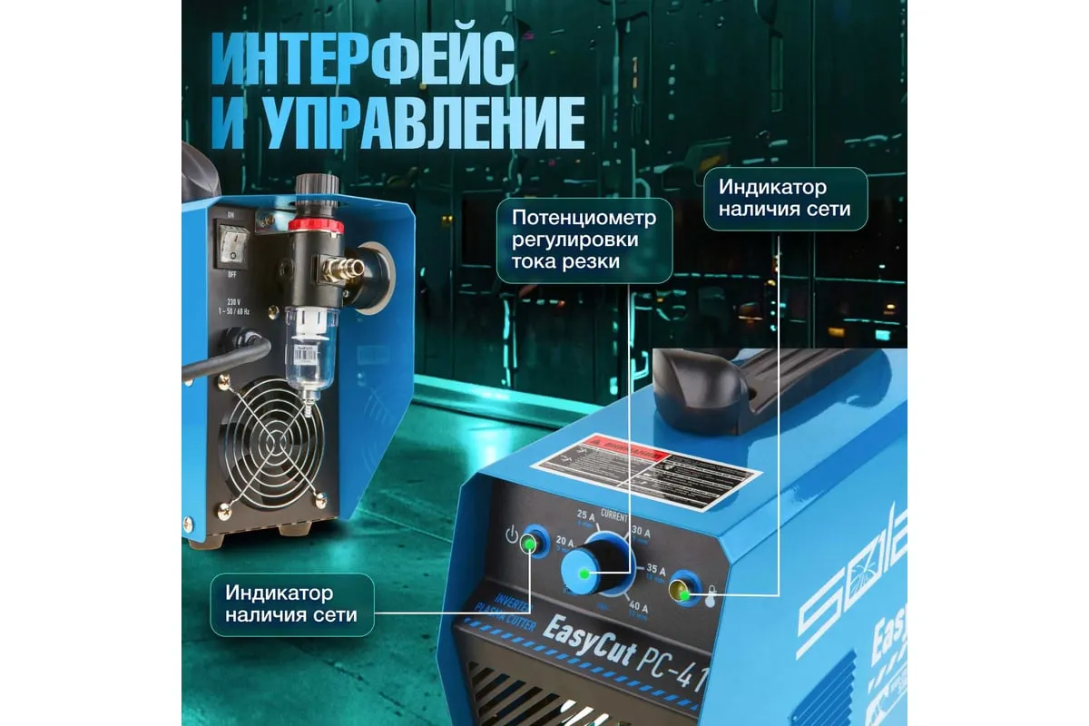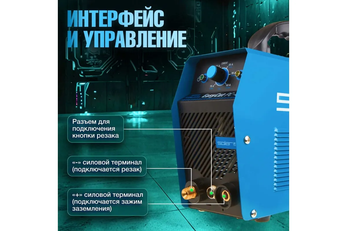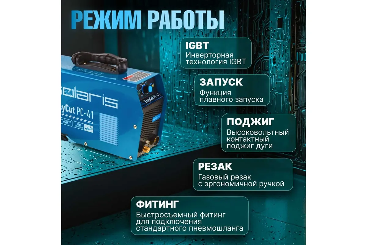 Плазморез SOLARIS EasyCut PC-41 используется для работы с различными токопроводящими материалами: углеродистая сталь, нержавеющая и оцинкованная сталь, алюминий, медь и пр. Устройство поможет выполнить резку металла с большой скоростью и высоким качеством среза. Высокочастотный поджиг дуги обеспечивает плавный и качественный старт. Одной из главных особенностей аппарата является регулировка продувки после резки до 20 секунд. Внимание! Аппарат поставляется без вилки! В случае работы на максимальных токах, аппарат необходимо оснащать силовой однофазной вилкой 32 А 220 В. Требует подключения к воздушному компрессору с производительностью воздуха не менее 150 л/мин.