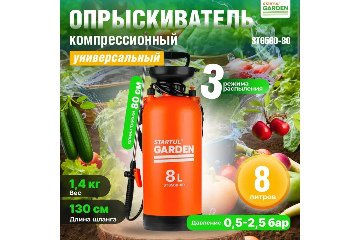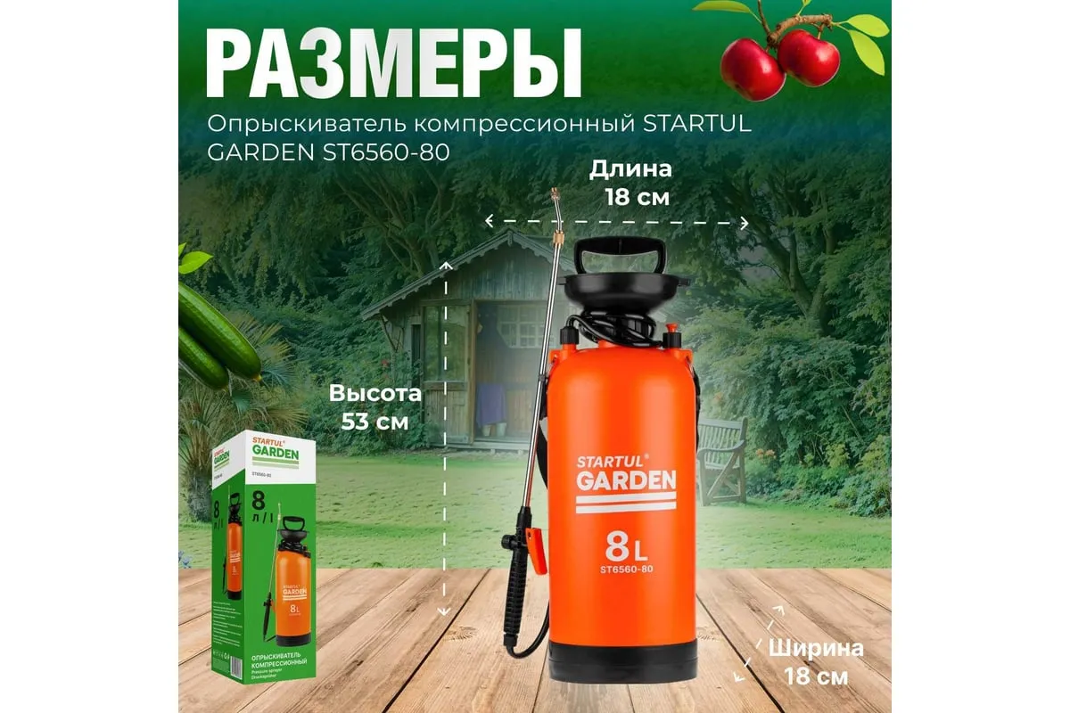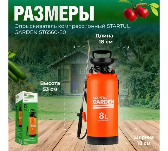 Плечевой опрыскиватель STARTUL 8 л Garden ST6560-80 предназначен для обработки растений средствами защиты, гербицидами и жидкими удобрениями. Удобен для использования в садах, огородах, на плантациях и лесопитомниках.