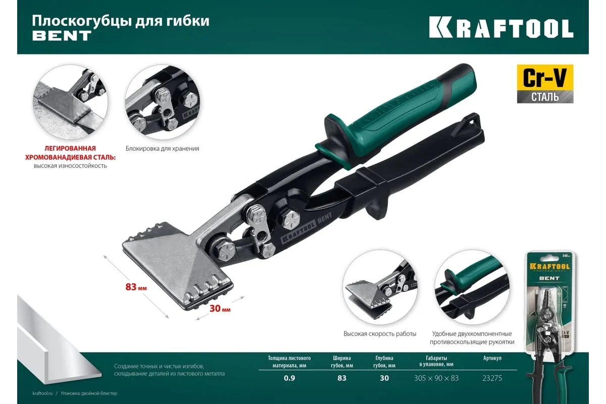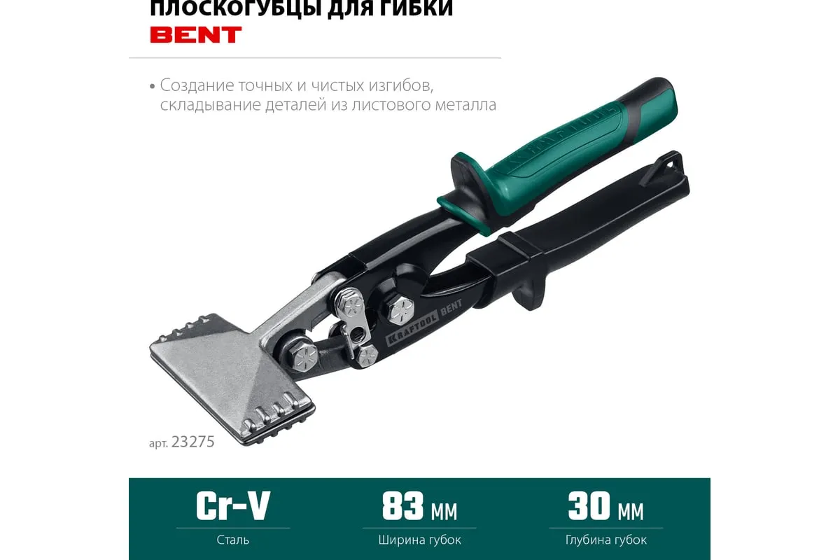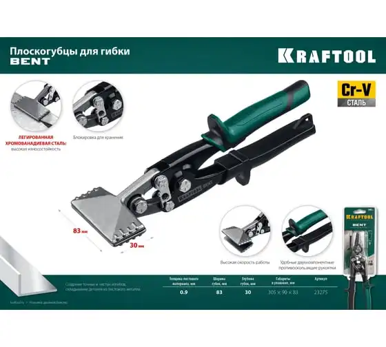 Плоскогубцы для гибки, 75 мм / 3" KRAFTOOL Bent 23275, предназначены для работы с листовым металлом. Профессиональный инструмент для гибки листового металла, плита листа 0,9 мм. Изготовлены из высококачественной легированной хромванадиевой стали. Удобные рукоятки.