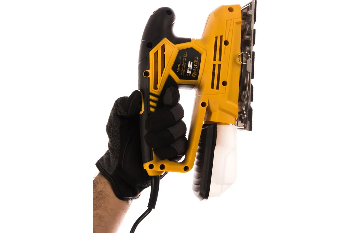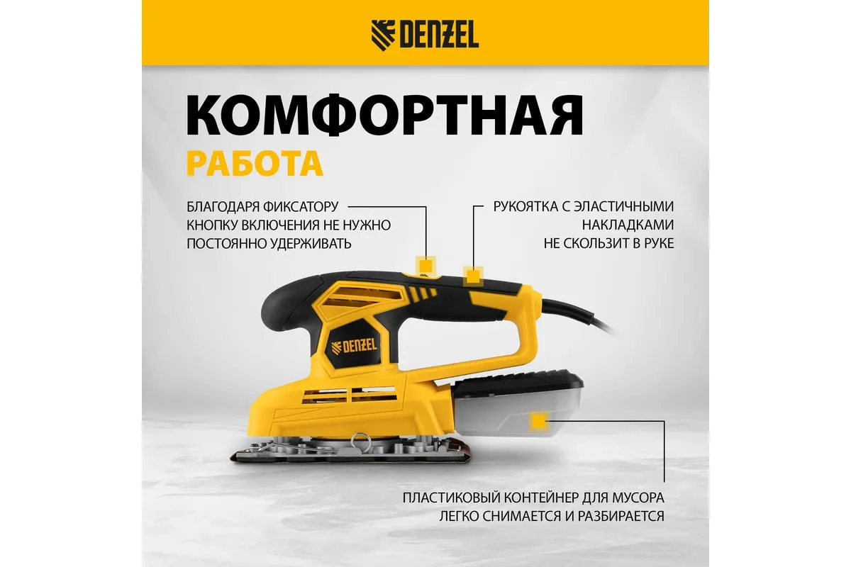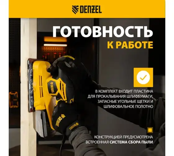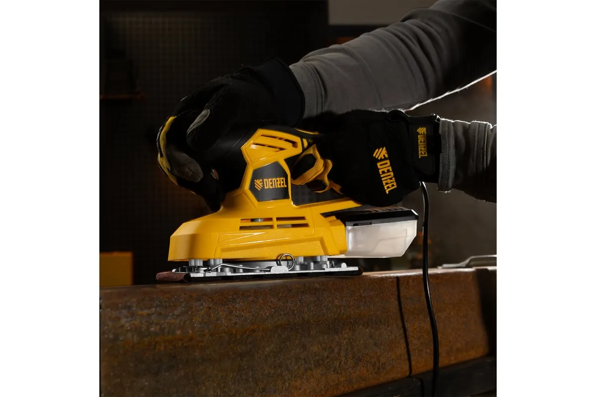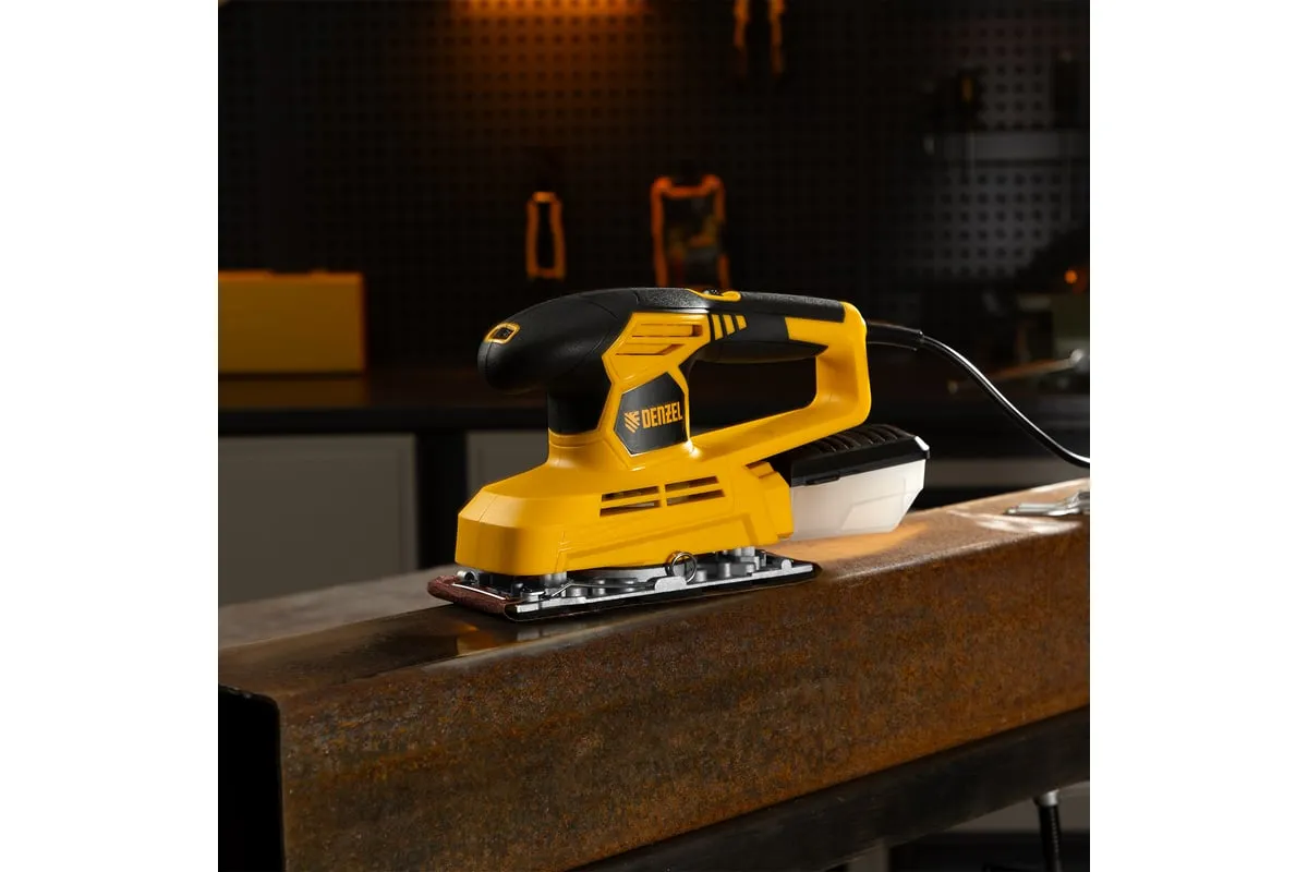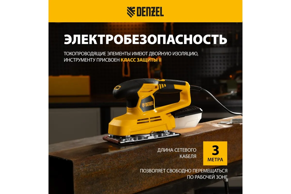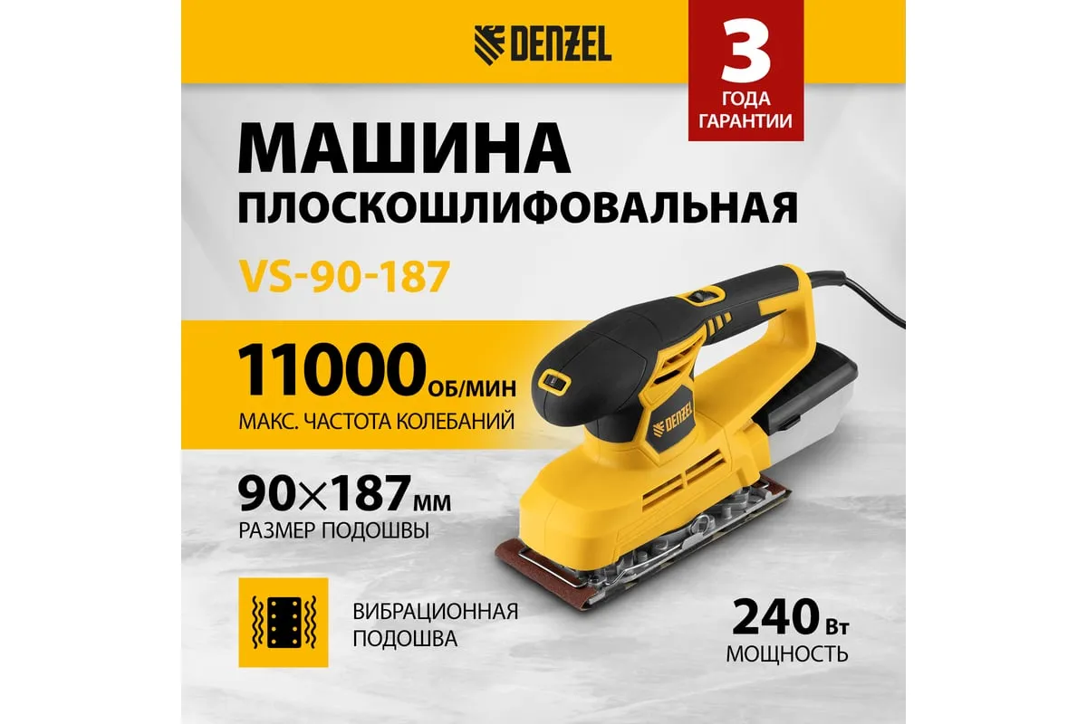 Вибрационная плоскошлифовальная машина Denzel VS-90-187 мощностью 240 Вт, с частотой колебаний подошвы 6000-11000 об/мин, подходит для сухого шлифования, зачистки и полировки поверхностей. Регулировка частоты колебаний подошвы 6000-11000 об/мин позволяет выбрать оптимальный режим работы. Размер рабочей поверхности составляет 90 х 187 мм, ход платформы — 1,6 мм, благодаря чему машина эффективно справляется с обработкой больших поверхностей.