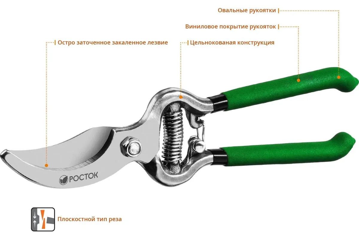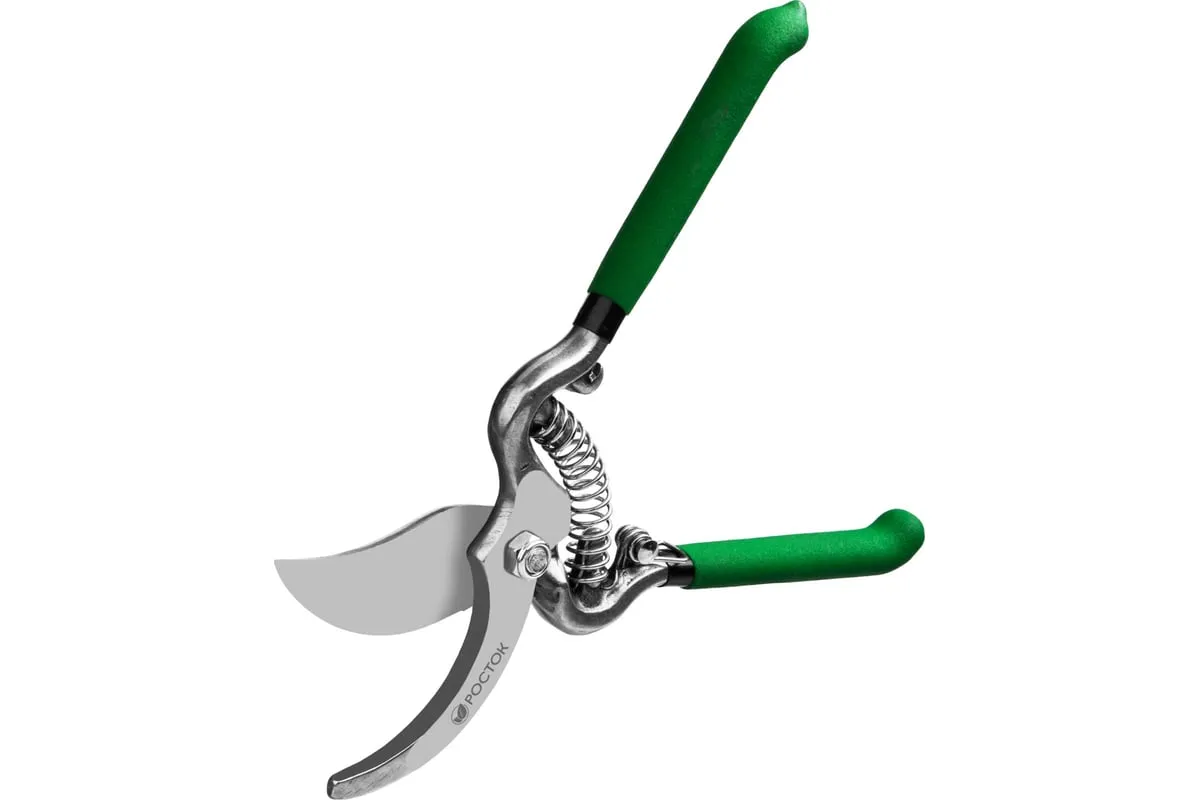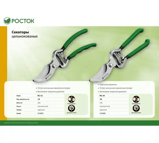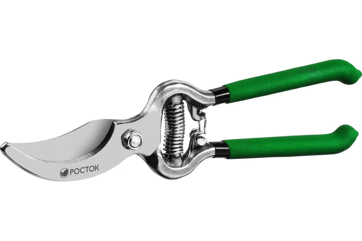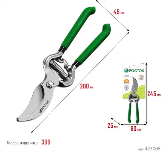 Секатор РОСТОК 423006, применяется для обрезки веток деревьев и кустарников, а также стеблей цветов. Лезвие изготовлено из высококачественной углеродистой стали, остро заточено и закалено. Рукоятки покрыты винилом, поэтому обеспечивают надежный хват инструмента и снижают нагрузку на кисти рук.