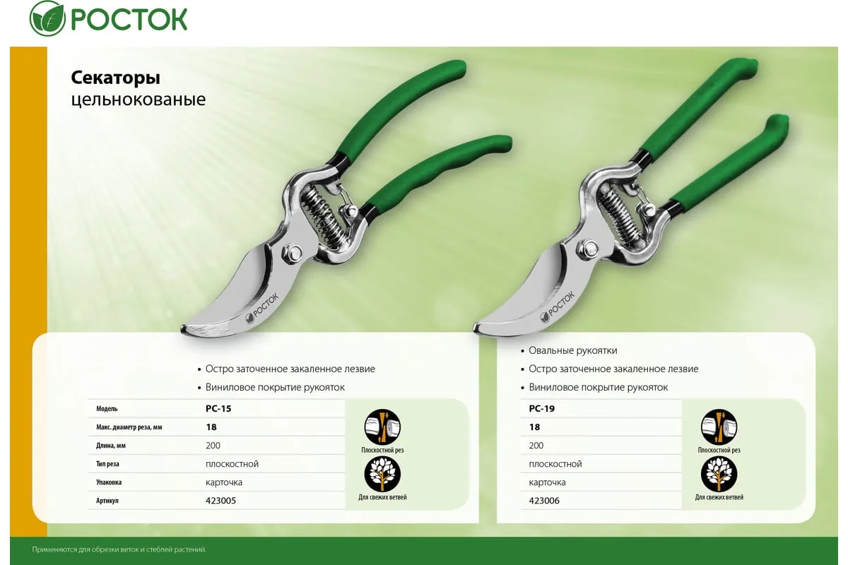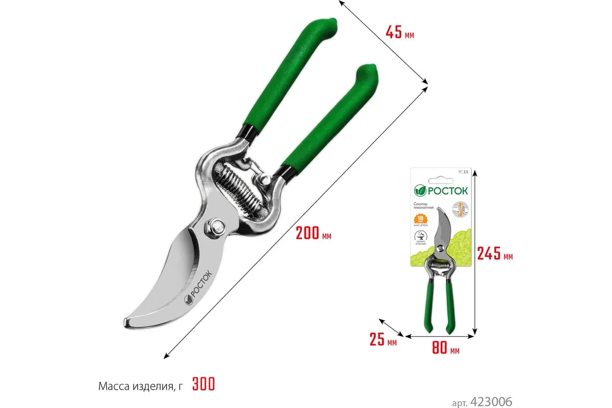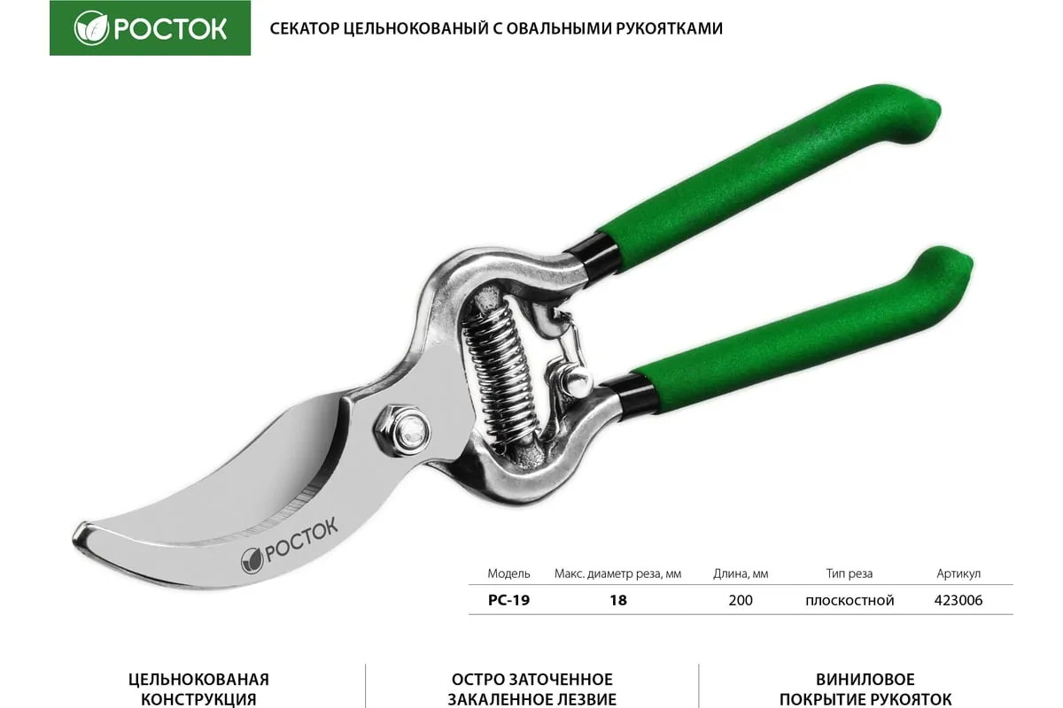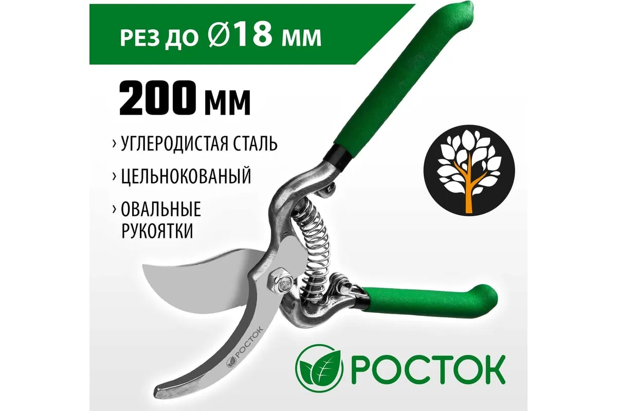 Секатор РОСТОК 423006, применяется для обрезки веток деревьев и кустарников, а также стеблей цветов. Лезвие изготовлено из высококачественной углеродистой стали, остро заточено и закалено. Рукоятки покрыты винилом, поэтому обеспечивают надежный хват инструмента и снижают нагрузку на кисти рук.