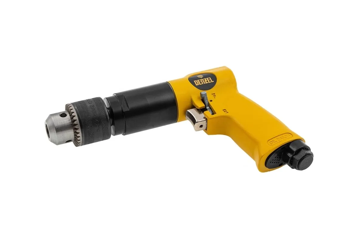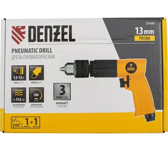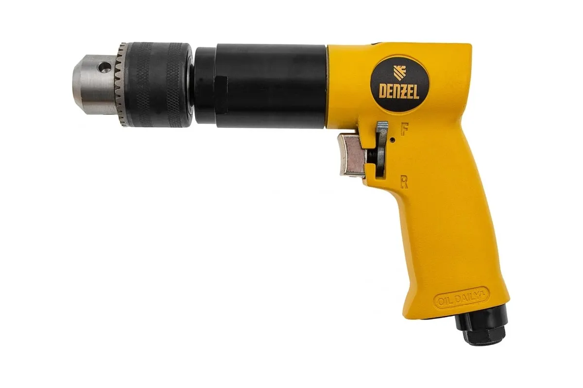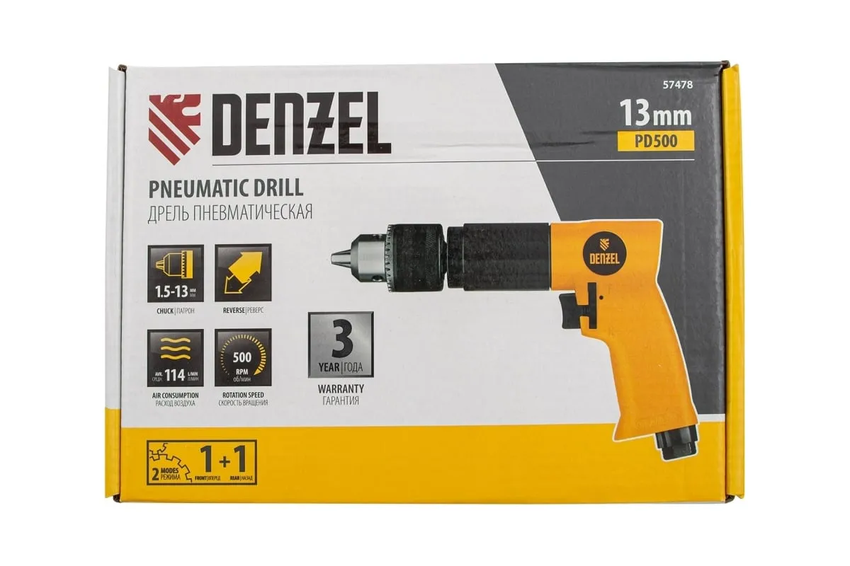 Пневматическая дрель Denzel PD500 57478 с ключевым патроном 1,5-13 мм работает со скоростью 500 об/мин при среднем расходе сжатого воздуха 114 л/мин.