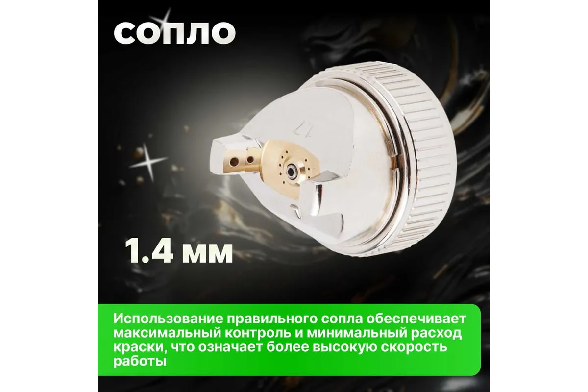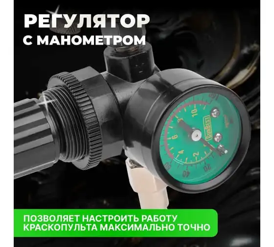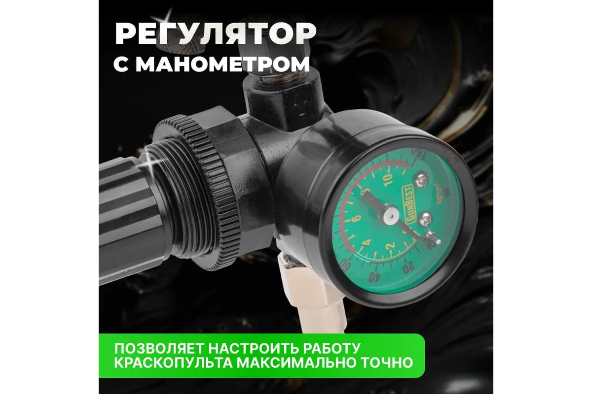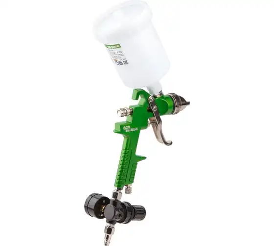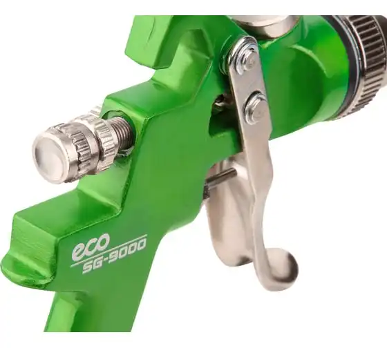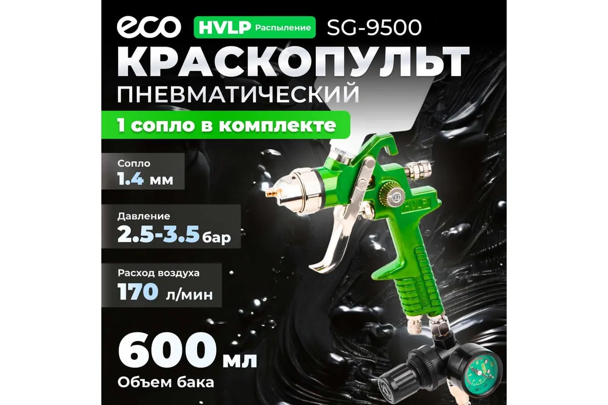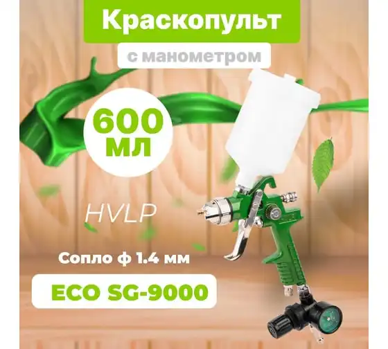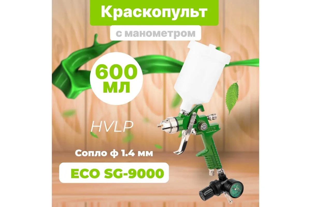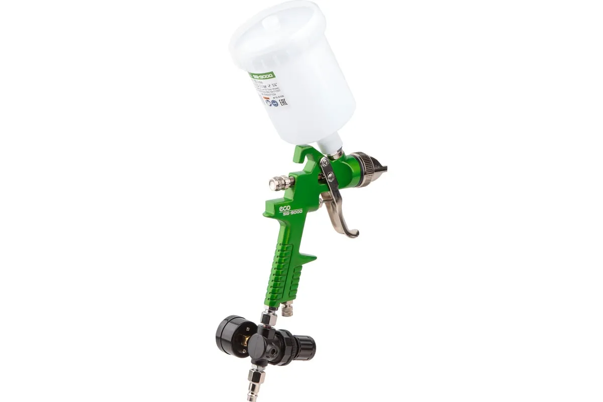 Пневматический краскопульт ECO SG-9000 с манометром EC1535-14 с набором регулировок. Регулятор с манометром в комплекте позволяет настроить работу краскораспылителя максимально точно.