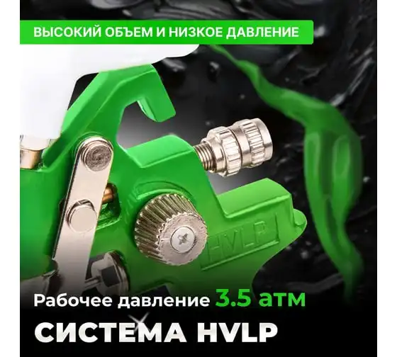 Достоинства HVLP (High Volume Low Pressure – "высокий объем, низкое давление"): высокая экономия материалов, практически отсутствие опыла, нет завихрений, нет мусора.