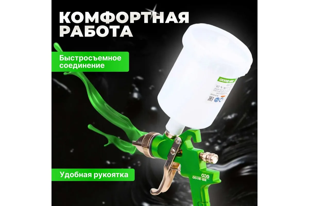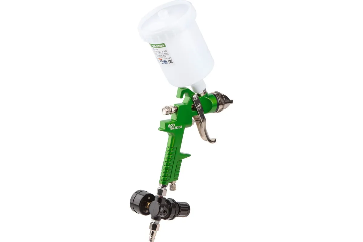 Пневматический краскопульт ECO SG-9500 с манометром EC1536-01 подойдет для нанесения грунта и эмали.