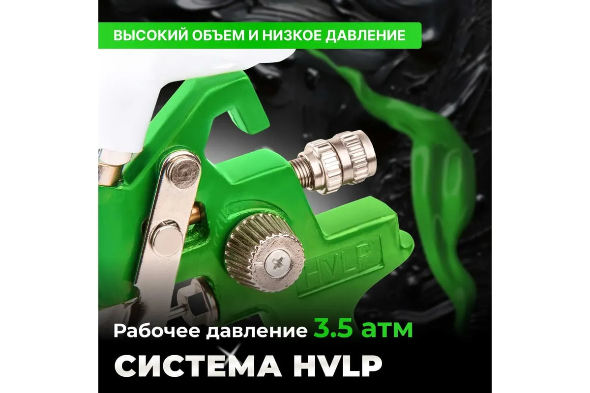 Достоинства HVLP (High Volume Low Pressure - "высокий объем, низкое давление"): высокая экономия материалов, практически отсутствие опыла, нет завихрений, нет мусора.