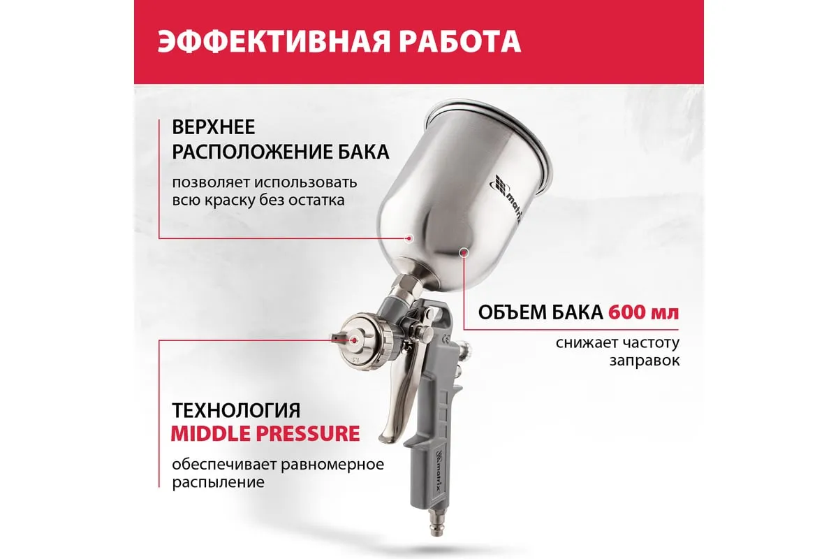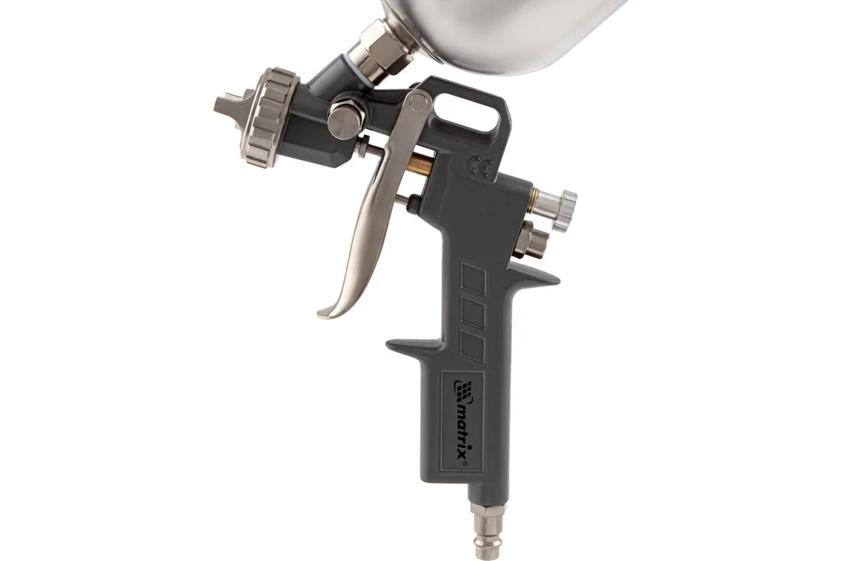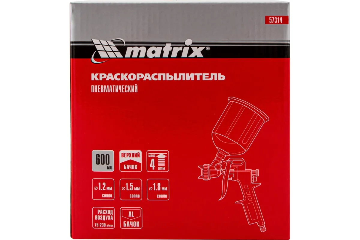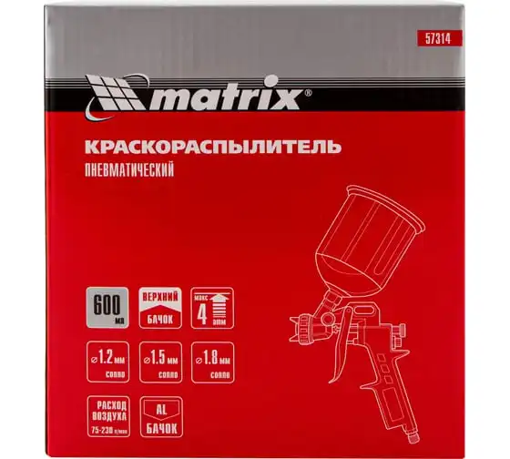 Пневматический краскораспылитель MATRIX 57314 позволяет наносить на поверхность защитные, декоративные и изоляционные покрытия. Он имеет верхнее расположение бачка и вмещает в себя до 0.6 литра краски. Конструкция краскопульта выполнена из металла, благодаря чему устойчива к механическим повреждениям в случае падения. В комплекте прилагаются сопла диаметром 1.2, 1.5 и 1.8 мм.