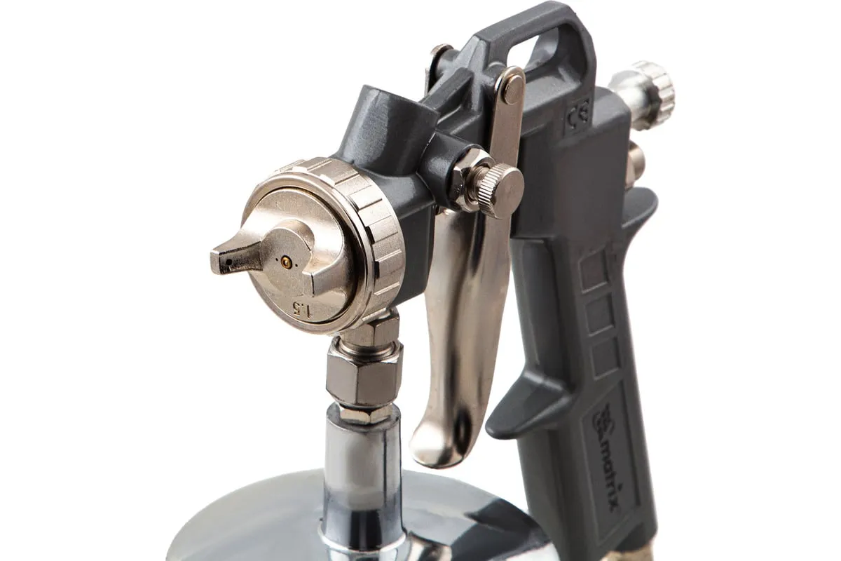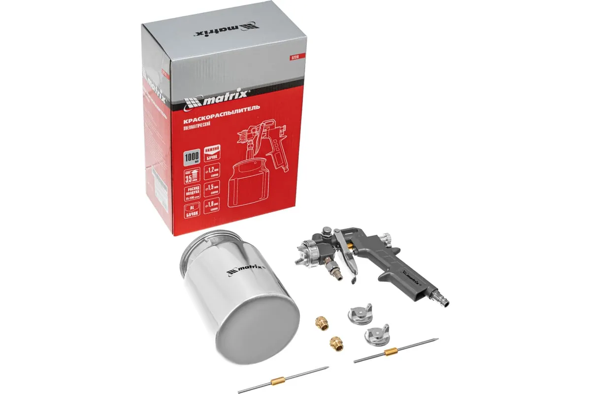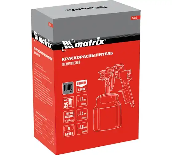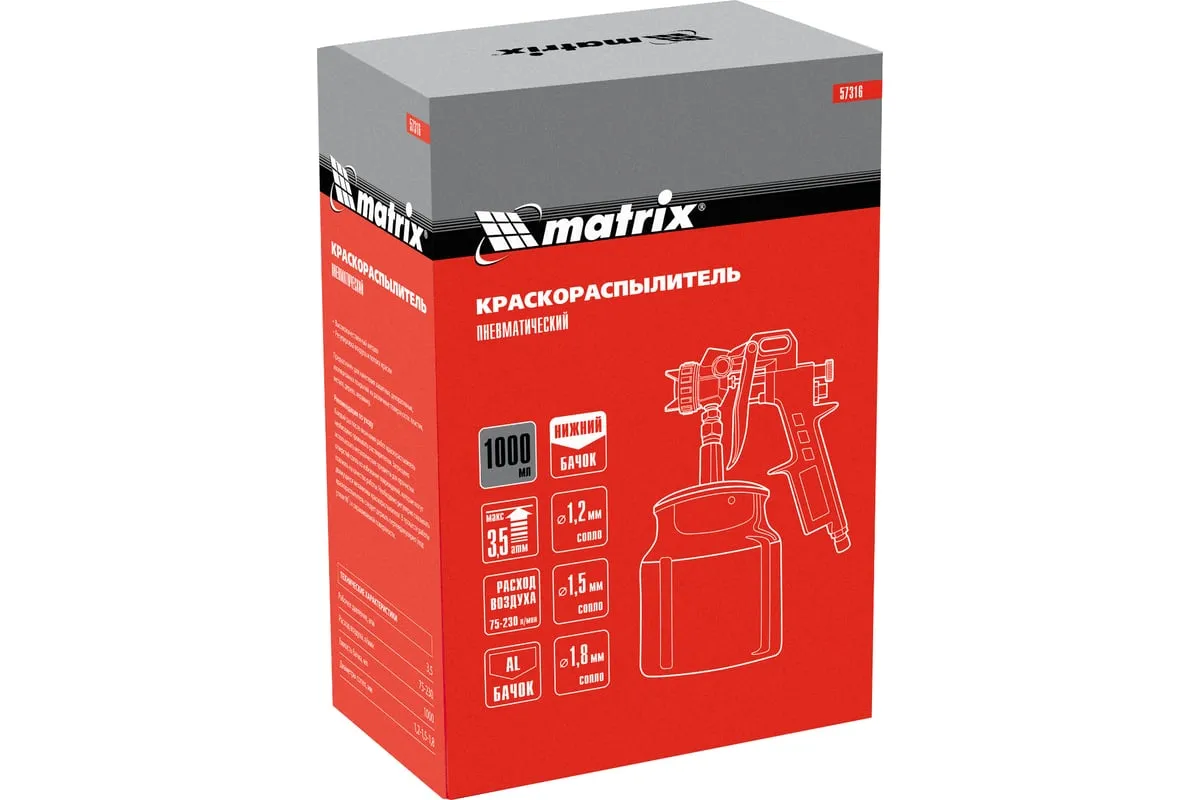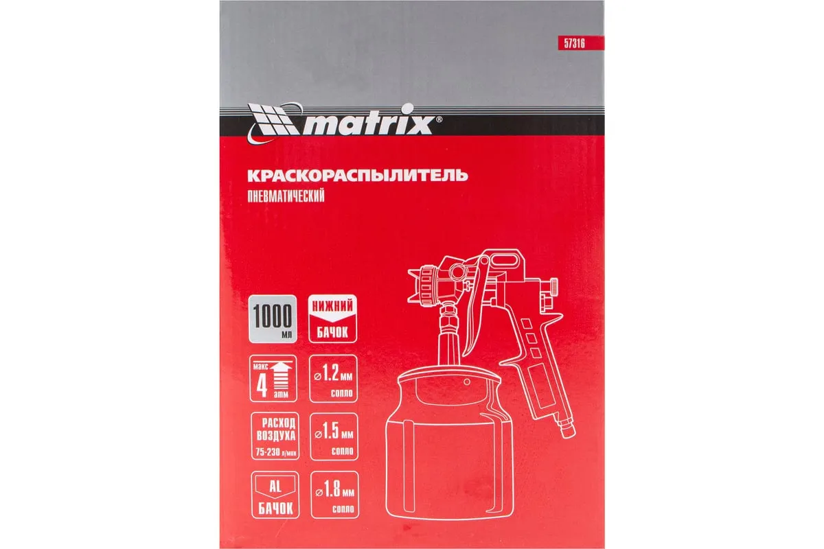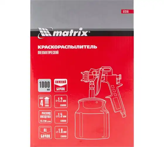 Пневматический краскораспылитель MATRIX 57316 используется при наружных и внутренних отделочных работах. С его помощью производится нанесение защитных, декоративных и изоляционных покрытий на различные поверхности. Пистолет имеет металлическую конструкцию, что обеспечивает надежность и устойчивость к механическим повреждениям. В комплект входят сопла диаметром 1.2, 1.5 и 1.8 мм.