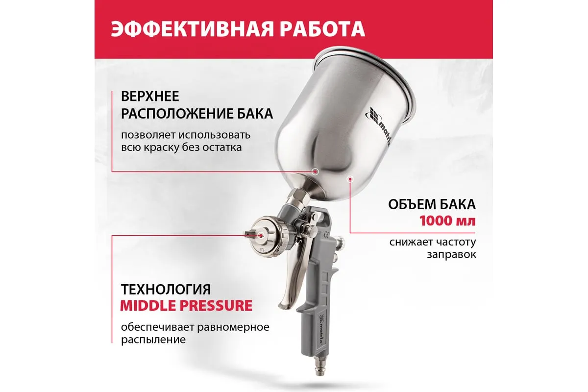Он имеет верхнее расположение бачка и вмещает в себя до 1 литра краски для долгой работы без дозаправки.