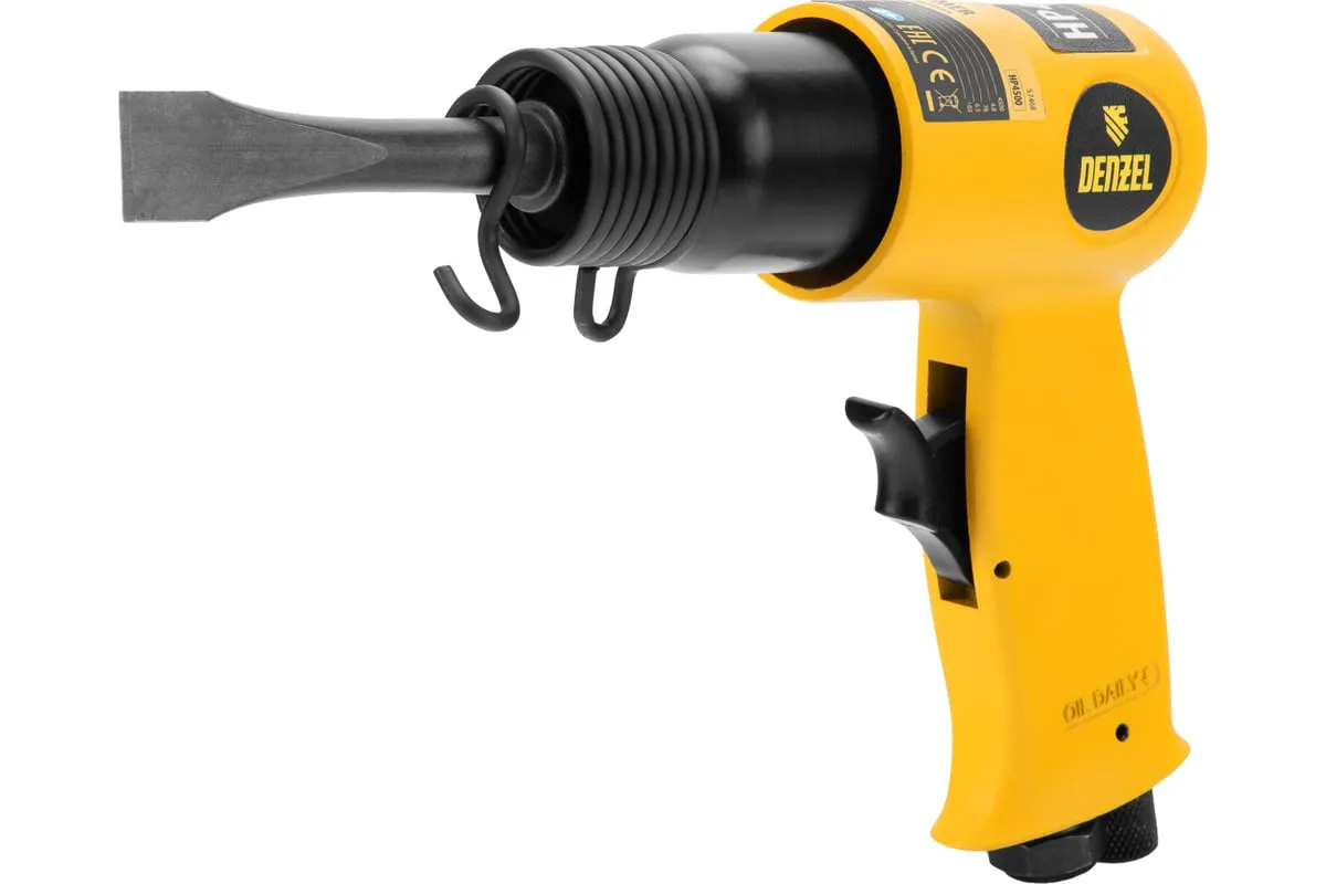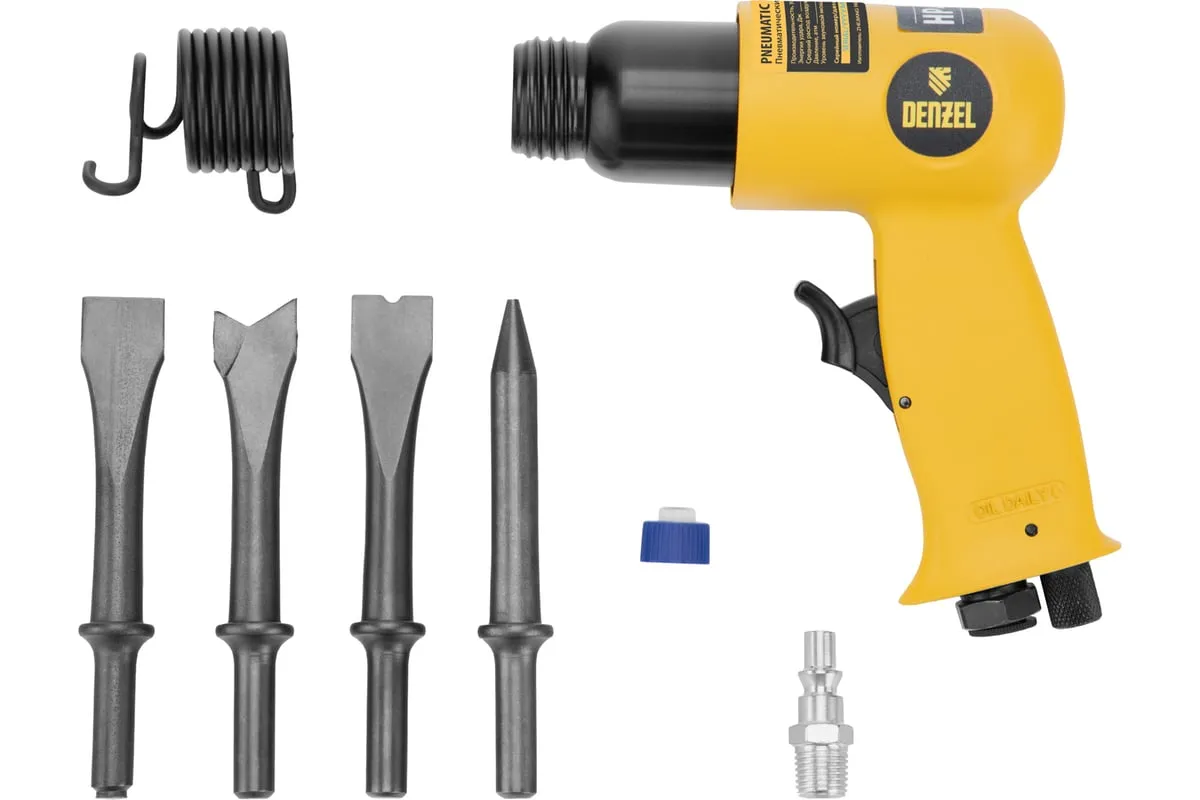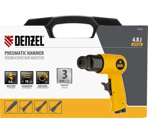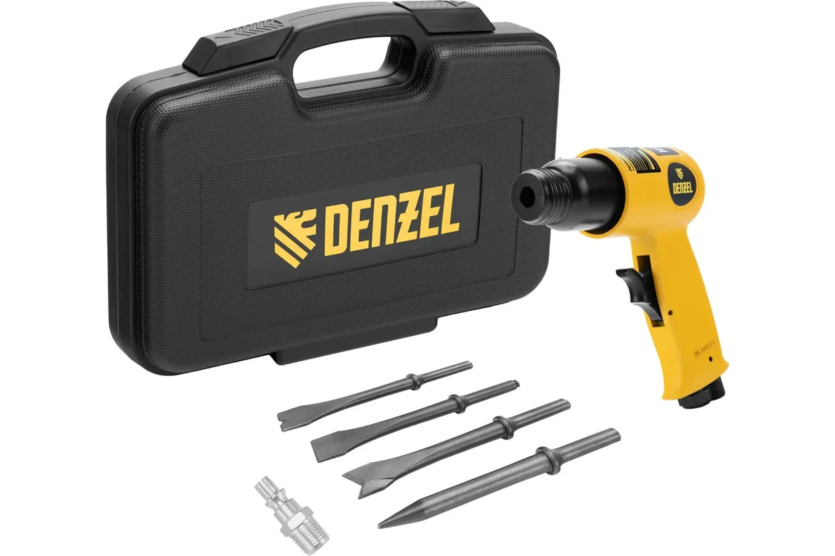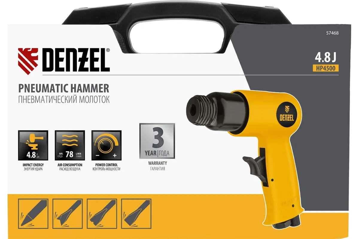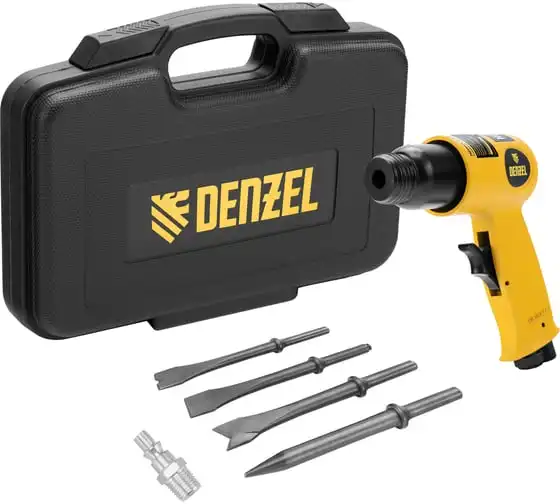 Пневматический молоток Denzel HP4500 57468 с набором насадок обеспечивает производительность 4500 уд/мин при среднем расходе сжатого воздуха 113 л/мин.