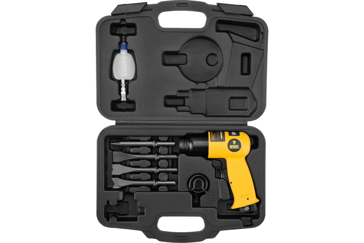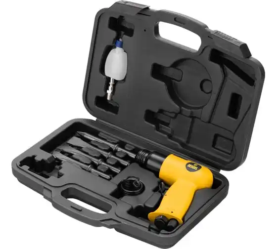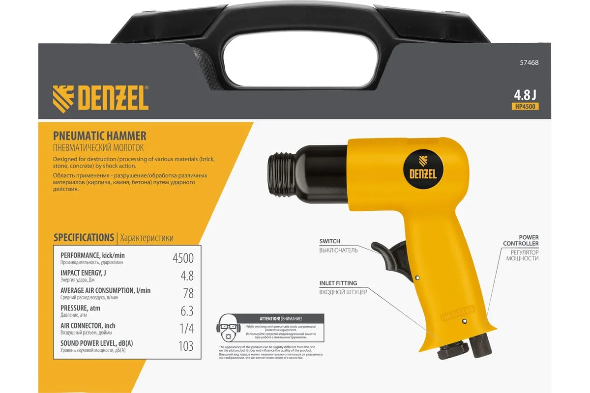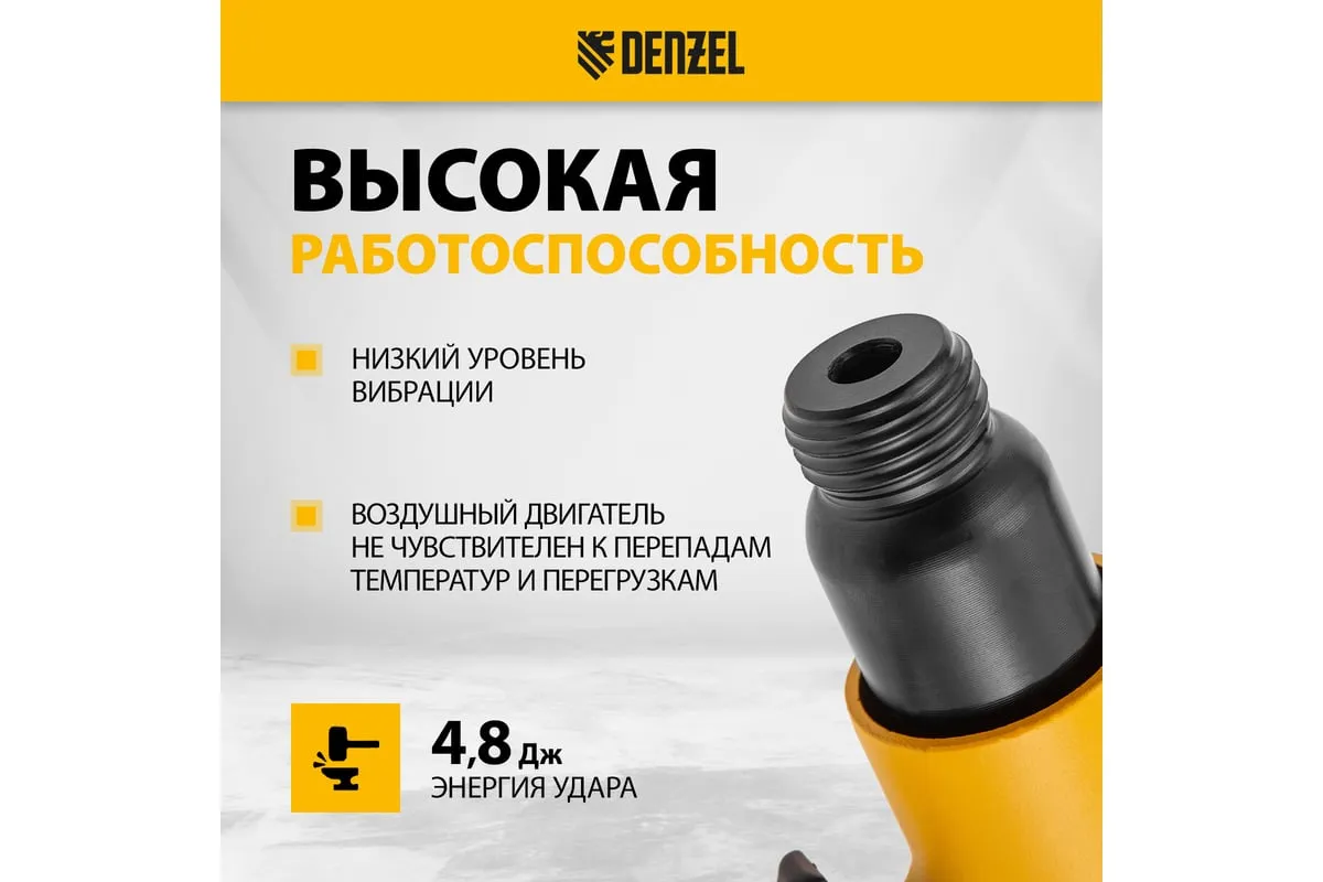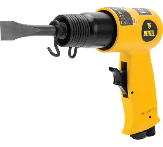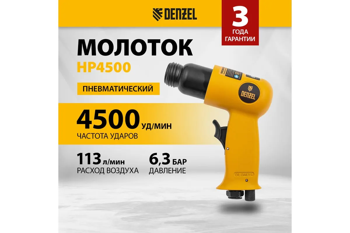 Пневматический молоток Denzel HP4500 57468 с набором насадок обеспечивает производительность 4500 уд/мин при среднем расходе сжатого воздуха 113 л/мин.