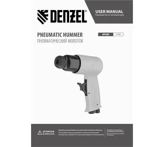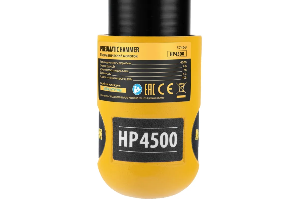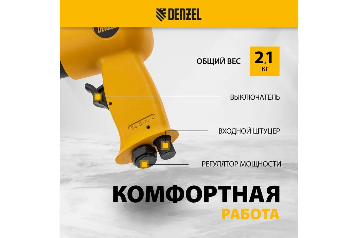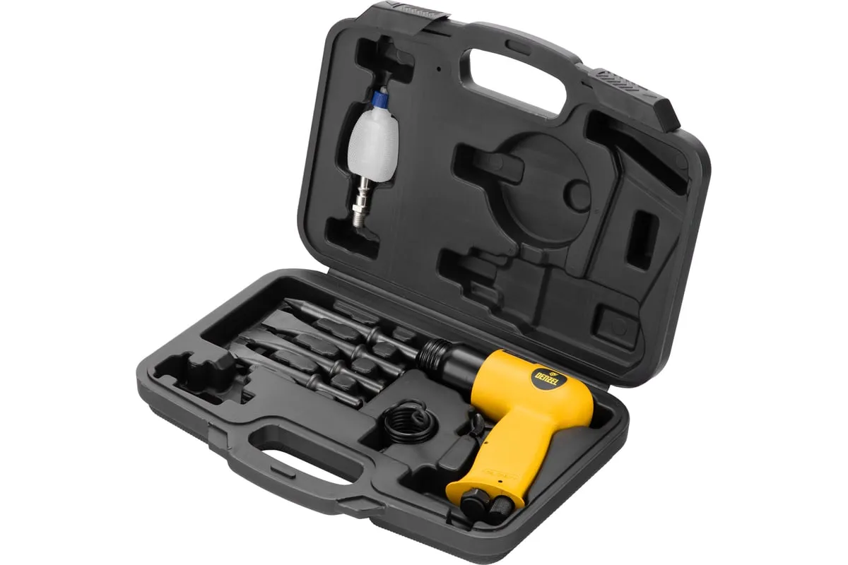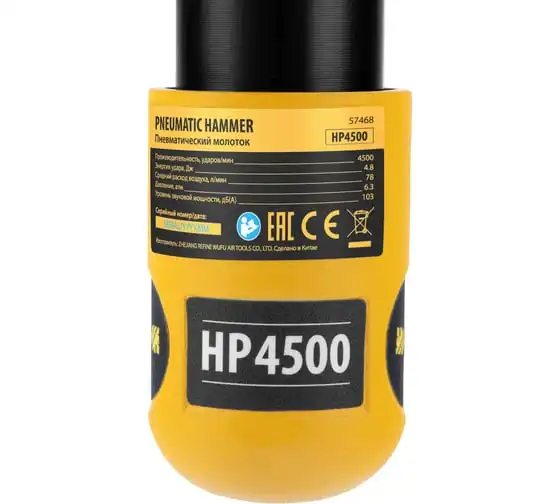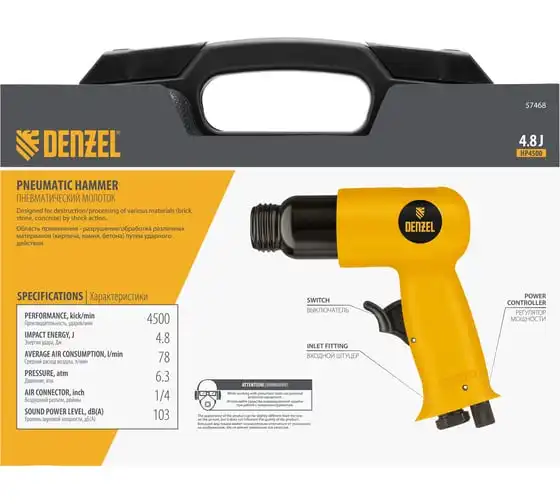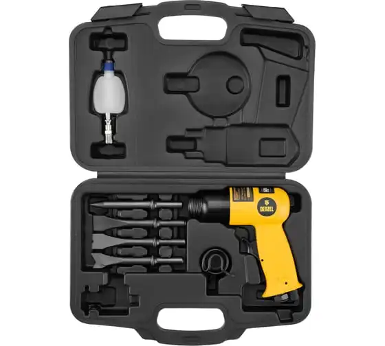 Пневматический молоток Denzel HP4500 57468 с набором насадок обеспечивает производительность 4500 уд/мин при среднем расходе сжатого воздуха 113 л/мин.