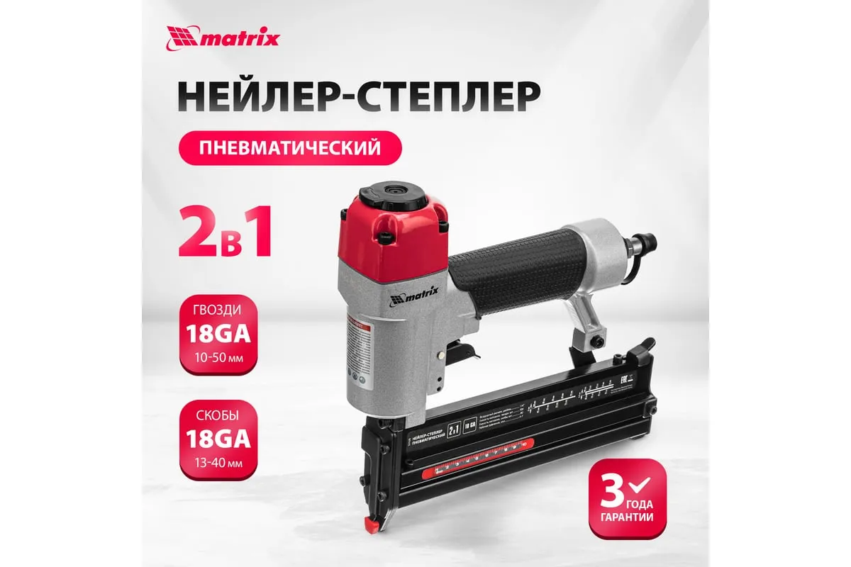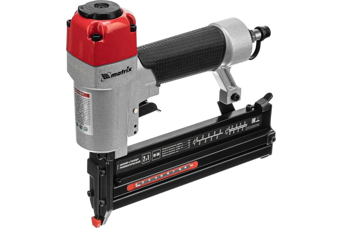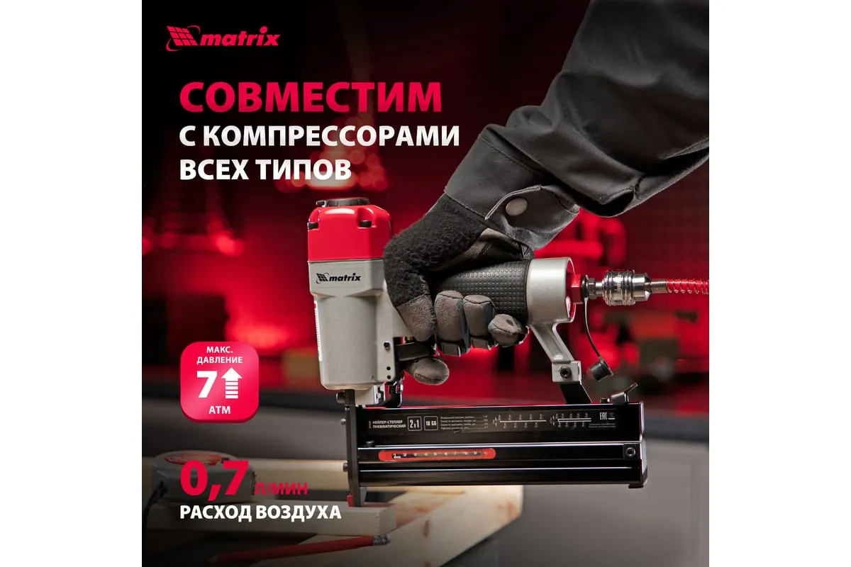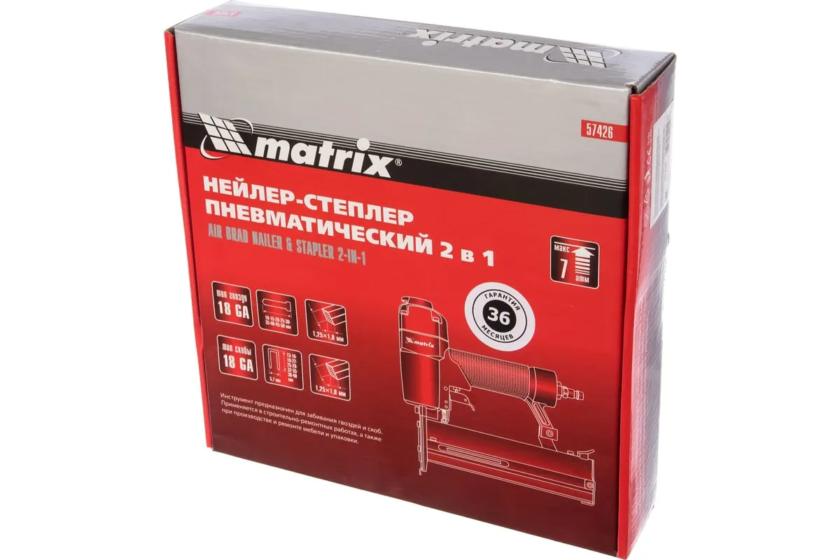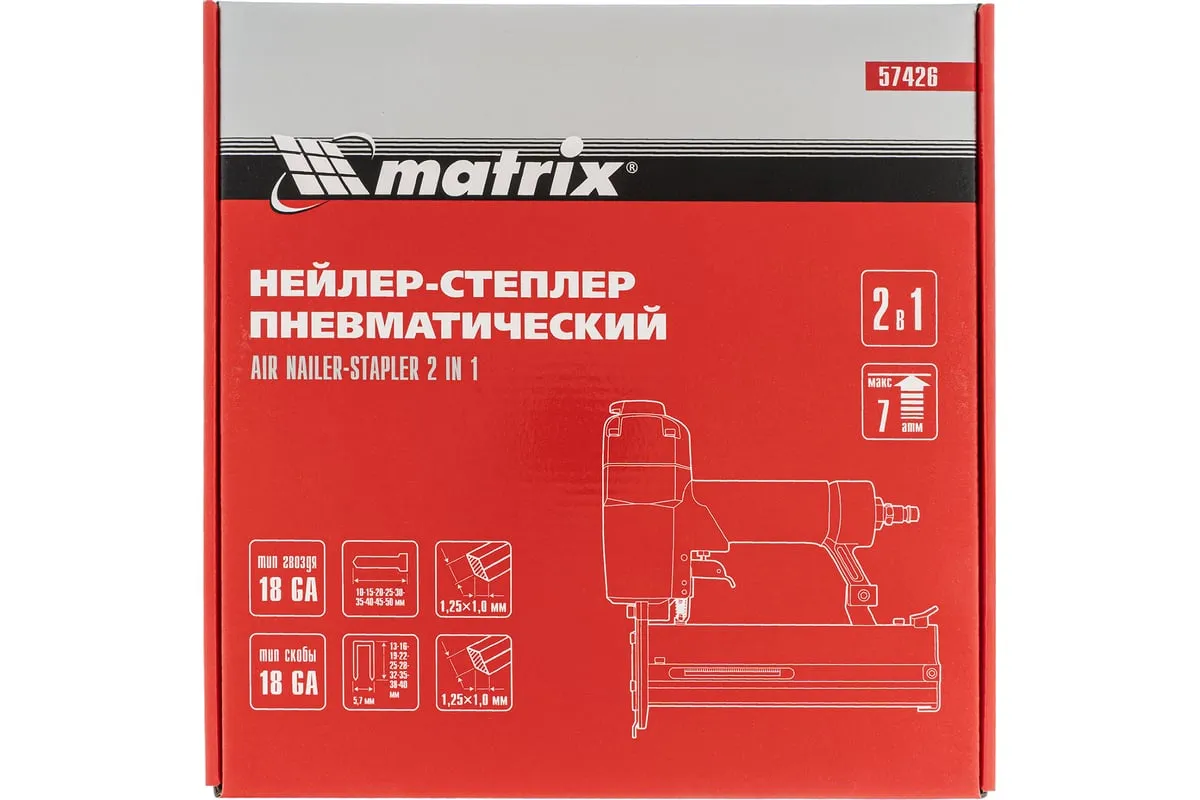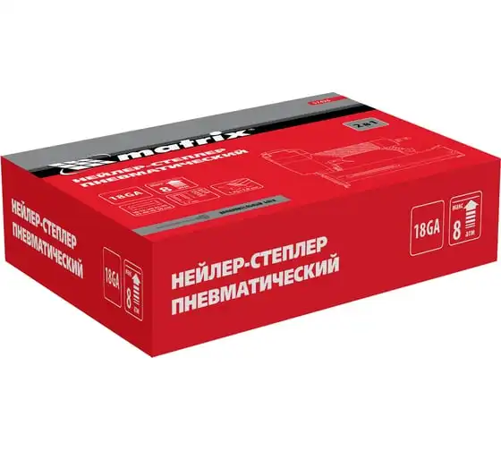 Пневматический нейлер-степлер 2 в 1 Matrix 57426 работает с двумя типами крепежей 18GA: гвоздями длиной 10-50 мм и скобами длиной 25-40 мм. Пригодится при сборке мебели и деревянных каркасов, для обшивки и утепления дома, при установке окон, дверей, плинтусов, напольных покрытий и для производства упаковки. Низкий расход воздуха 0,7 л/мин позволяет использовать инструмент с любыми типами компрессоров.