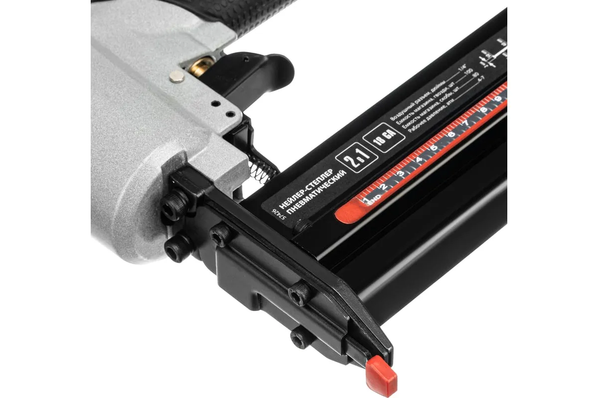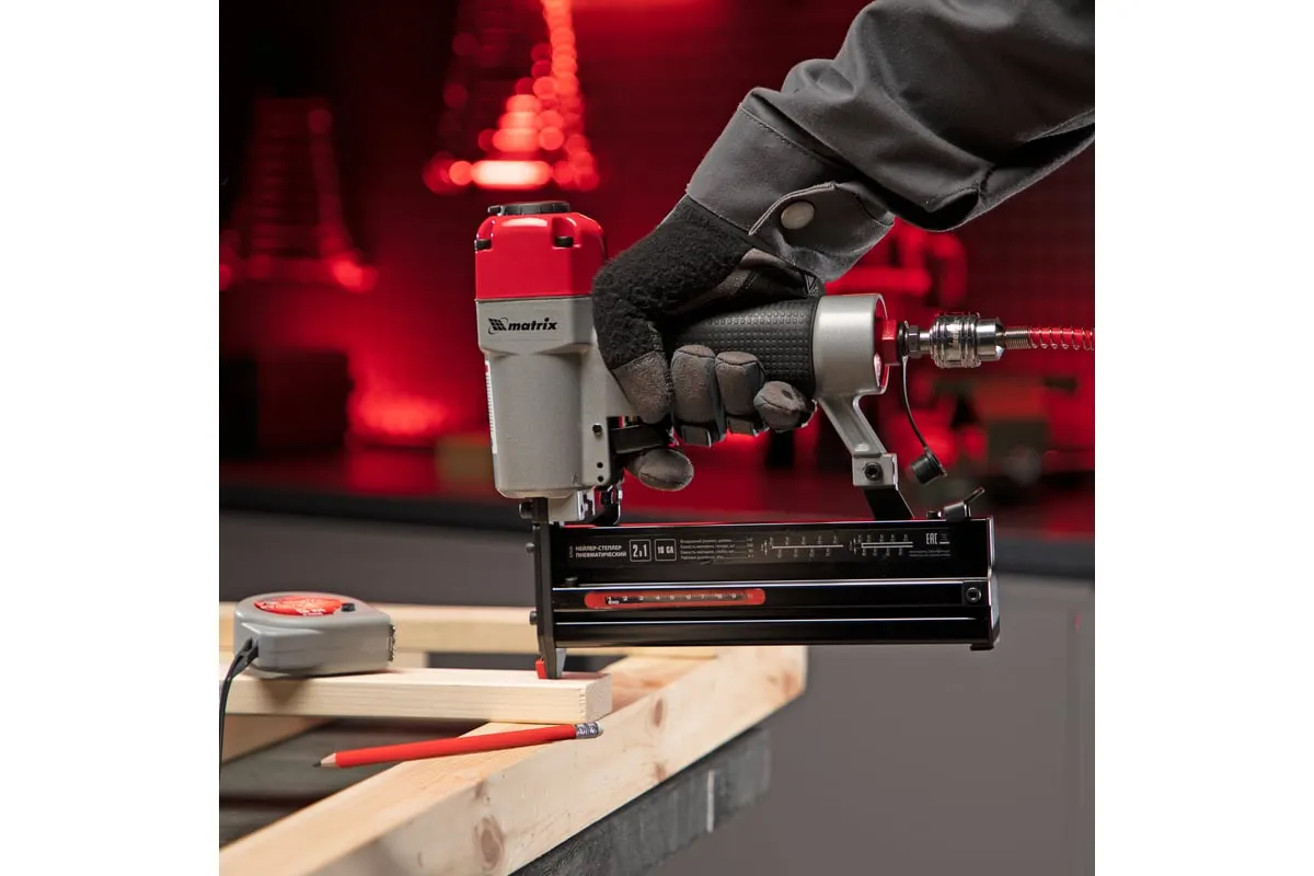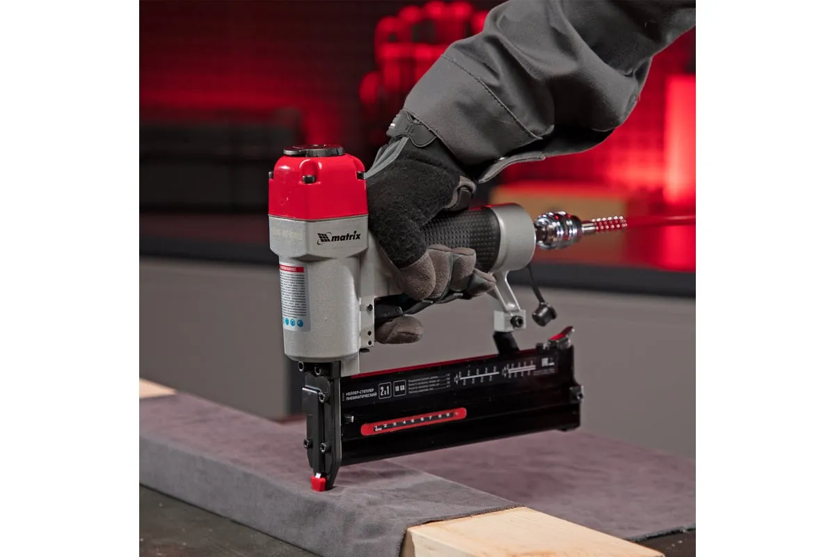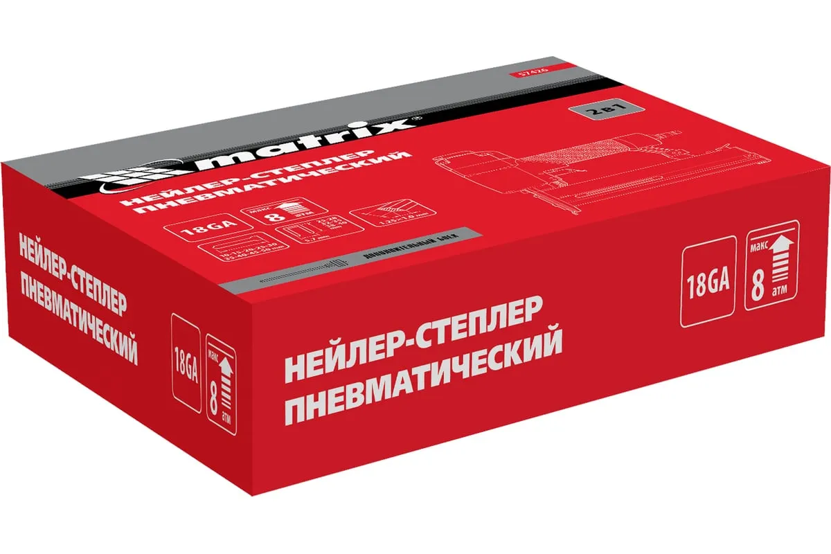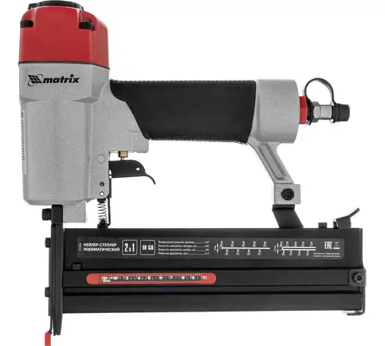 Пневматический нейлер-степлер 2 в 1 Matrix 57426 работает с двумя типами крепежей 18GA: гвоздями длиной 10-50 мм и скобами длиной 25-40 мм. Пригодится при сборке мебели и деревянных каркасов, для обшивки и утепления дома, при установке окон, дверей, плинтусов, напольных покрытий и для производства упаковки. Низкий расход воздуха 0,7 л/мин позволяет использовать инструмент с любыми типами компрессоров.