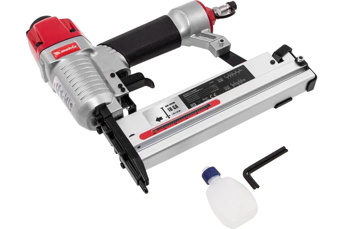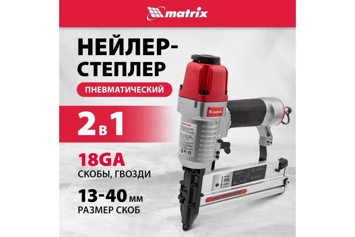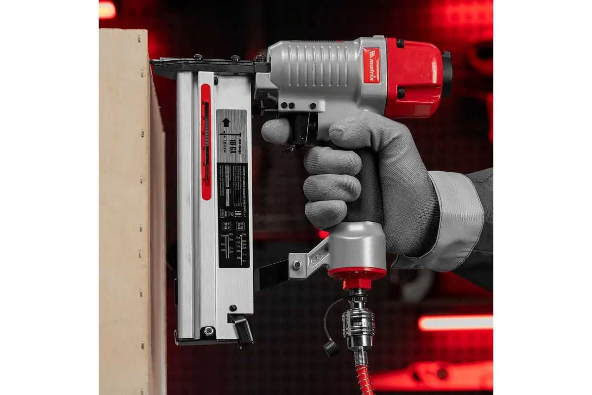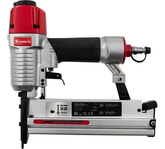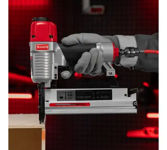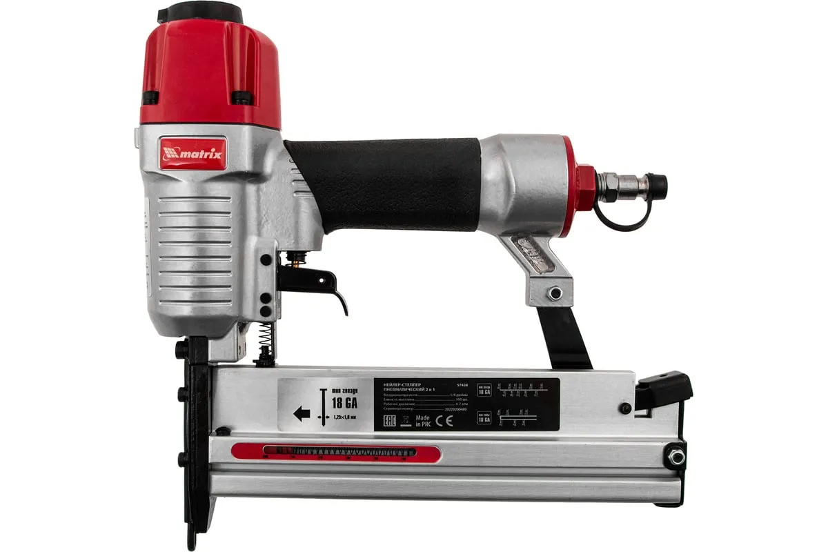 Пневматический нейлер-степлер с регулировкой глубины MATRIX 2 в 1 57428 используется для крепления материалов.
