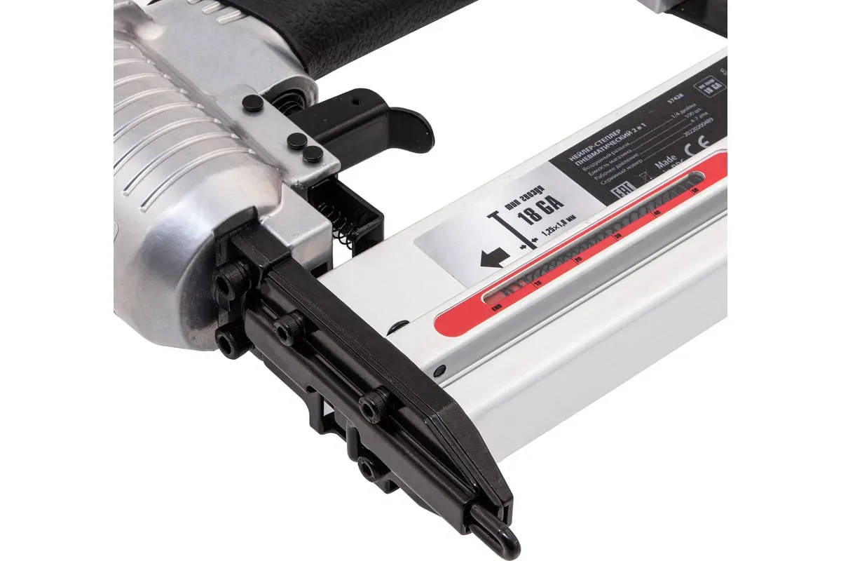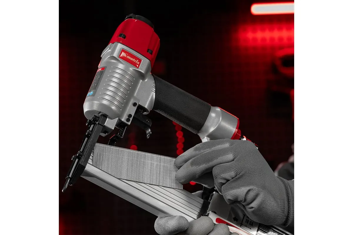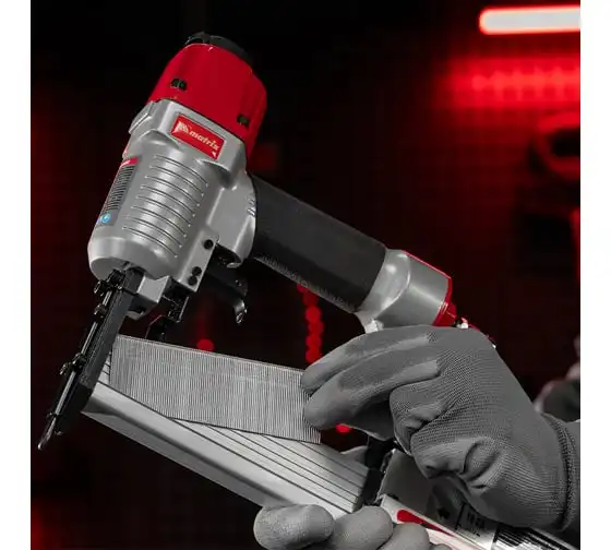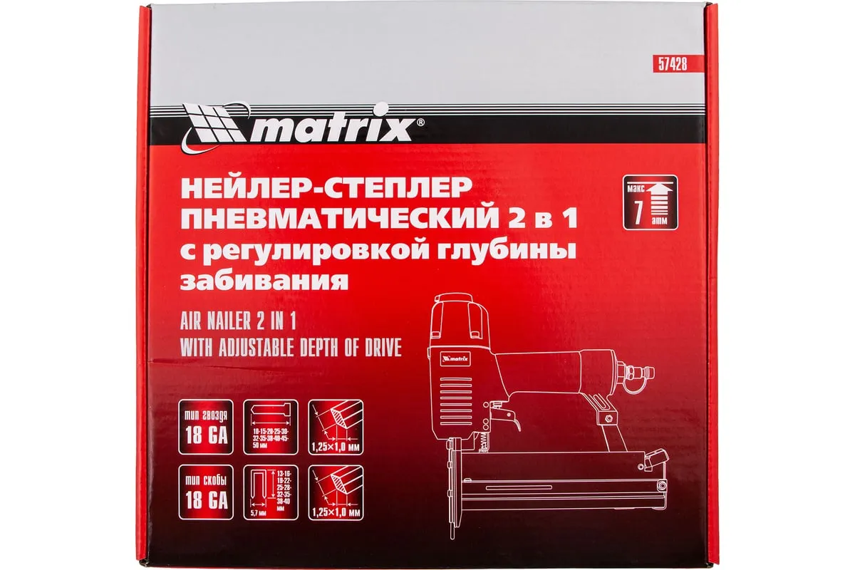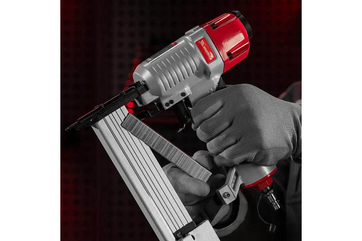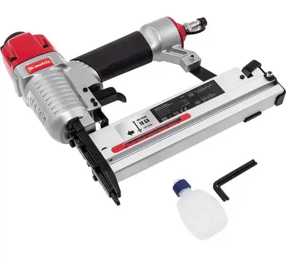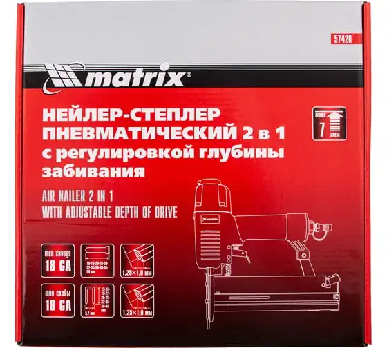 Пневматический нейлер-степлер с регулировкой глубины MATRIX 2 в 1 57428 используется для крепления материалов.