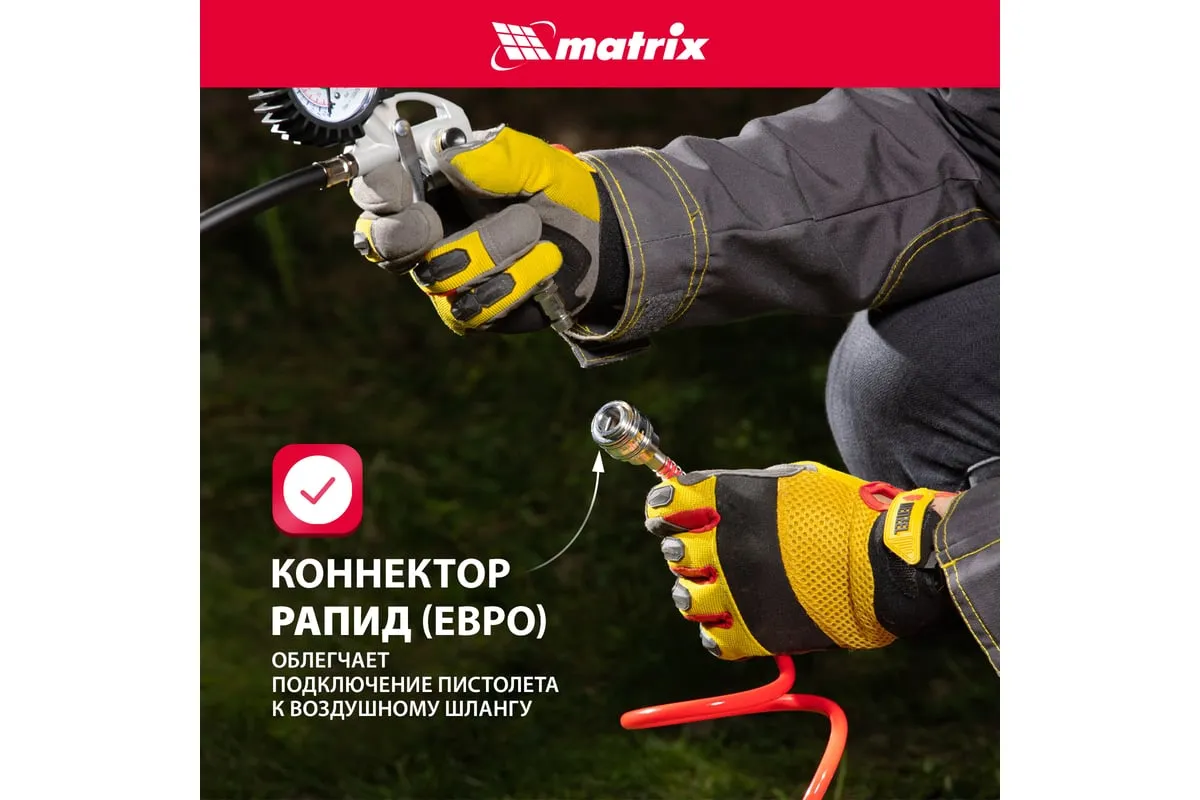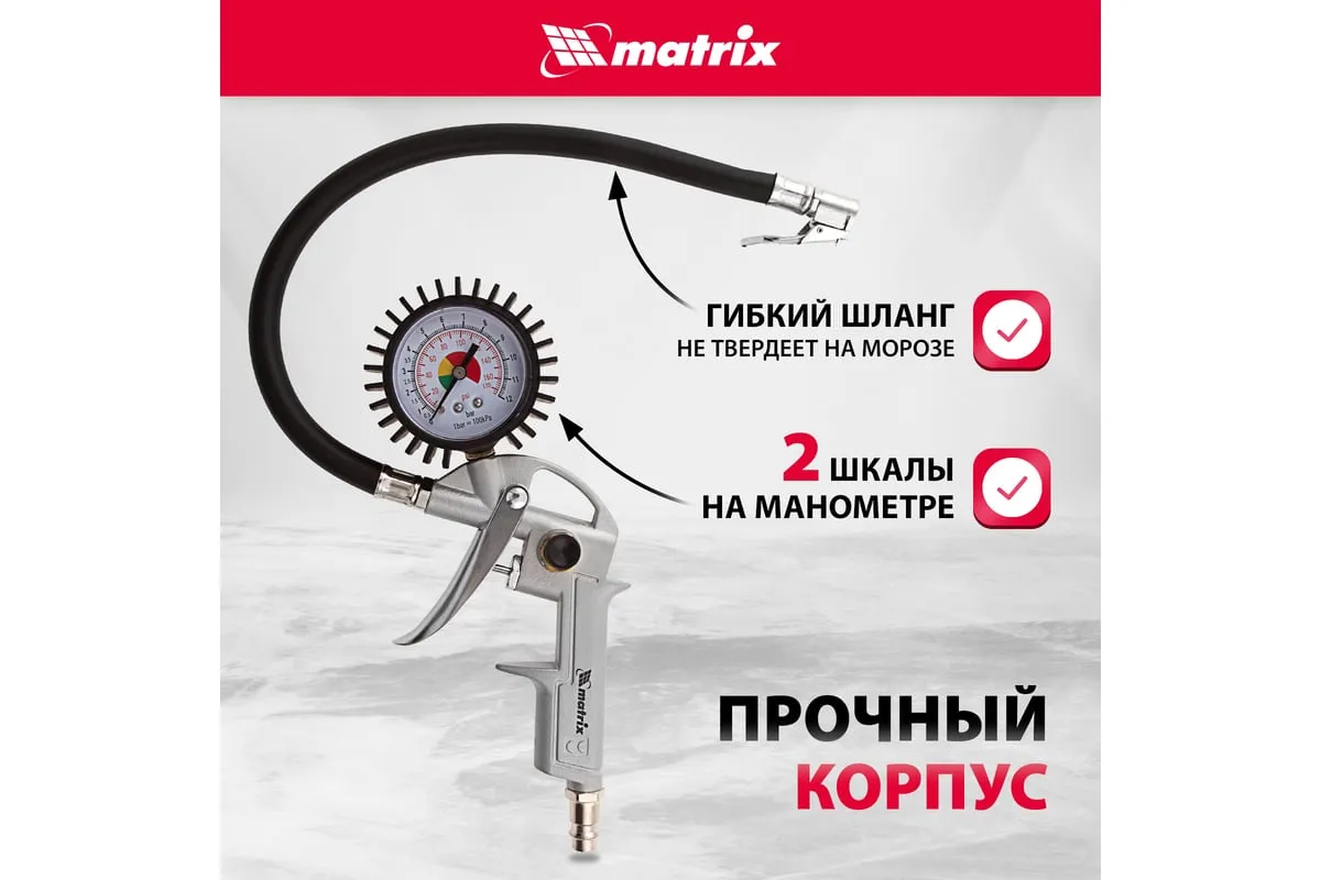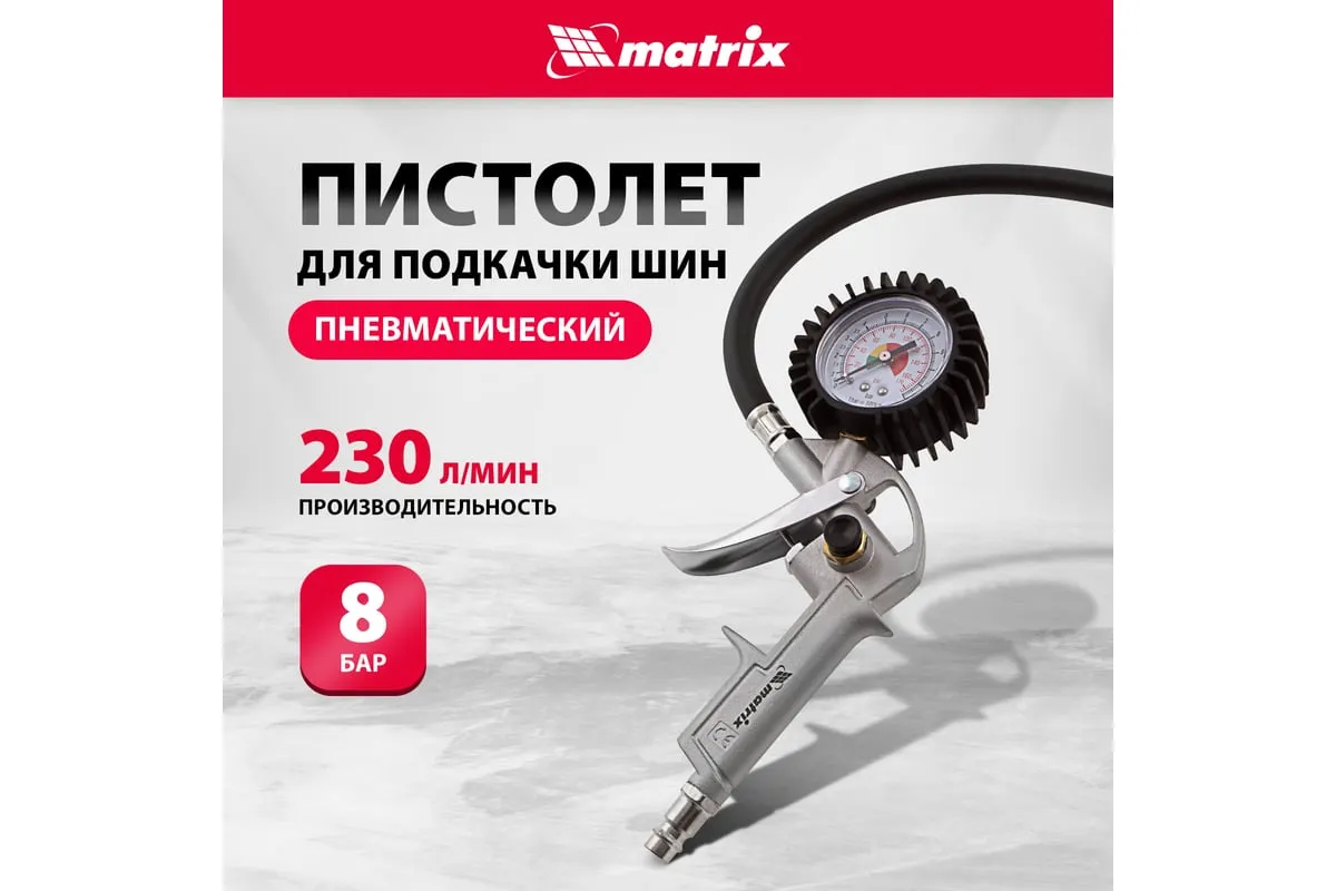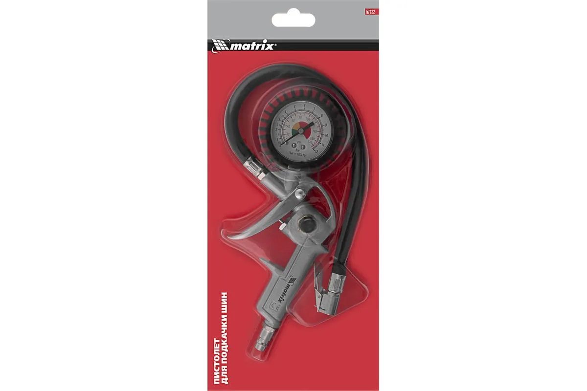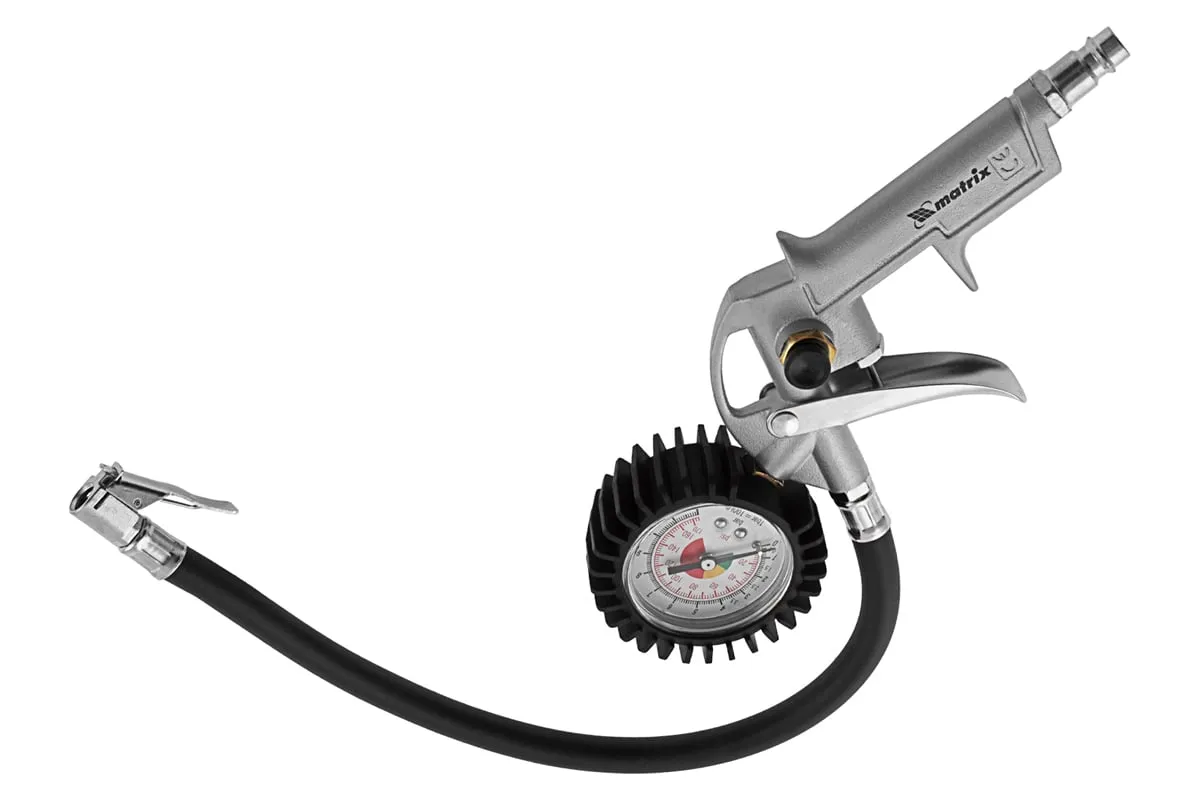 Пневматический пистолет для подкачки шин MATRIX 57322 применяется для подкачки шин в автосервисе, а также в шиномонтажных мастерских. Модель оснащается манометром для контроля рабочего давления в шинах, а также клапаном сброса высокого давления. Благодаря гибкому шлангу обеспечивается легкая работа в узких и труднодоступных местах.