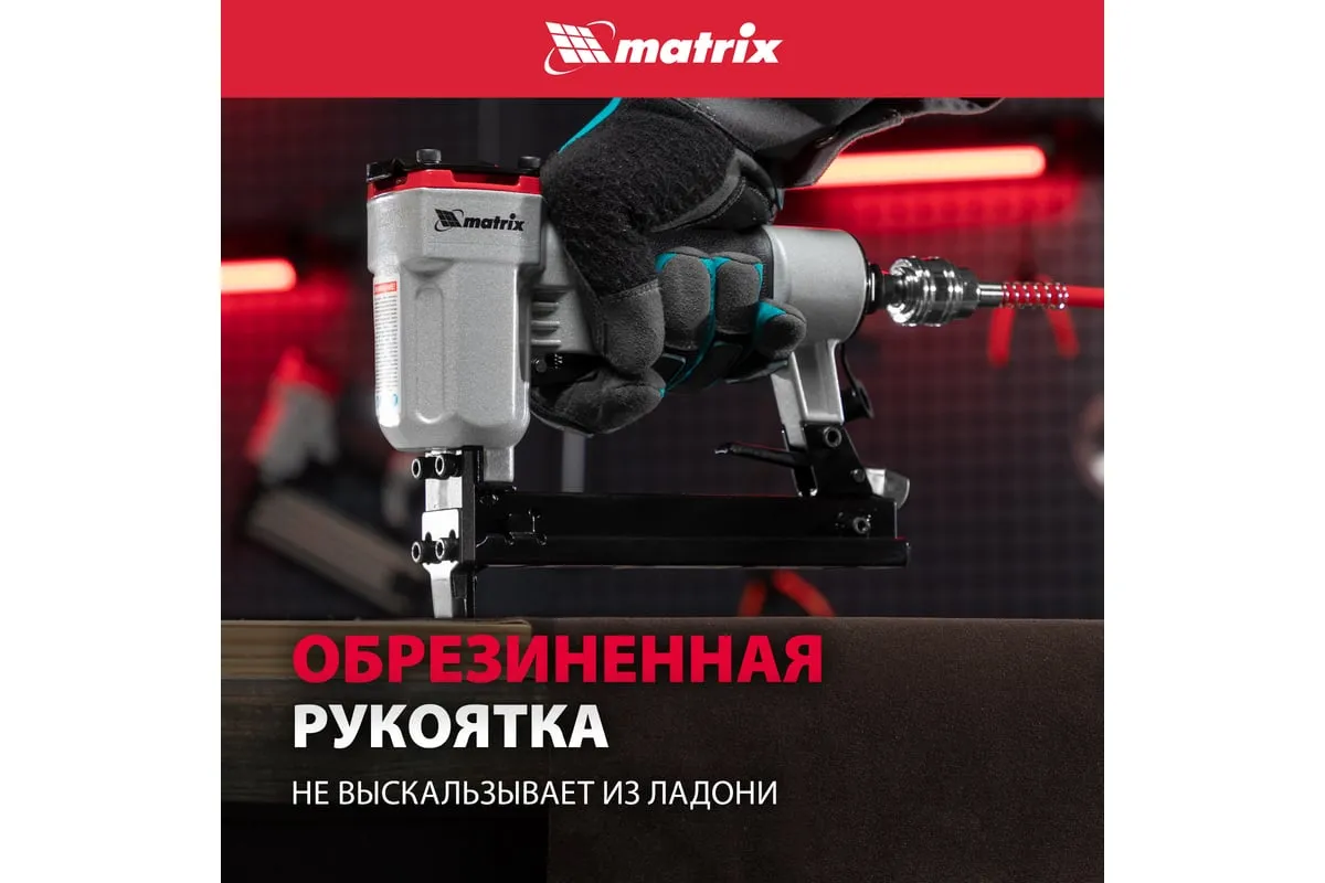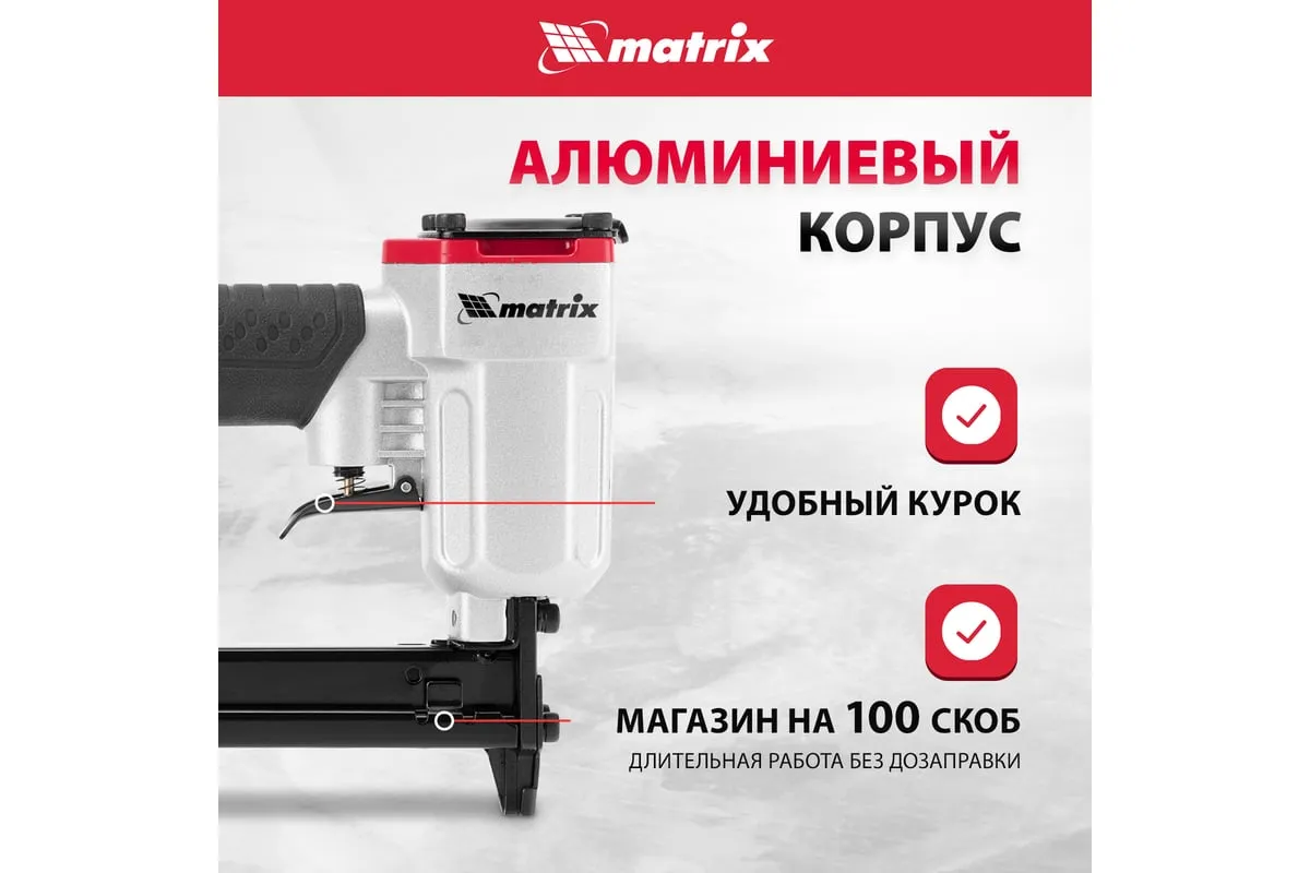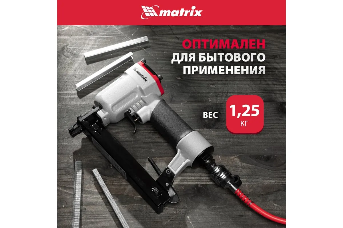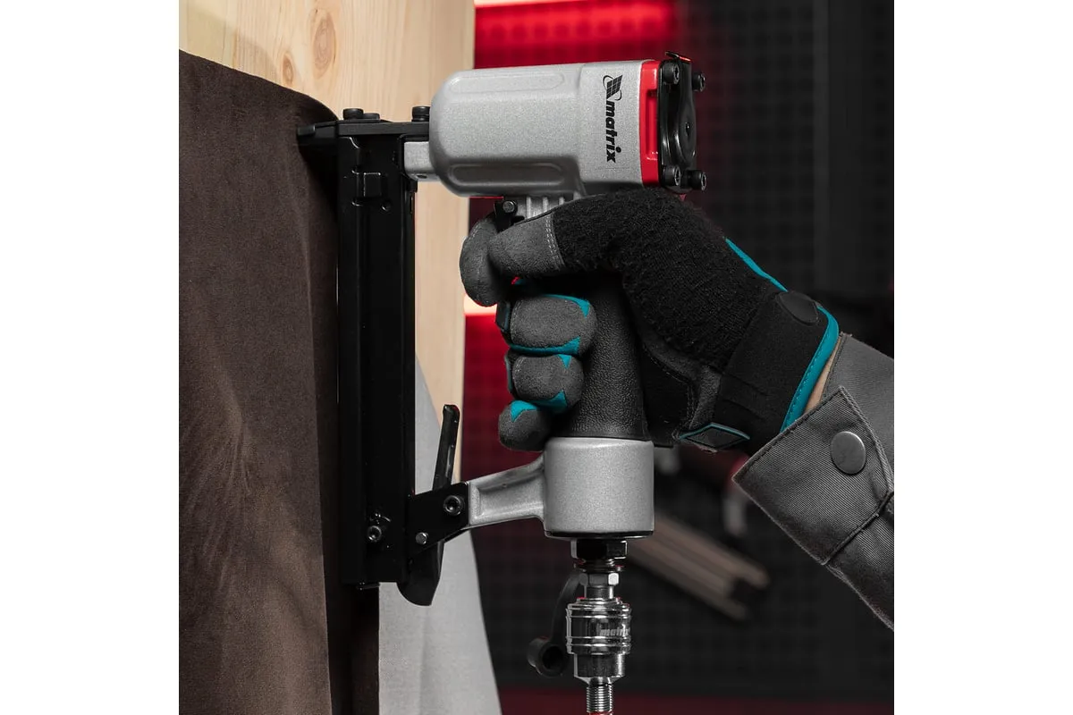Пневматический степлер MATRIX 57420 используется в производственной сфере деятельности, так как обладает высоким уровнем эффективности в работе. Степлер способен быстро и легко забивать скобы в деревянные поверхности, крепя к ним различные материалы, такие как: гипсокартон, фанеру, ДВП, а также кожу, ткань и пр. Степлер имеет магазин на 160 скоб размерами 10 - 22 мм.