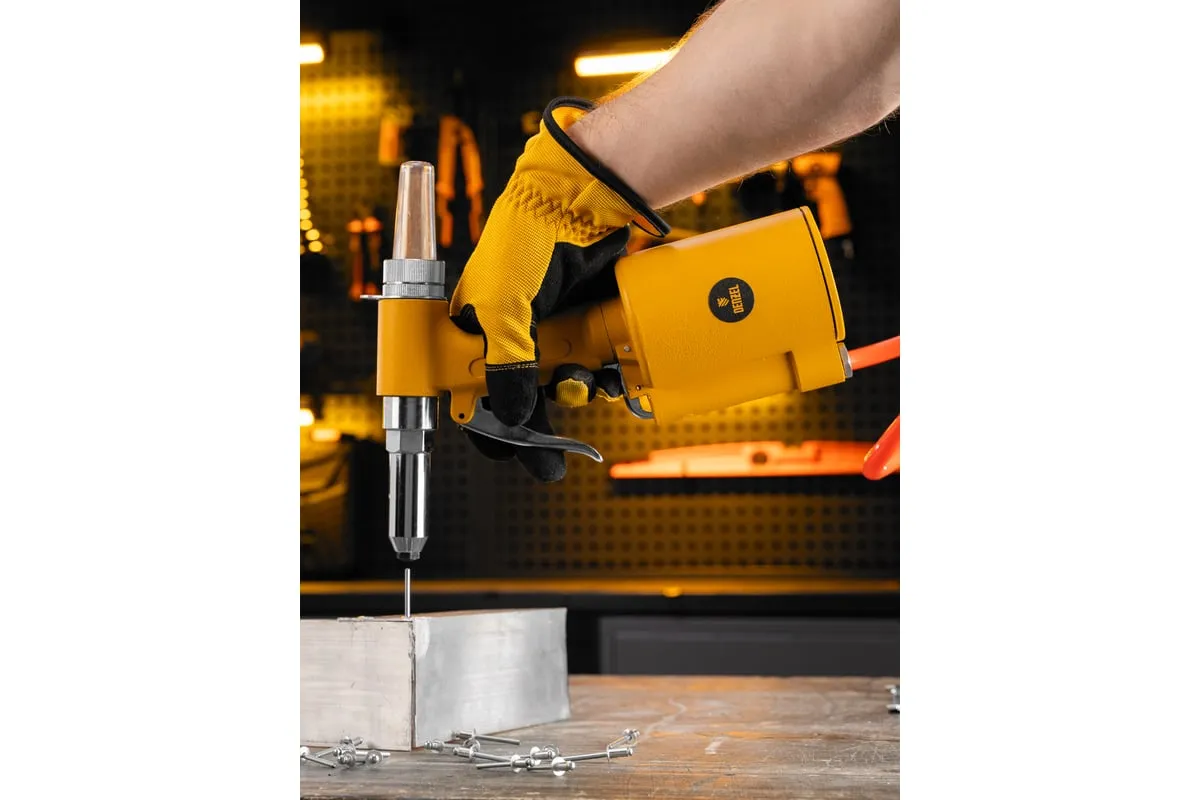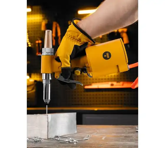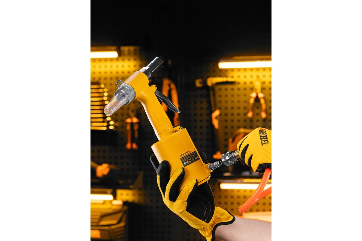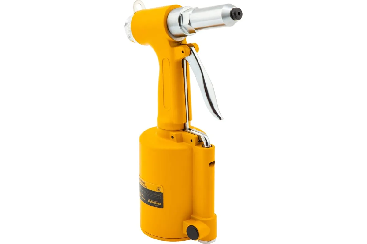 Пистолет для вытяжных заклепок работает под давлением 6,3 АТМ и расходует всего 85 литров воздуха в минуту, поэтому для него подойдет компрессор средней мощности.