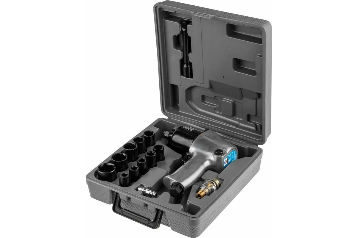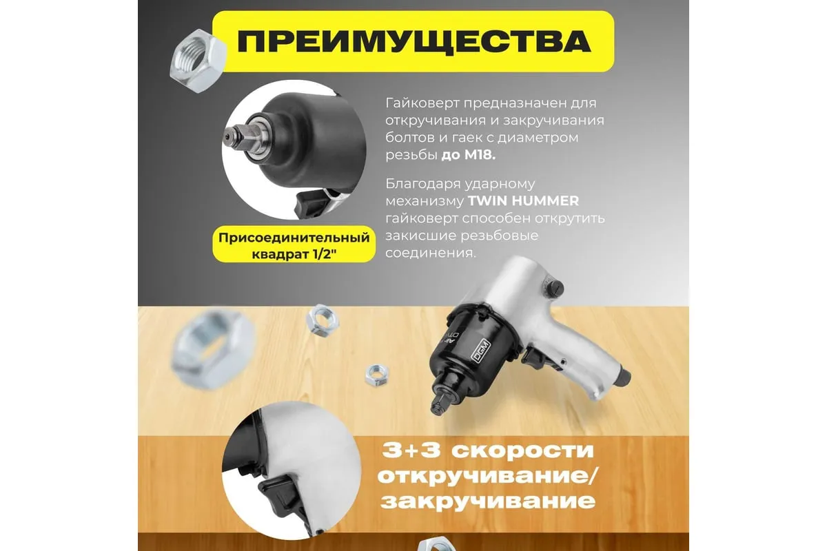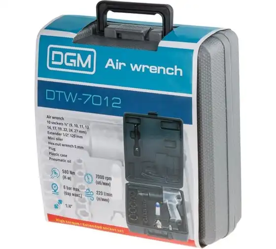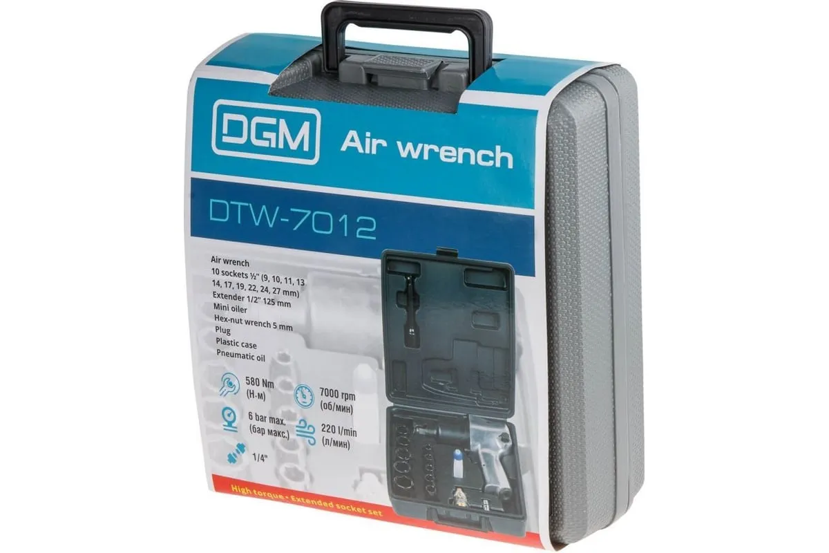 Пневмогайковерт DGM DTW-7012 предназначен для выполнения монтажных и ремонтных работ. Имеет6 уровней крутящего момента. Ударный механизм Twin Hammer позволяет работать с приржавевшими и закисшими крепежными элементами. Для удобного хранения и транспортировкиинструмента в комплект входит пластмассовый чемодан. Крутящий момент 580 Нм Максимальное давление воздуха 6,0 бар Расход воздуха 220 лмин Ударный механизм twin hammer Размер присоединительного квадрата 12 Число оборотов при свободном ходе 7000 обмин Максимальный размер затягиваемой резьбы М18 Резьба штуцера подвода воздуха 1/4