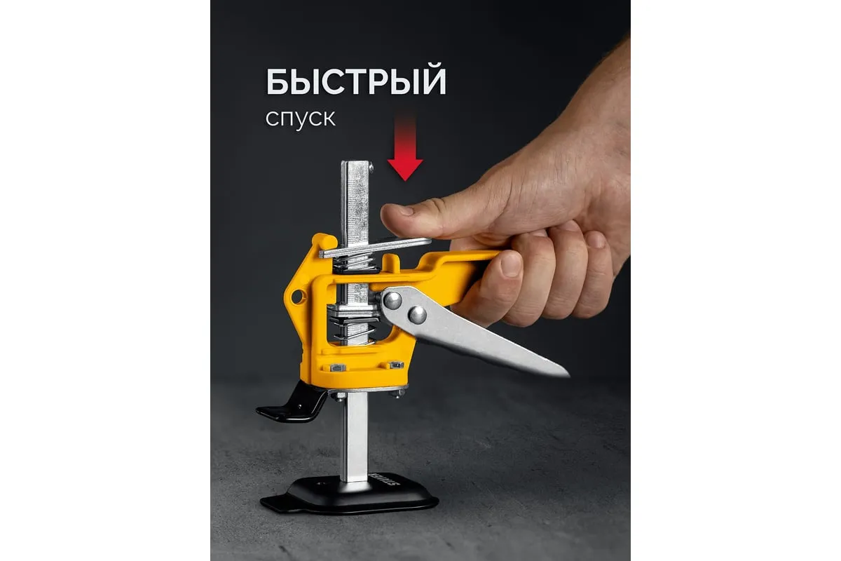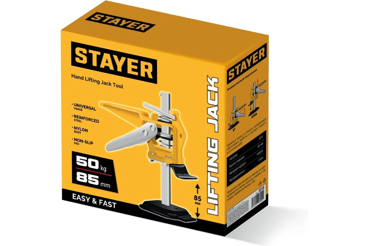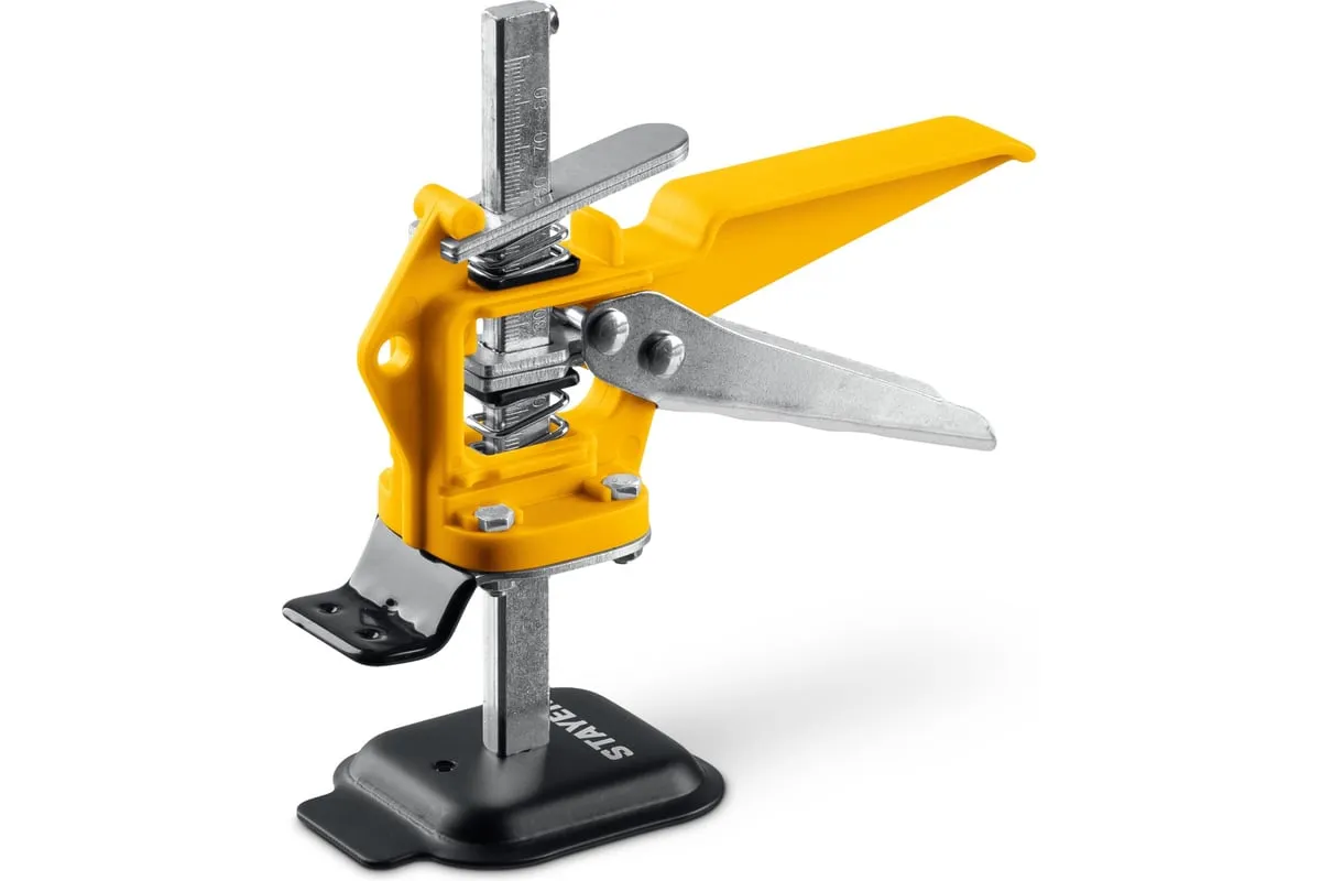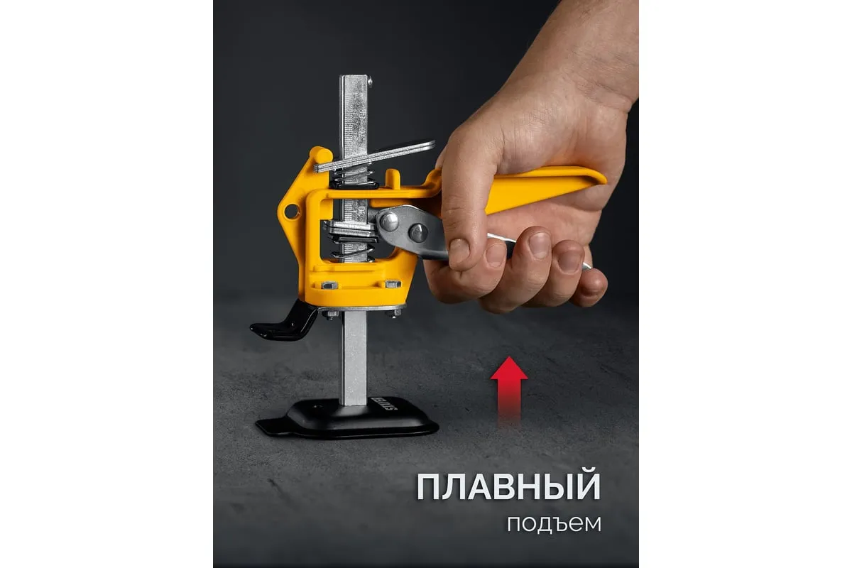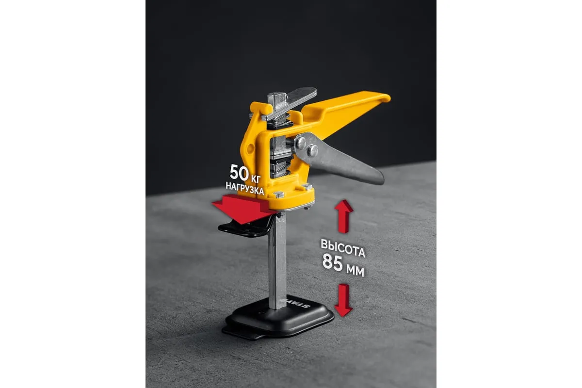 Универсальный подъемник STAYER надежный помощник при проведении монтажных работ тяжелых и крупногабаритных предметов, таких как: крупноформатная плитка, кухонные гарнитуры и шкафы, двери и различные панели. Подъемник может поднять груз до 50 кг на высоту до 84 мм. Прорезиненная лапка защищает поднимаемый предмет от повреждений и соскальзывания.
