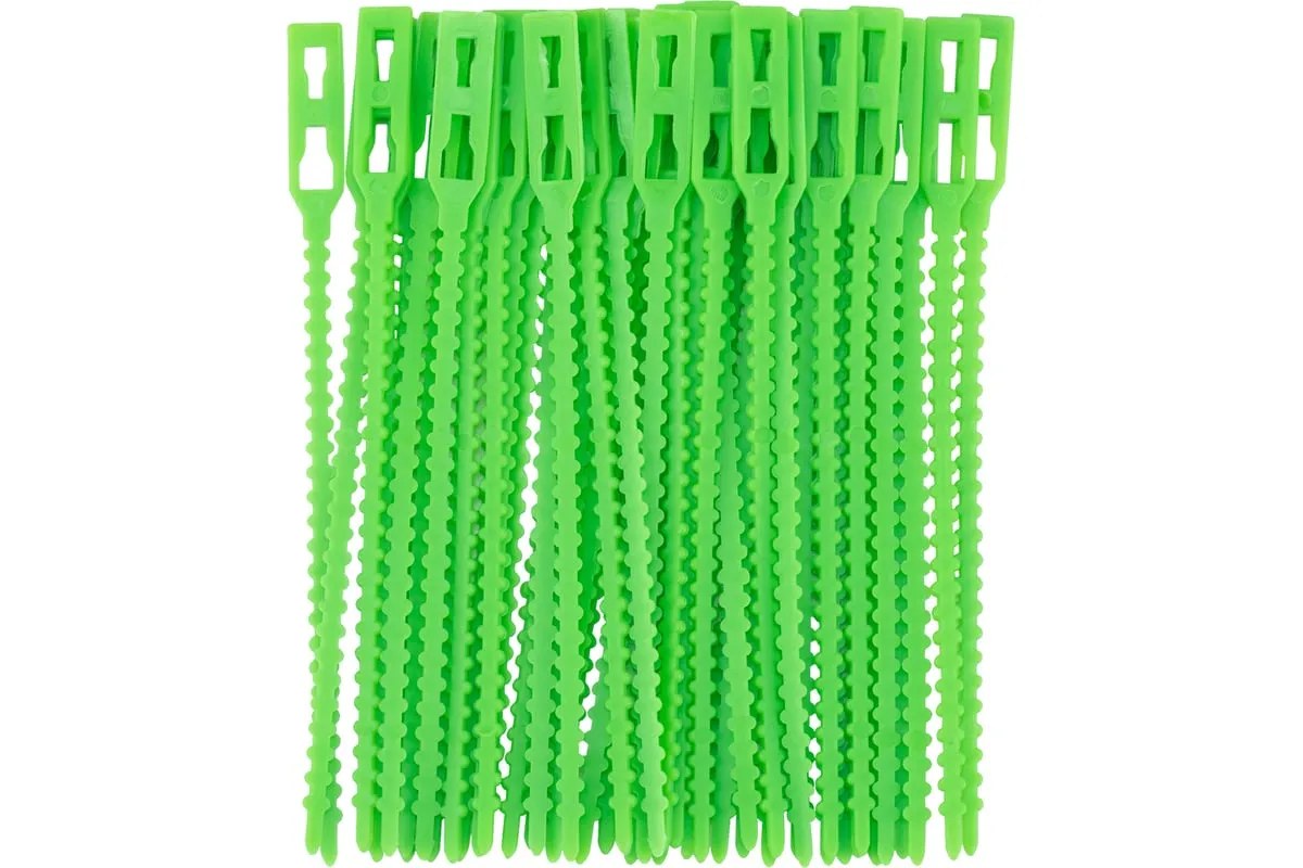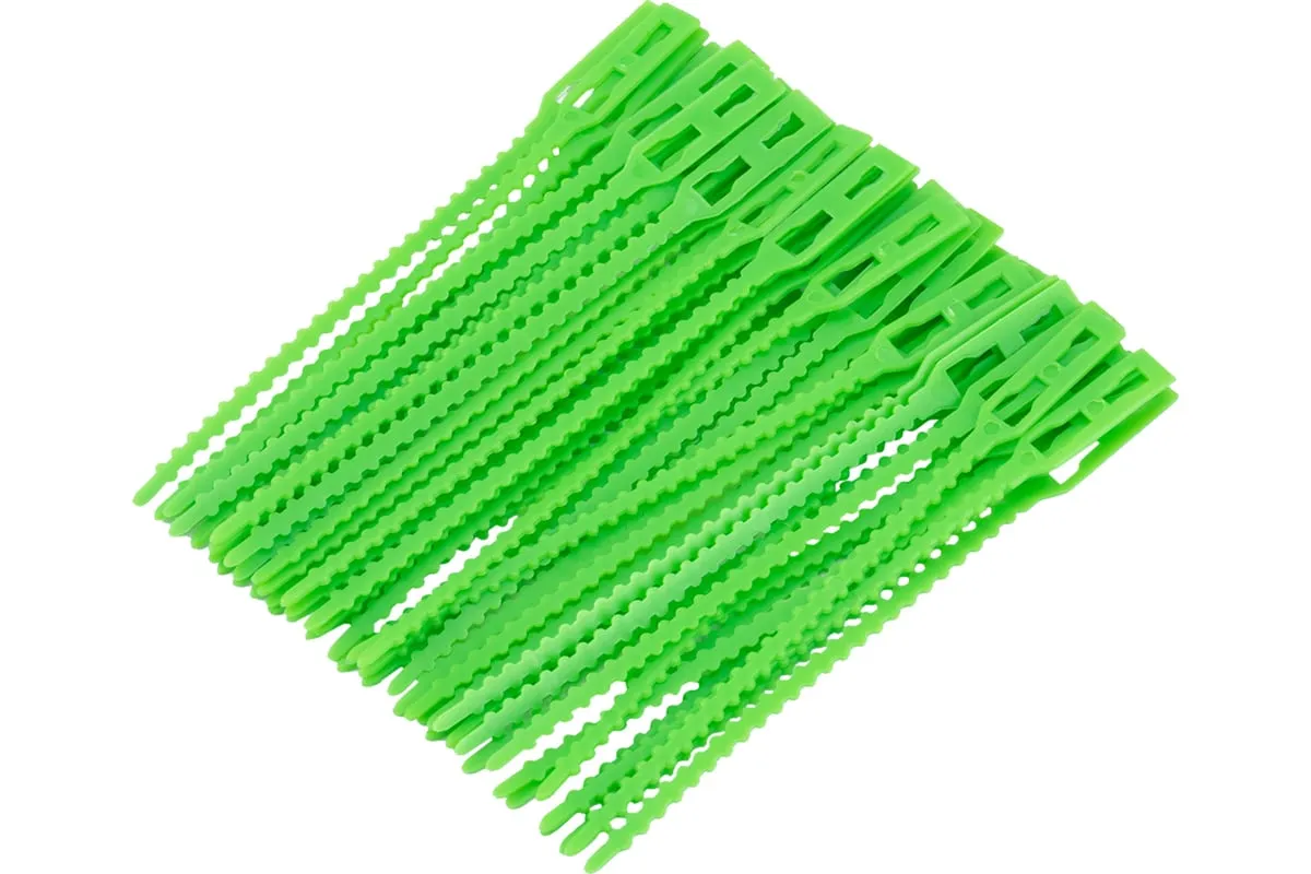 Пластиковые подвязки Palisad 64494 длиной 13 см, 50 шт., используются для садовых растений. Они обеспечивают бережную поддержку ветвей и стеблей с помощью колышков при плодоношении. Подвязанные растения получают больше солнечного света, плоды не соприкасаются с землей, поэтому защищены от вредителей.