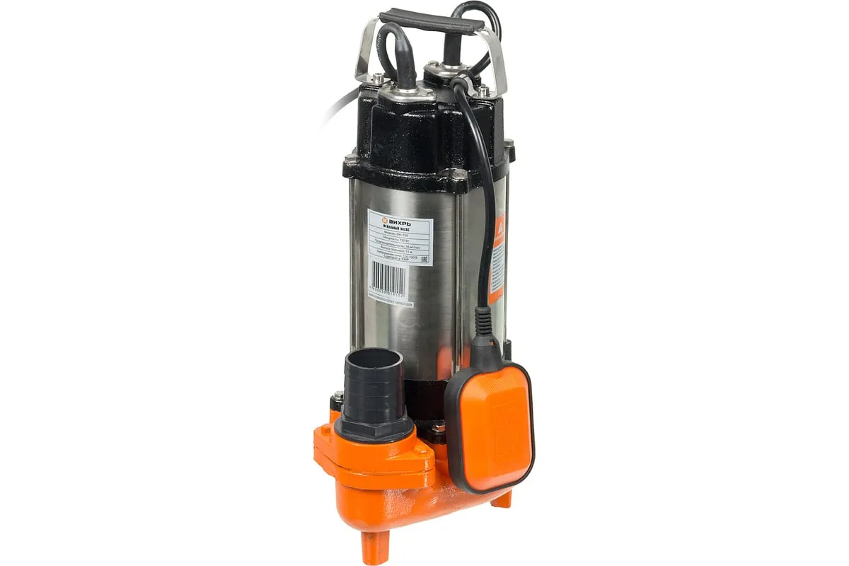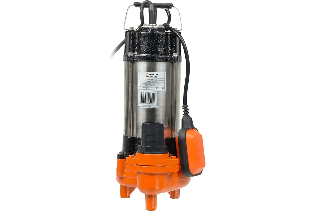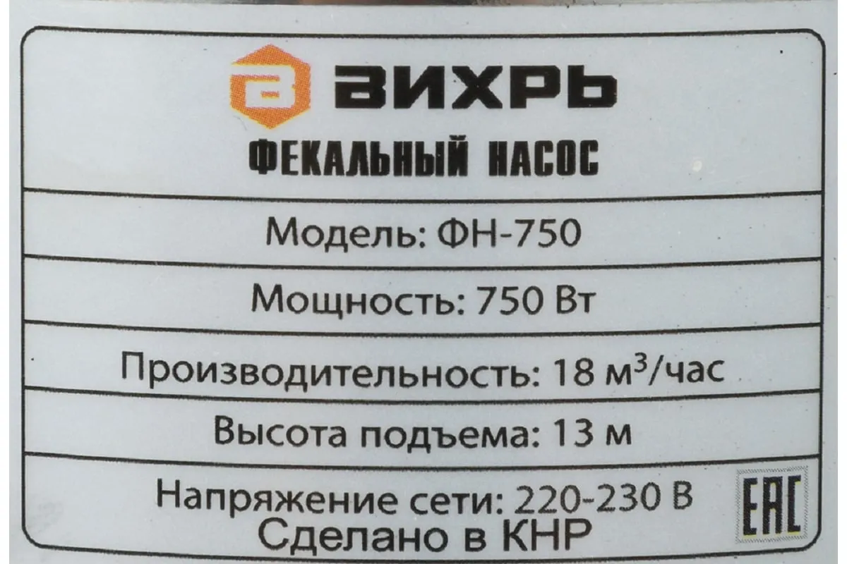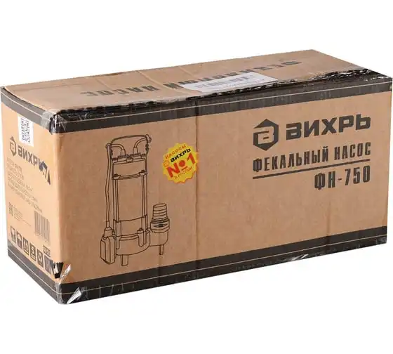 Модель Вихрь ФН-750 оснащена однофазным, асинхронным электродвигателем мощностью 750 Вт и поплавковым выключателем, отрегулированным на определённый уровень срабатывания. Максимальная подача – 350 л/мин. Напор – 15.5 м. Выходное отверстие – 2". Охлаждение агрегата осуществляется благодаря наличию специальной камеры. В конструкцию входит также клапан, предотвращающий образование воздушных пробок. Питание насоса осуществляется от электросети 220В, 50 Гц.