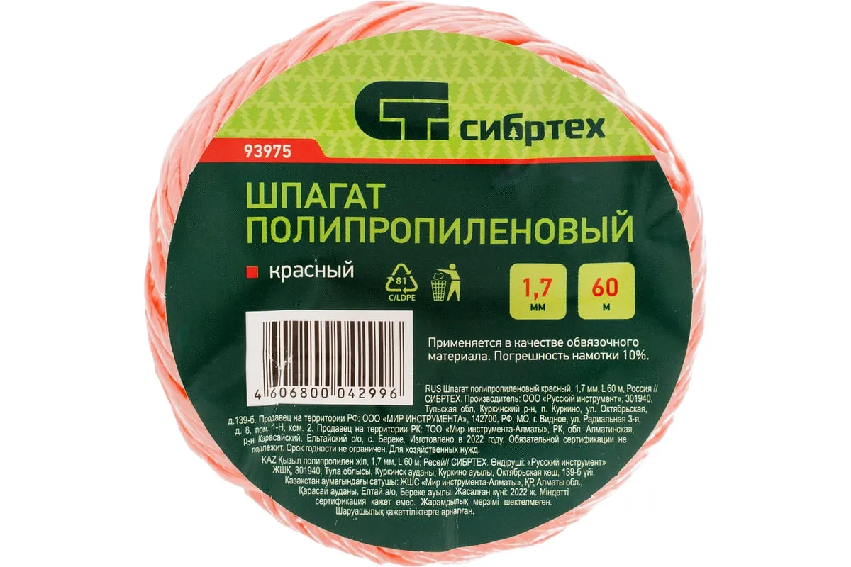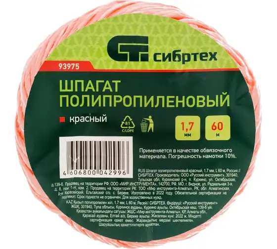 Красный полипропиленовый шпагат Сибртех 93975 диаметром 1,7 мм и длиной 60 м используется для упаковки грузов, связывания предметов, подвязки растений и решения других задач. Шпагат имеет многониточную свивку и выдерживает разрывную нагрузку 50 кгс, поэтому очень надежен. Длины 60 м достаточно для выполнения работ большого объема. Бобину можно разматывать как с внутренней, так и с наружной стороны. Шпагат будет полезен в сельском хозяйстве, на складе, производстве, а также дома или на даче.