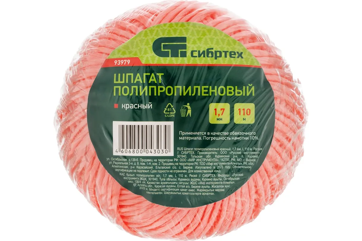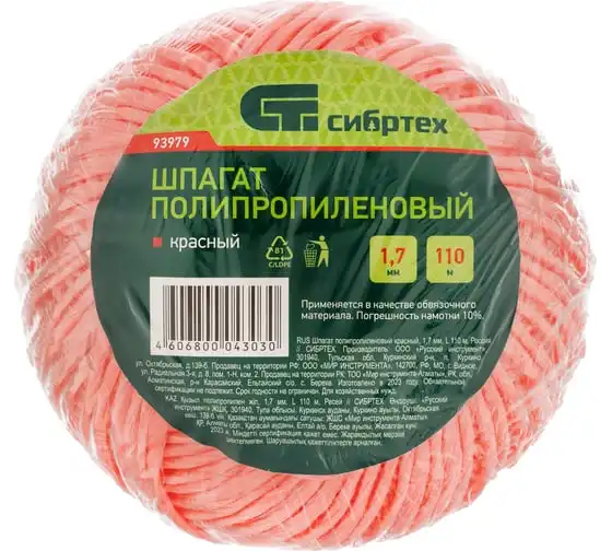 Красный полипропиленовый шпагат Сибртех 93979 диаметром 1,7 мм и длиной 110 м используется для упаковки грузов, связывания предметов, подвязки растений и решения других задач. Шпагат имеет многониточную свивку и выдерживает разрывную нагрузку 50 кгс, поэтому очень надежен. Длины 110 м достаточно для выполнения работ большого объема. Бобину можно разматывать как с внутренней, так и с наружной стороны. Шпагат будет полезен в сельском хозяйстве, на складе, производстве, а также дома или на даче.
