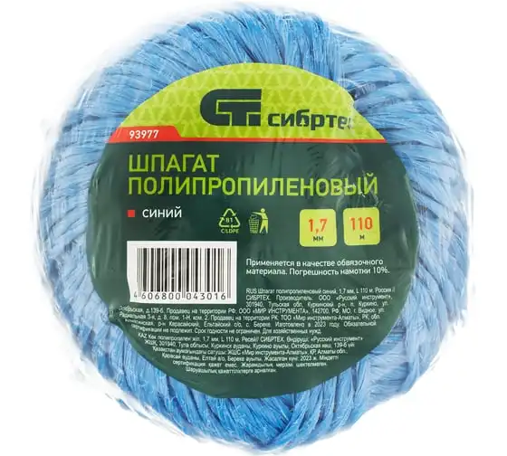 Синий полипропиленовый шпагат Сибртех 93977 диаметром 1,7 мм и длиной 110 м используется для упаковки грузов, связывания предметов, подвязки растений и решения других задач. Шпагат имеет многониточную свивку и выдерживает разрывную нагрузку 50 кгс, поэтому очень надежен. Длины 110 м достаточно для выполнения работ большого объема. Бобину можно разматывать как с внутренней, так и с наружной стороны. Шпагат будет полезен в сельском хозяйстве, на складе, производстве, а также дома или на даче.