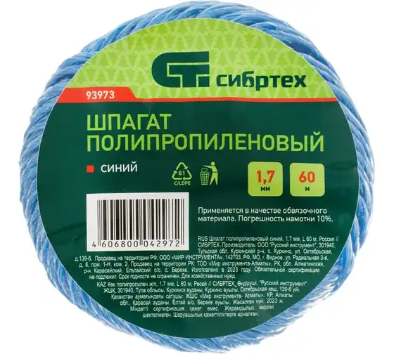 Синий полипропиленовый шпагат Сибртех 93973 диаметром 1,7 мм и длиной 60 м используется для упаковки грузов, связывания предметов, подвязки растений и решения других задач. Шпагат имеет многониточную свивку и выдерживает разрывную нагрузку 50 кгс, поэтому очень надежен. Длины 60 м достаточно для выполнения работ большого объема. Бобину можно разматывать как с внутренней, так и с наружной стороны. Шпагат будет полезен в сельском хозяйстве, на складе, производстве, а также дома или на даче.