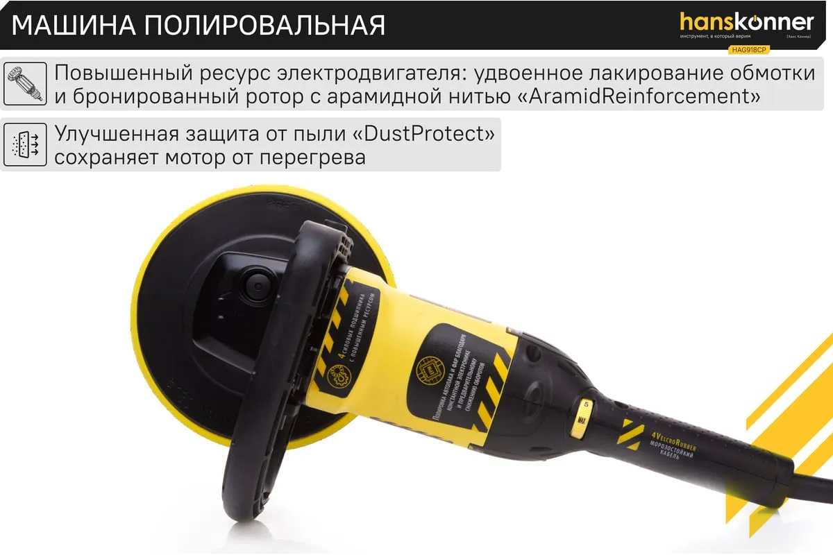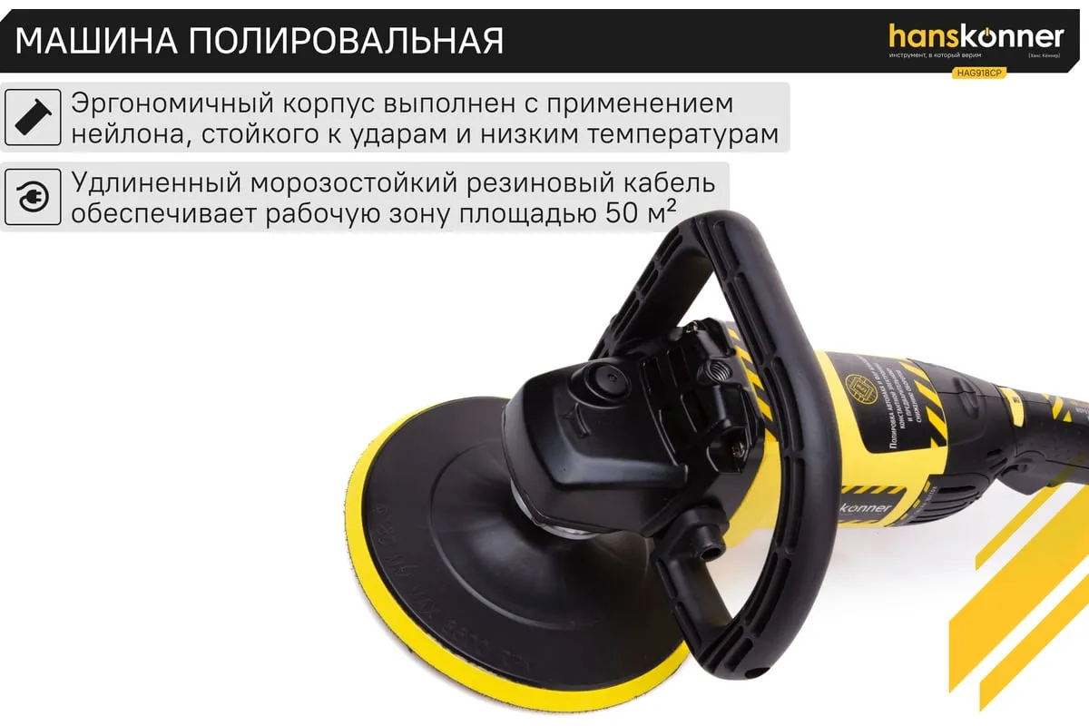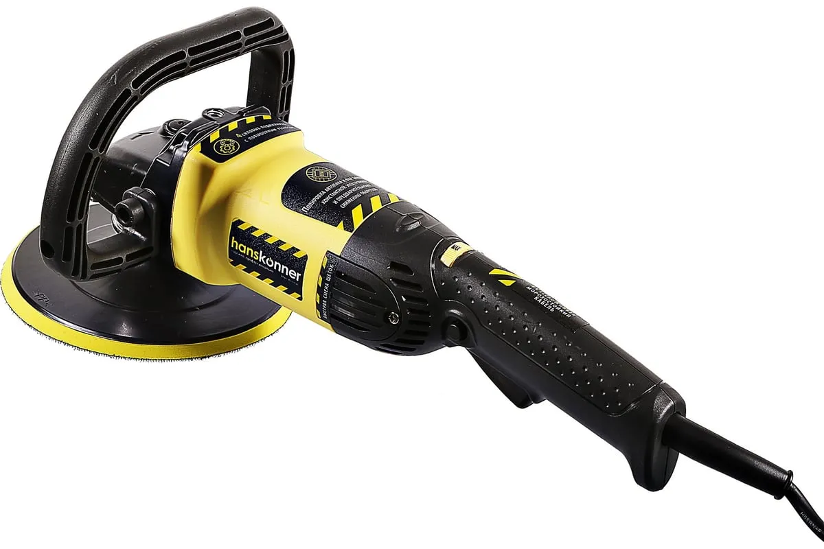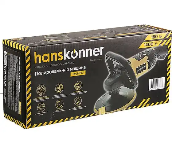 Hanskonner HAG918CP – мощная универсальная полировальная машина под рабочий диаметр диска 180 мм. Имеет компоновку с длинной рукоятью и рассчитана под двуручный хват, благодаря чему достигается наилучший контроль в процессе работы. Также, комфорту эксплуатации инструмента, способствуют его выверенные массогабаритные показатели, нейтральный центр тяжести и отличная эргономика. Модель оснащена производительным 1400 Вт электромотором, запас мощности которого позволяет эффективное использование машины не только при полировке мелких элементов, но и при обработке больших плоскостей. Важной особенностью полировальной машины Hanskonner HAG918CP является наличие электронного блока EPM (Electronic Power Manager), который позволяет поддерживать стабильную частоту вращения на валу шпинделя под нагрузкой, обеспечивает плавный пуск и возможность регулировки оборотов в широком диапазоне (500 – 3000 об/ мин) – пользователь может настроить оптимальную частоту вращения вала шпинделя в соответствии с обрабатываемым материалом и типом полировальной пасты. Для обеспечения высокой надежности инструмента особое внимание уделено наиболее нагруженным элементам конструкции: электромотор покрыт несколькими изоляционными слоями термостойкого лака, повышенной прочностью обладают шестерни редуктора, используются высококачественные фирменные подшипники NSK. Назначение: для качественного полирования изделий из металла, древесины, пластмассы.