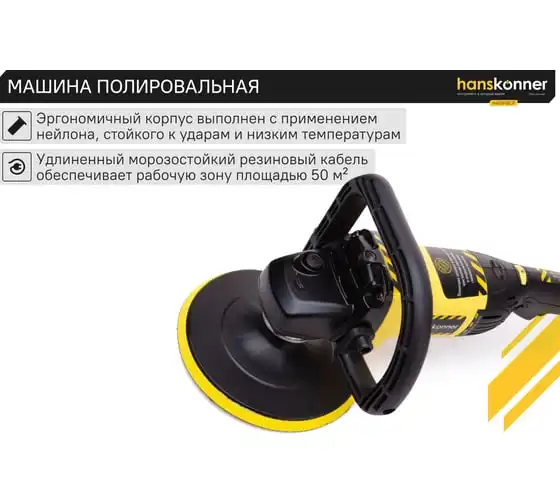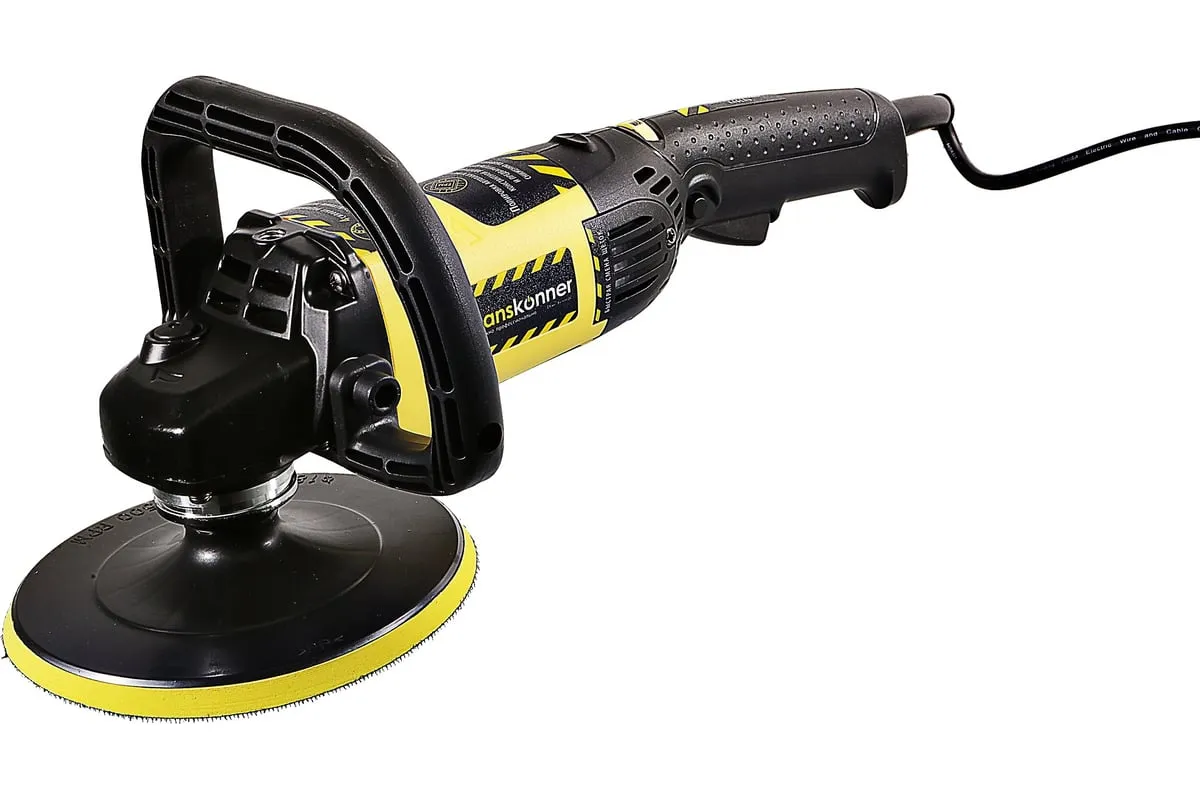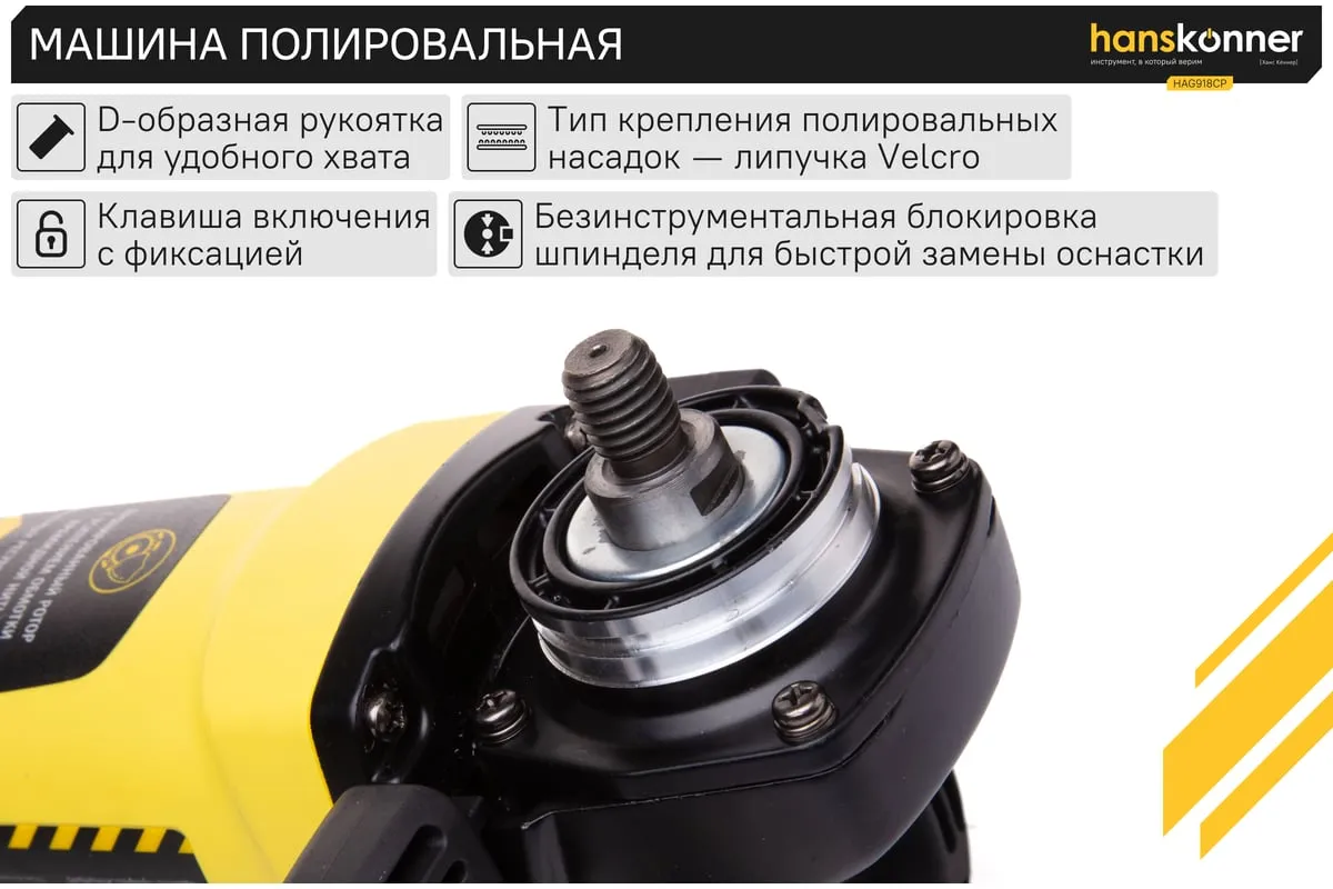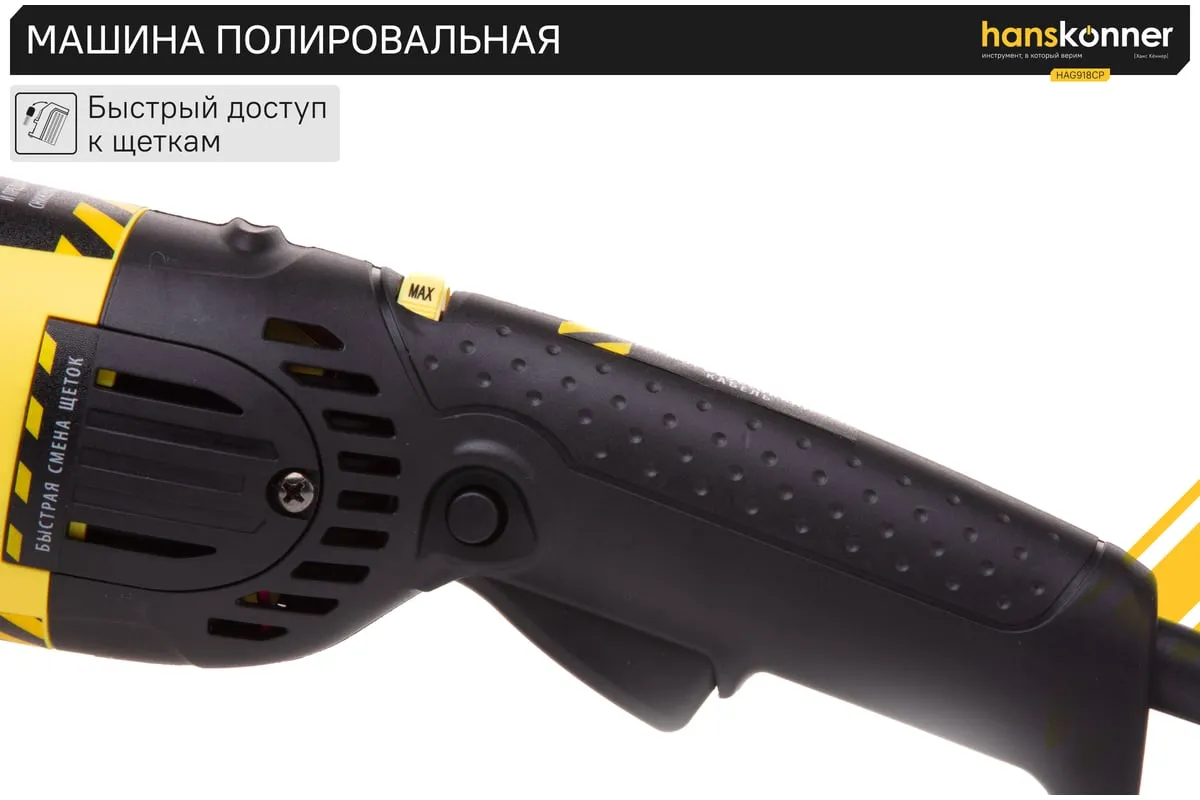 Hanskonner HAG918CP – мощная универсальная полировальная машина под рабочий диаметр диска 180 мм. Имеет компоновку с длинной рукоятью и рассчитана под двуручный хват, благодаря чему достигается наилучший контроль в процессе работы. Также, комфорту эксплуатации инструмента, способствуют его выверенные массогабаритные показатели, нейтральный центр тяжести и отличная эргономика. Модель оснащена производительным 1400 Вт электромотором, запас мощности которого позволяет эффективное использование машины не только при полировке мелких элементов, но и при обработке больших плоскостей. Важной особенностью полировальной машины Hanskonner HAG918CP является наличие электронного блока EPM (Electronic Power Manager), который позволяет поддерживать стабильную частоту вращения на валу шпинделя под нагрузкой, обеспечивает плавный пуск и возможность регулировки оборотов в широком диапазоне (500 – 3000 об/ мин) – пользователь может настроить оптимальную частоту вращения вала шпинделя в соответствии с обрабатываемым материалом и типом полировальной пасты. Для обеспечения высокой надежности инструмента особое внимание уделено наиболее нагруженным элементам конструкции: электромотор покрыт несколькими изоляционными слоями термостойкого лака, повышенной прочностью обладают шестерни редуктора, используются высококачественные фирменные подшипники NSK. Назначение: для качественного полирования изделий из металла, древесины, пластмассы.