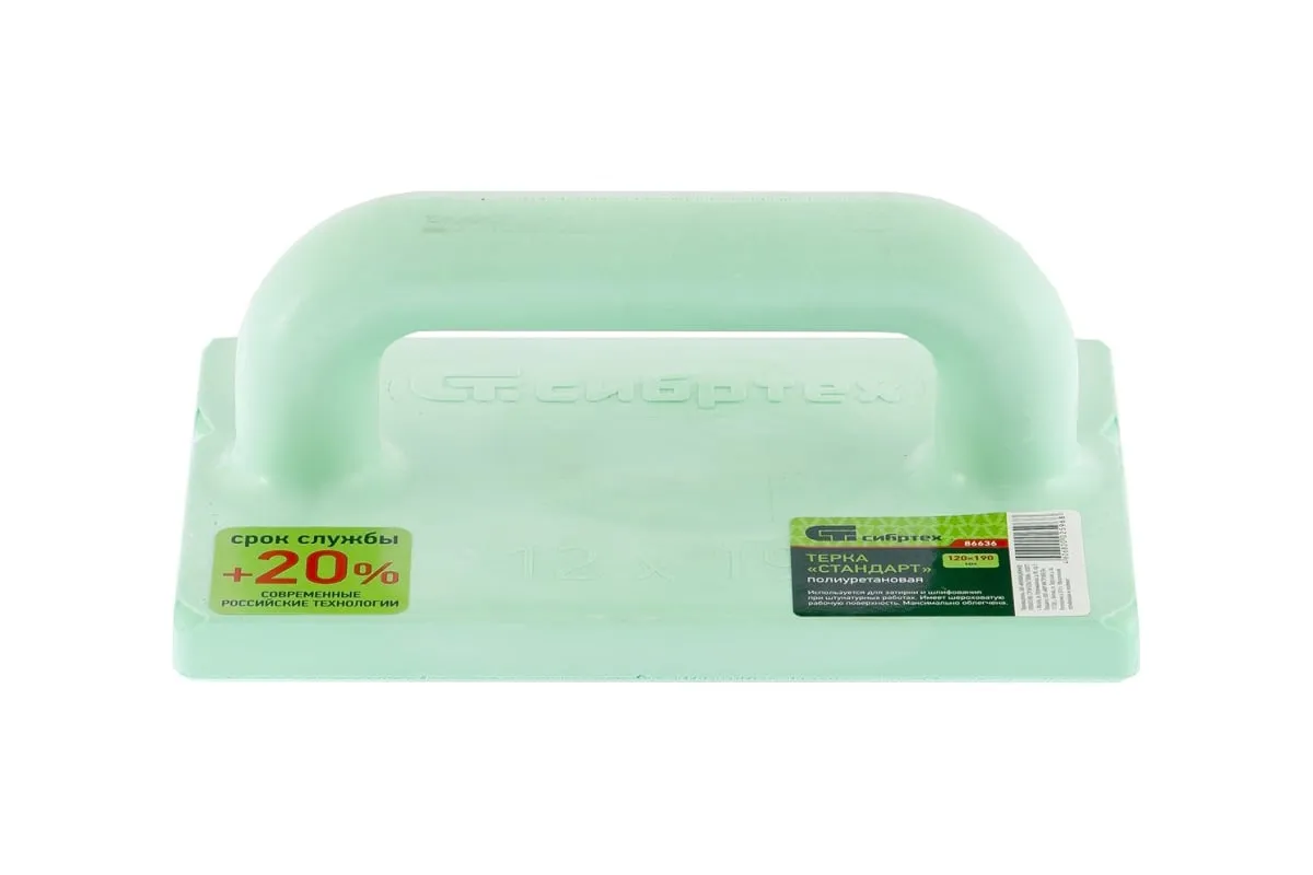 Полиуретановая терка СИБРТЕХ 86636 устойчива к стиранию. Рабочая поверхность изготовлена из полиуретана, этот материал обладает большим эксплуатационным ресурсом. С помощью такого инструмента можно затирать швы или шлифовать поверхность во время проведения штукатурных работ.