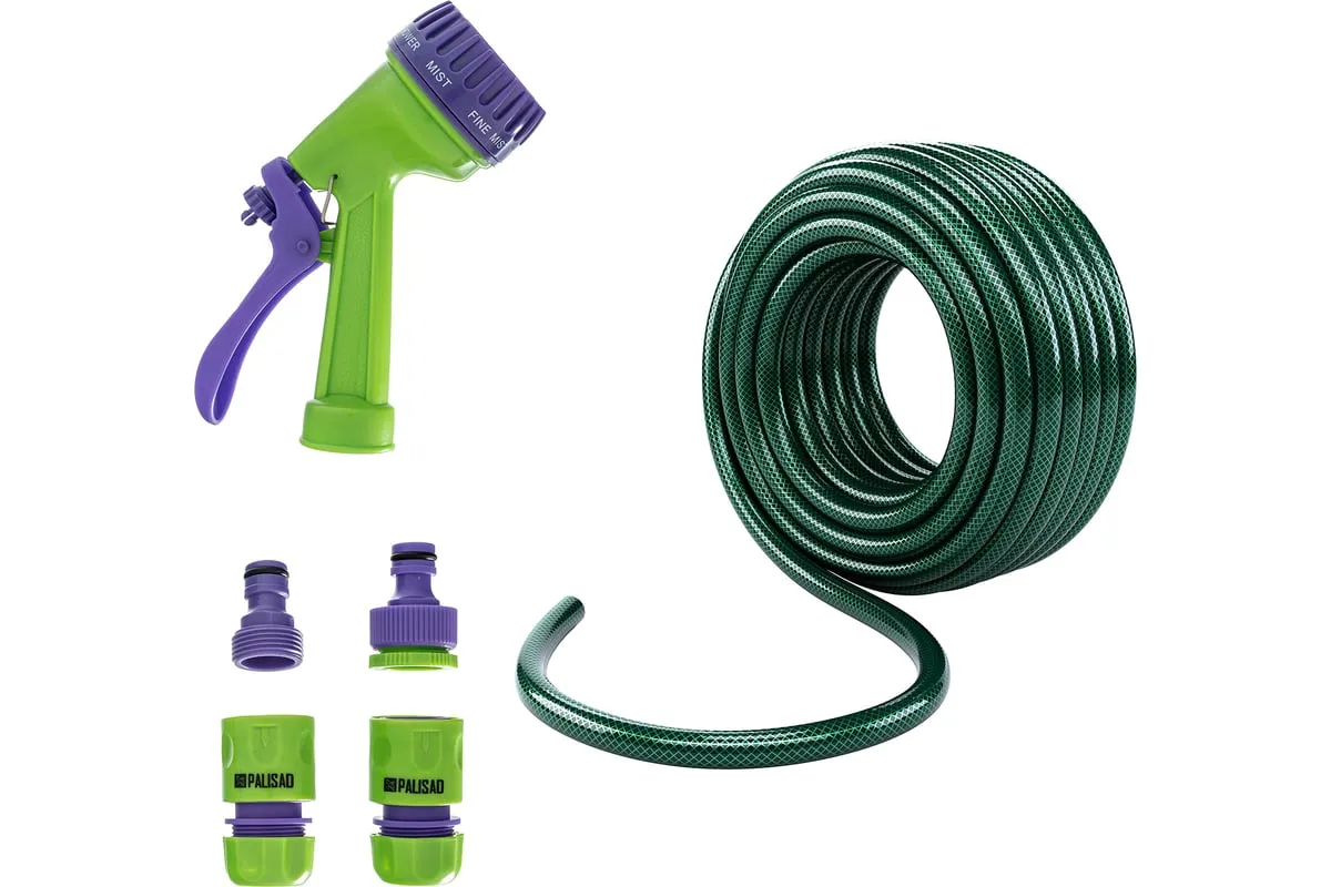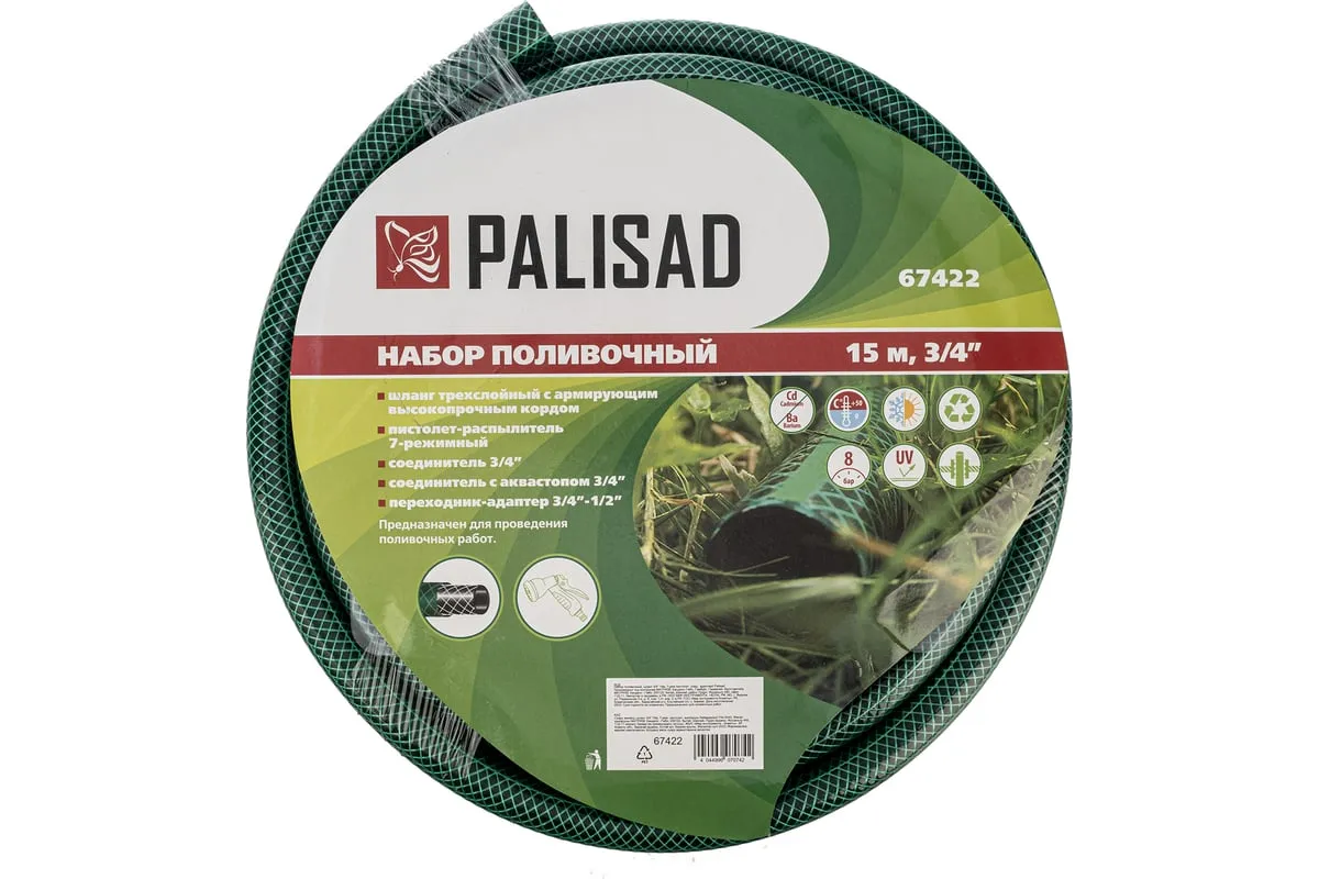 Поливочный набор Palisad 67422 состоит из шланга диаметром 3/4 дюйма и длиной 15 м, 7-режимного пистолета, соединителей и адаптера. Подключается к источнику водоснабжения через отвод или кран с внешней резьбой диаметром 3/4 или 1/2 дюйма. Трехслойный шланг с армирующим слоем отличается повышенной прочностью и выдерживает давление до 10 бар. Он хорошо держит форму, не скручивается и рассчитан на интенсивное использование. Набор полностью готов к работе и будет полезен для ухода за дачным участком, парком или сквером.