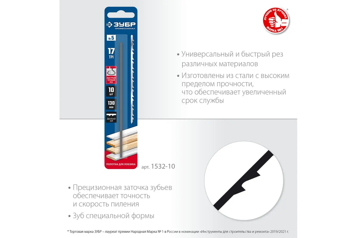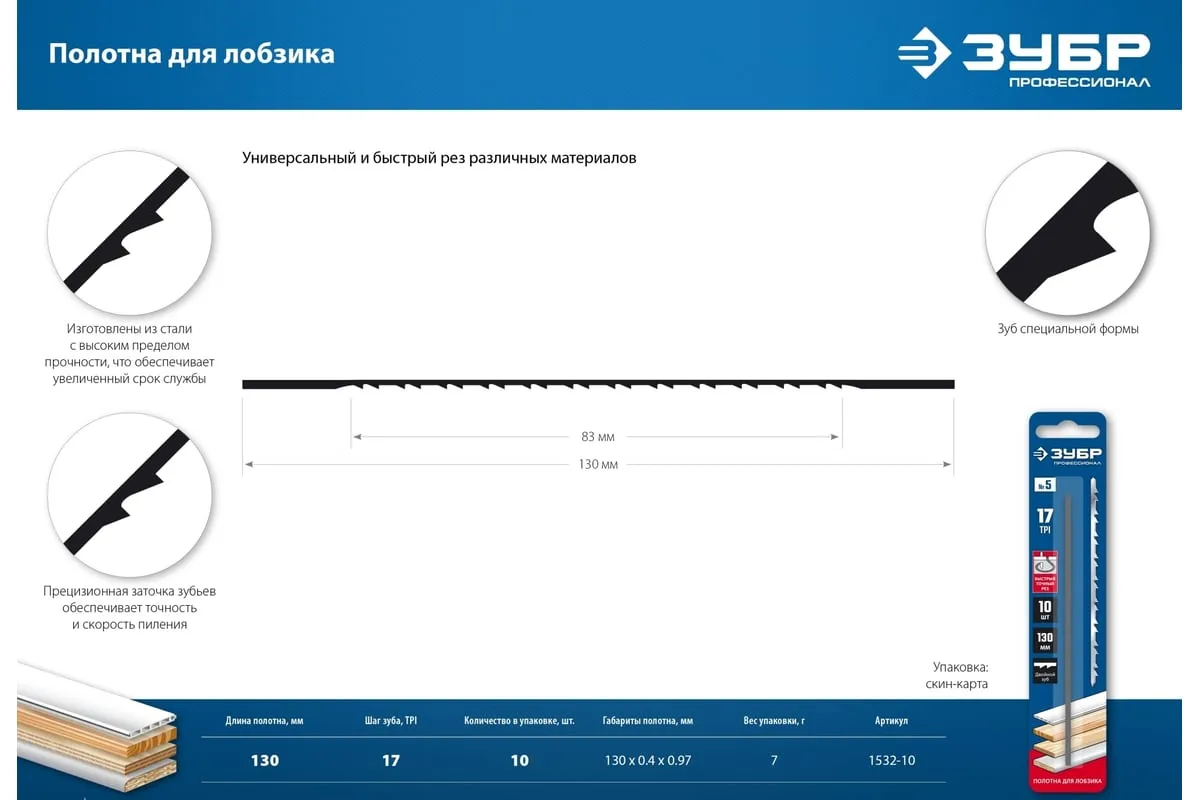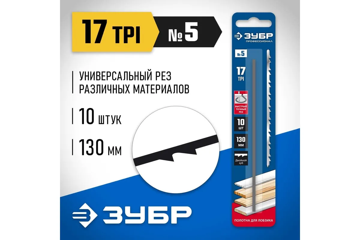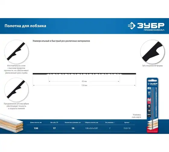 Полотно ЗУБР 1532-10 применяется как сменный элемент для лобзика. Применяется для разрезания различных материалов: фанеры, ДВП, пластиковых панелей. Специальная заточка двойных зубьев обеспечивает быстрый, аккуратный и легкий рез при небольших усилиях. Технические характеристики:
