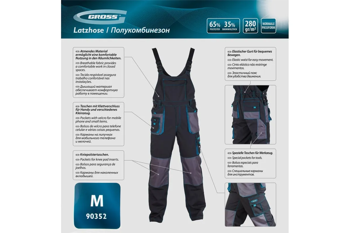 Полукомбинезон Gross 90352 размера M рассчитан на рост 173-179 см и предназначен для защиты рабочего от механических повреждений, ветра и пыли. Может применяться в отапливаемых помещениях или на улице в теплое время года.