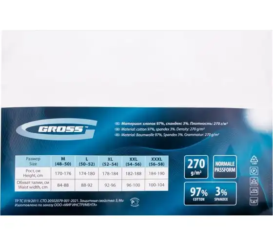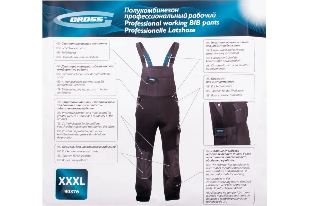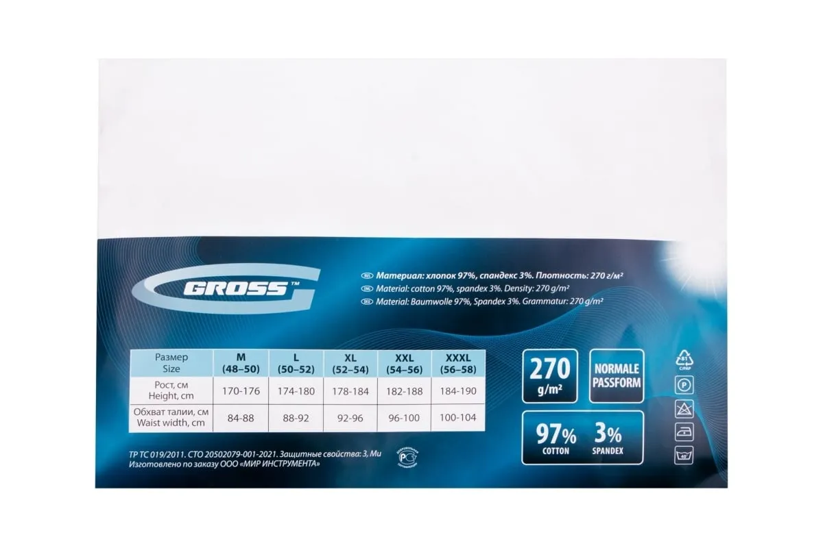 Полукомбинезон Gross 90374 размера XL, состоящий на 97% из хлопка и на 3% из спандекса, защищает рабочего от производственных загрязнений и мелких травм. Используется в теплое время года и в отапливаемых помещениях.