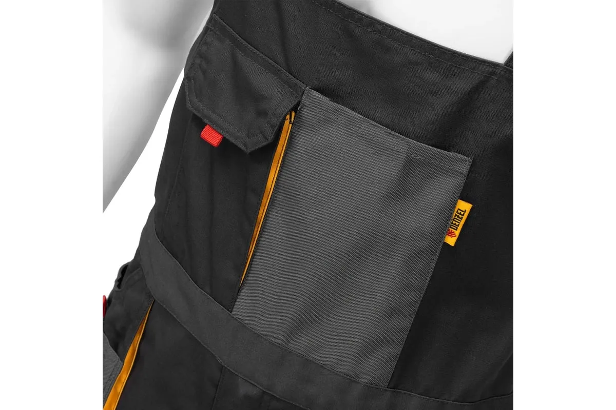 Рабочий полукомбинезон Denzel 90389 размера XL рассчитан на рост 180-186 см и используется для выполнения профессиональных строительных, ремонтных и производственных работ в теплое время года или в отапливаемом помещении. Защищает пользователя от общих производственных загрязнений, нетоксичной пыли, ветра и незначительных механических воздействий. Изготовлен из ткани плотностью 260 г/м2 (65% полиэстер, 35% хлопок). За счет наличия хлопковых волокон в составе ткань хорошо пропускает воздух и приятна на теле, полиэстер обеспечивает устойчивость к истиранию. Полукомбинезон выполнен в практичном темно-сером цвете.