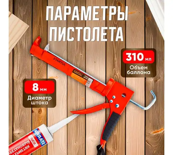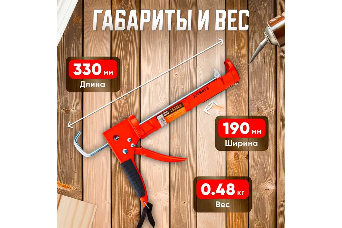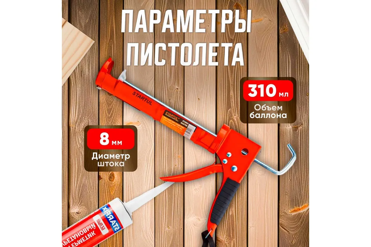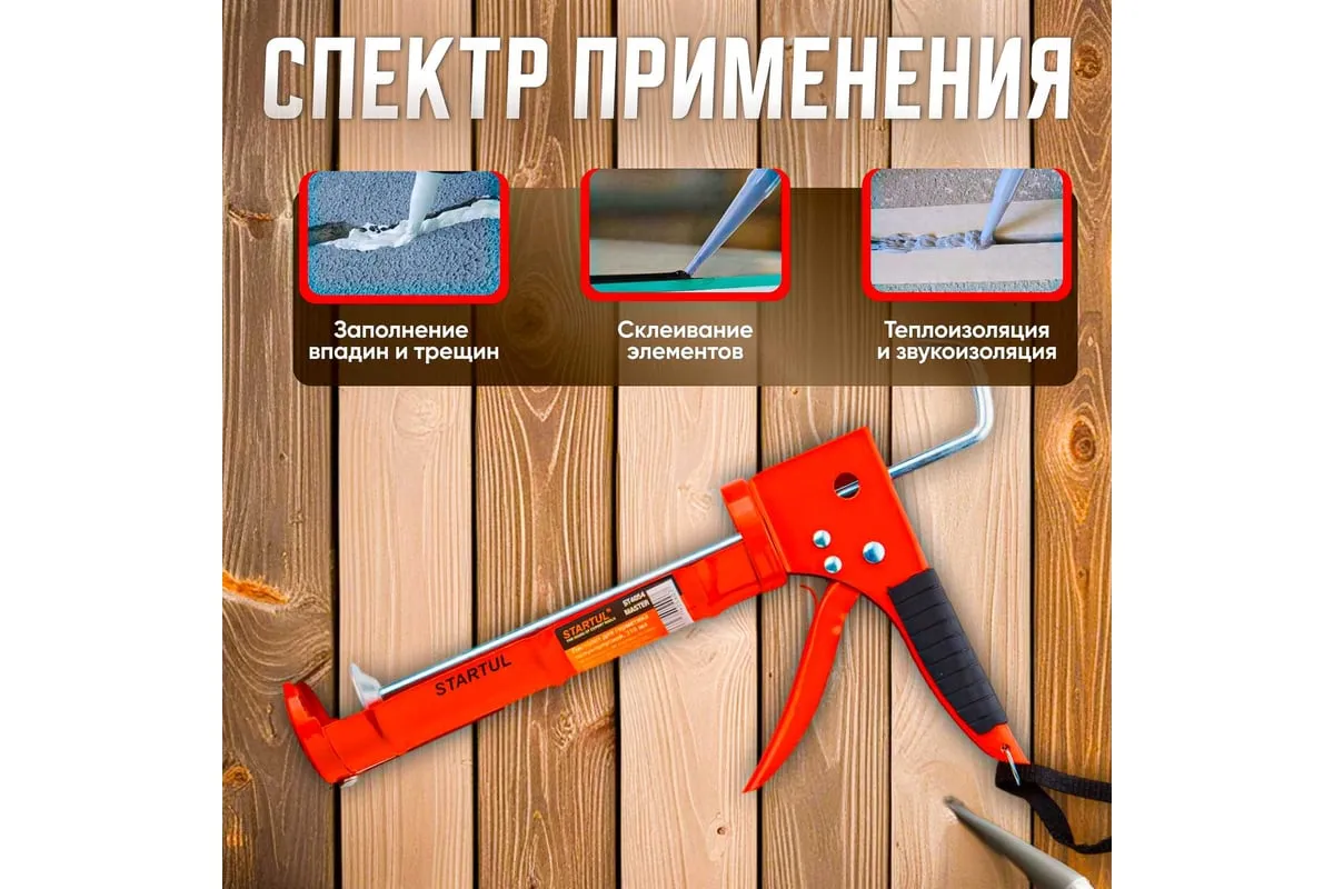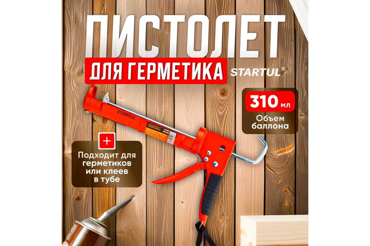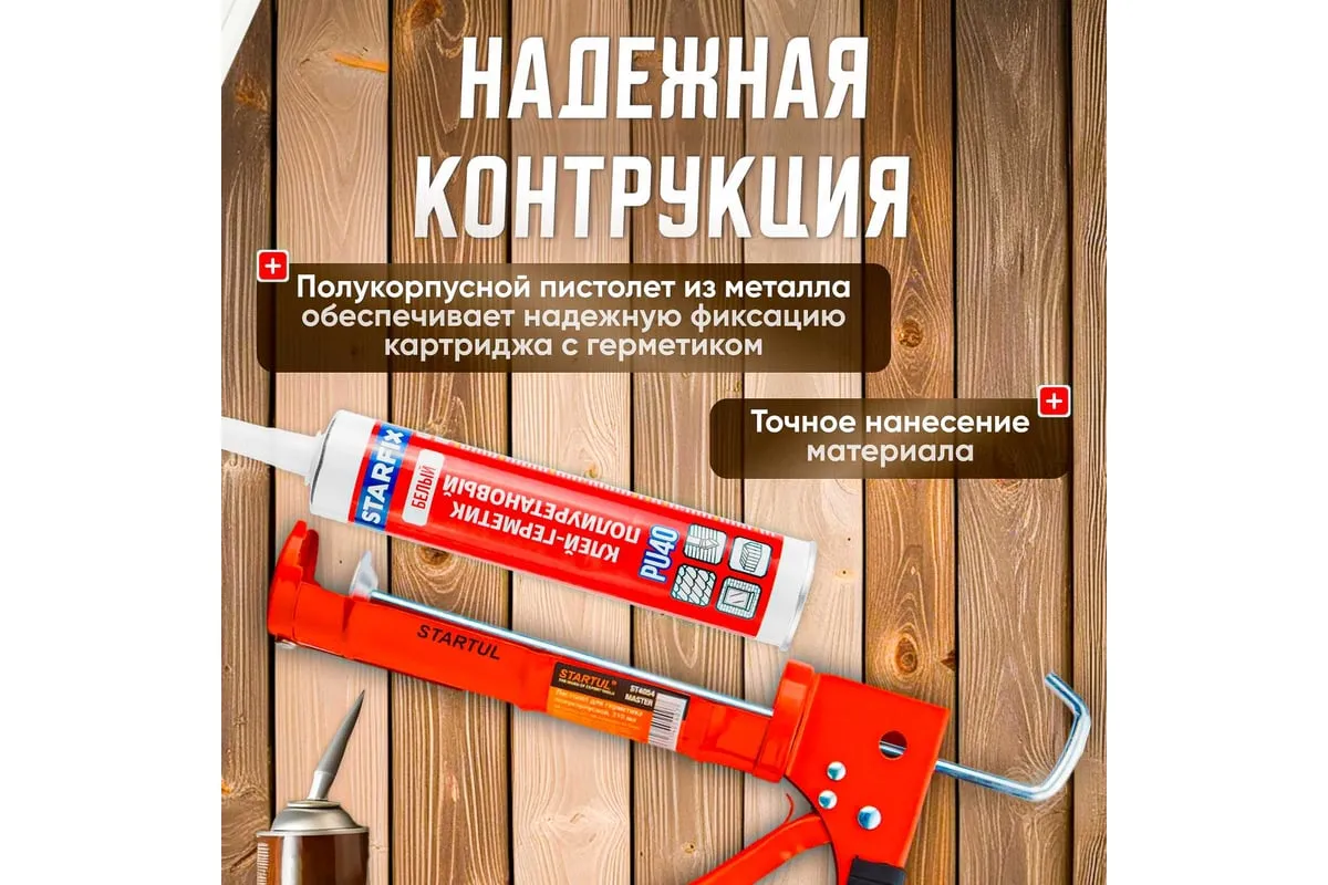 Полукорпусной пистолет для герметика STARTUL 310 мл ST4054 предназначен для выдавливания герметика из тубы и его нанесения в целях изоляции, фиксации и заполнения пустот.
