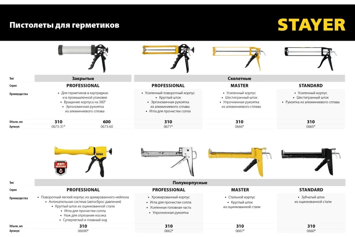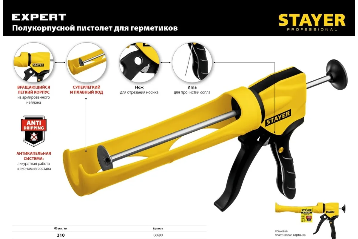 Полукорпусной пистолет для герметика Stayer Expert 310 мл 06690 подходит для работы с картриджами объемом 310 мл. Имеет полуоткрытый вращающийся корпус. Круглый шток из оцинкованной стали и конструкция из армированного нейлона обеспечиваютдолгий срок службы. Модель снабжена иглой для удаления застывшего герметика/клея и встроенным резаком для сопла.