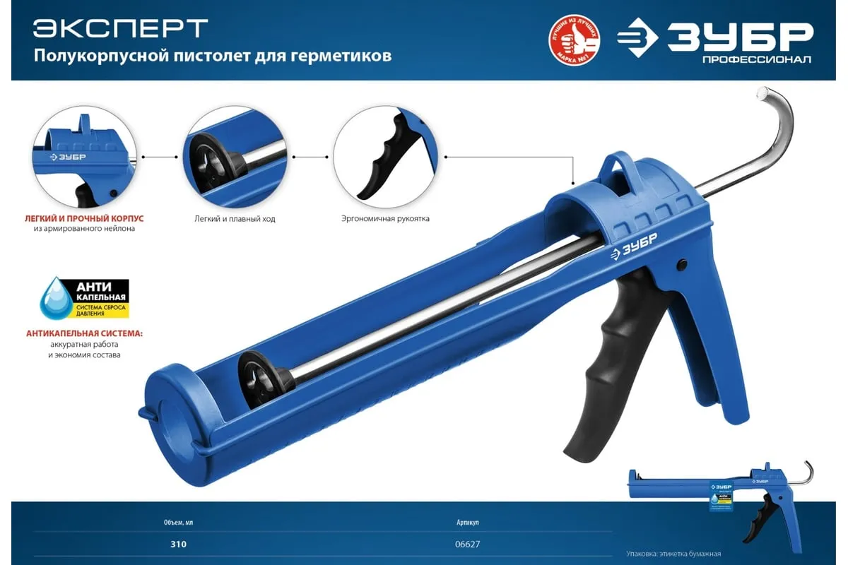 Полукорпусной пистолет для герметика Зубр 310 мл, Профессионал 06627 позволяетбыстро и точно нанестисмесь на строительную поверхность. Подходит для работы с картриджами объемом 310 мл. Имеет прочный корпус из армированного нейлона, что гарантируетдолгий срок службы.