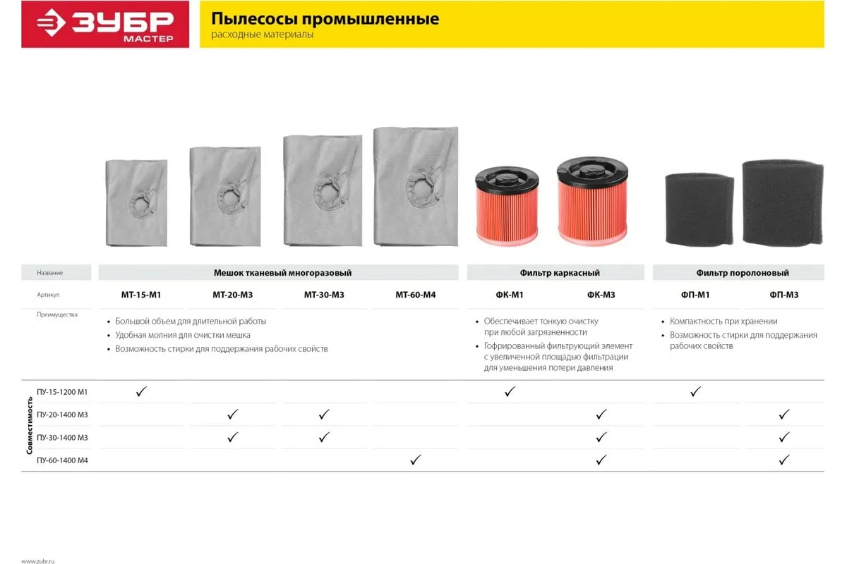 Фильтр для пылесосов поролоновый ЗУБР ФП-М1 защищает двигатель от попадания частиц грязи при влажной уборке. Фильтр можно промывать для поддержания его рабочего состояния. Подходит к следующим моделям: * ЗубрПУ-15-1200 М1