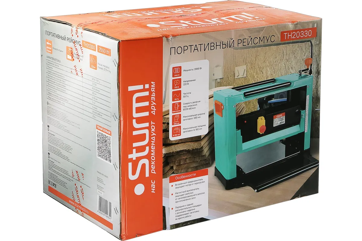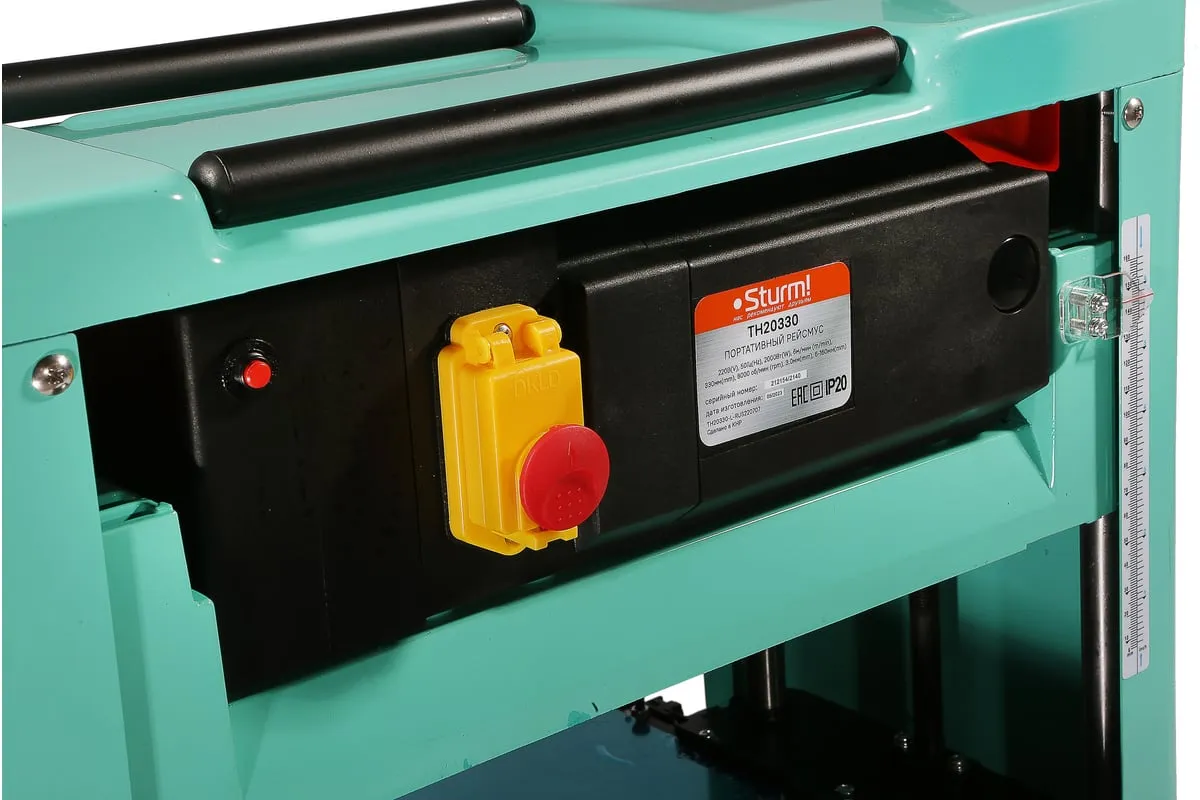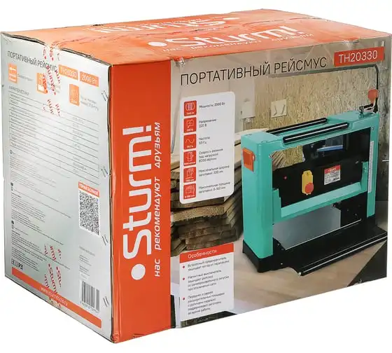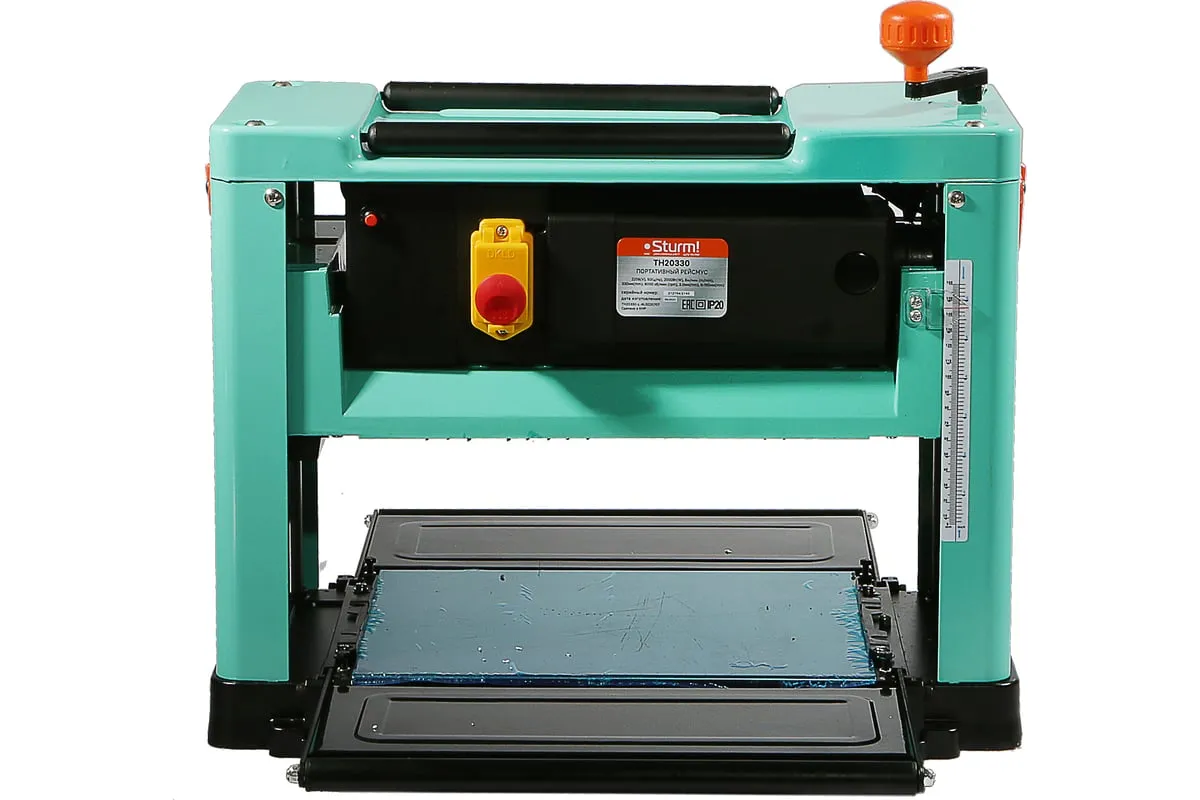 Портативный рейсмус Sturm TH20330 используется для строгания деревянных заготовок шириной до 330 мм. Рейсмус оснащен двумя удлинителями стола, оснащенными специальными роликами для облегчения подачи габаритных заготовок и их поддержки на входе и выходе. Электромагнитный выключатель обеспечивает дополнительную безопасность и исключает риск случайного включения при перебоях в электросети. Надежная ременная конструкция привода строгального барабана и цепная конструкция привода автоподачи увеличивают общий срок службы станка. Станок оснащен боковыми рукоятками для удобства переноски в рабочей зоне. Ножи из быстрорежущей стали HSS подходят для обработки пород древесины разной степени твердости.
