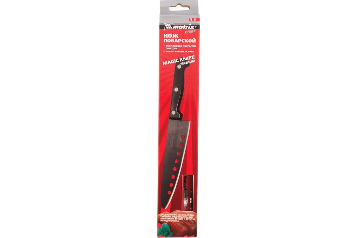 Поварской нож MATRIX MAGIC KNIFE medium 79114 применяется для нарезания любых продуктов, например, мясо или овощи. Лезвие отфрезеровано и изготовлено из нержавеющей стали. Тефлоновое покрытие полотна и технологические отверстия исключают прилипание пищи к рабочей поверхности. Эргономичная рукоять с протектором для пальцев обеспечивает надежный и безопасный захват.